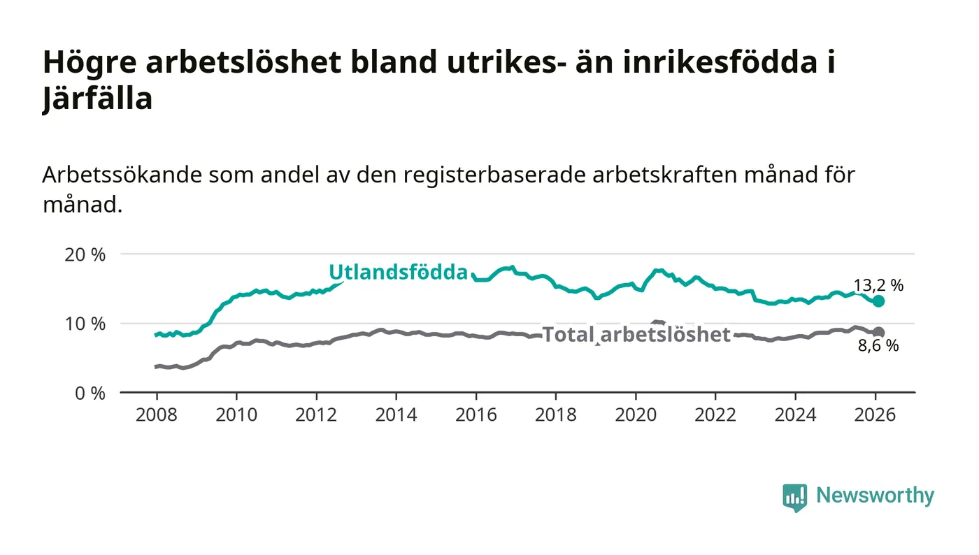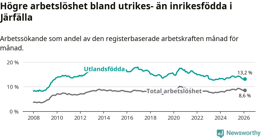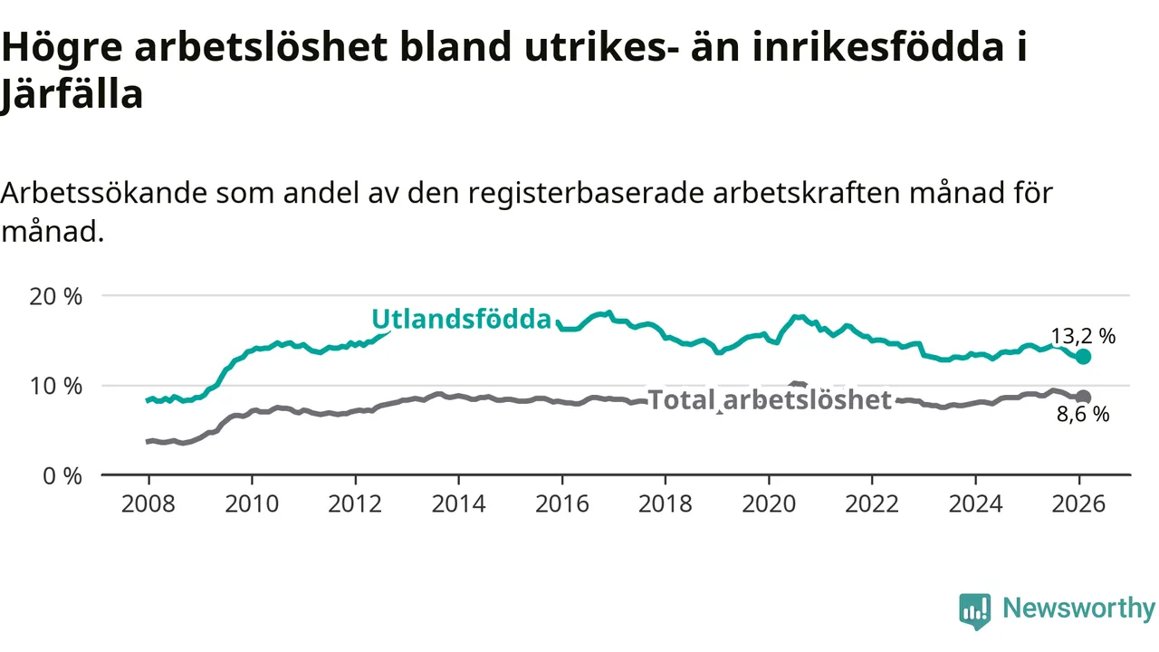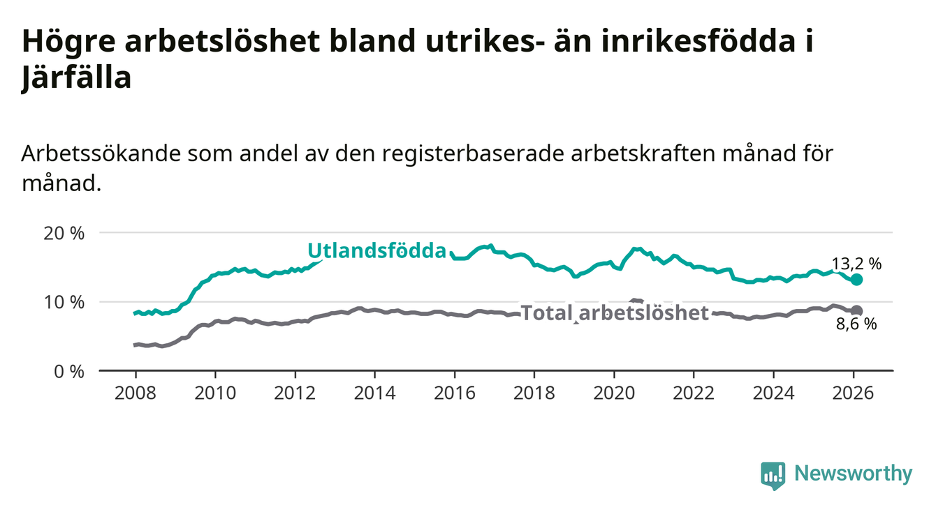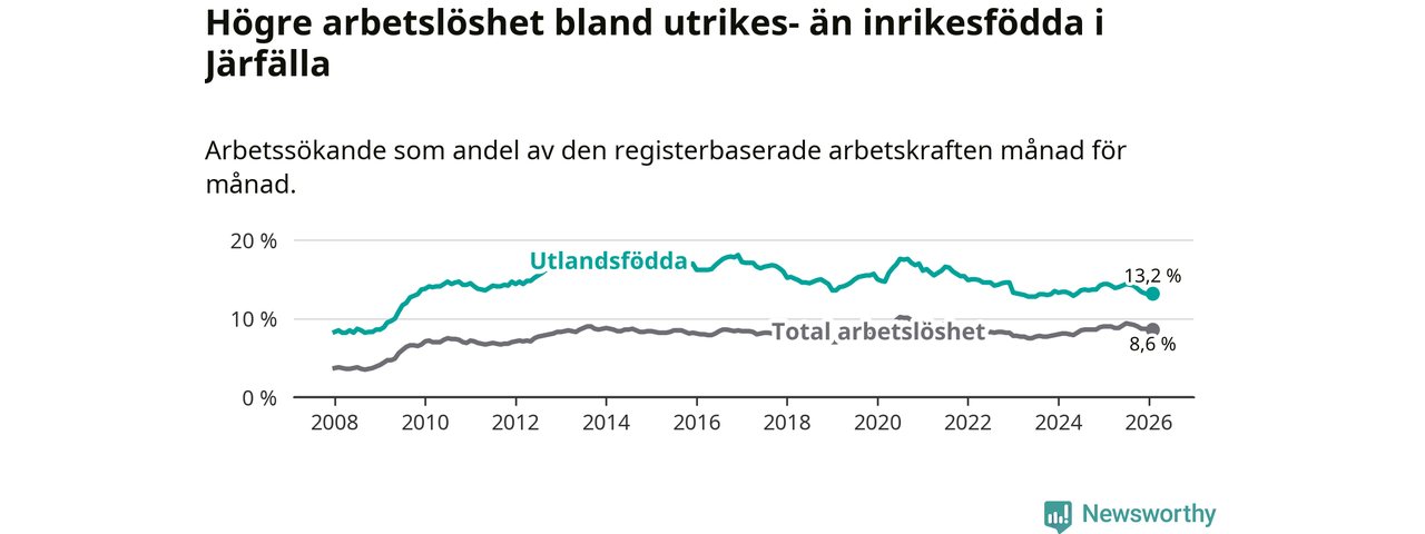 Arbetslösheten bland utlandsfödda var 13,2 procent i Järfälla under februari månad, motsvarande 2 866 av 21 712 personer. Det är 1,2 procentenheter färre än vid samma tidpunkt i fjol (−73 om man räknar personer).
