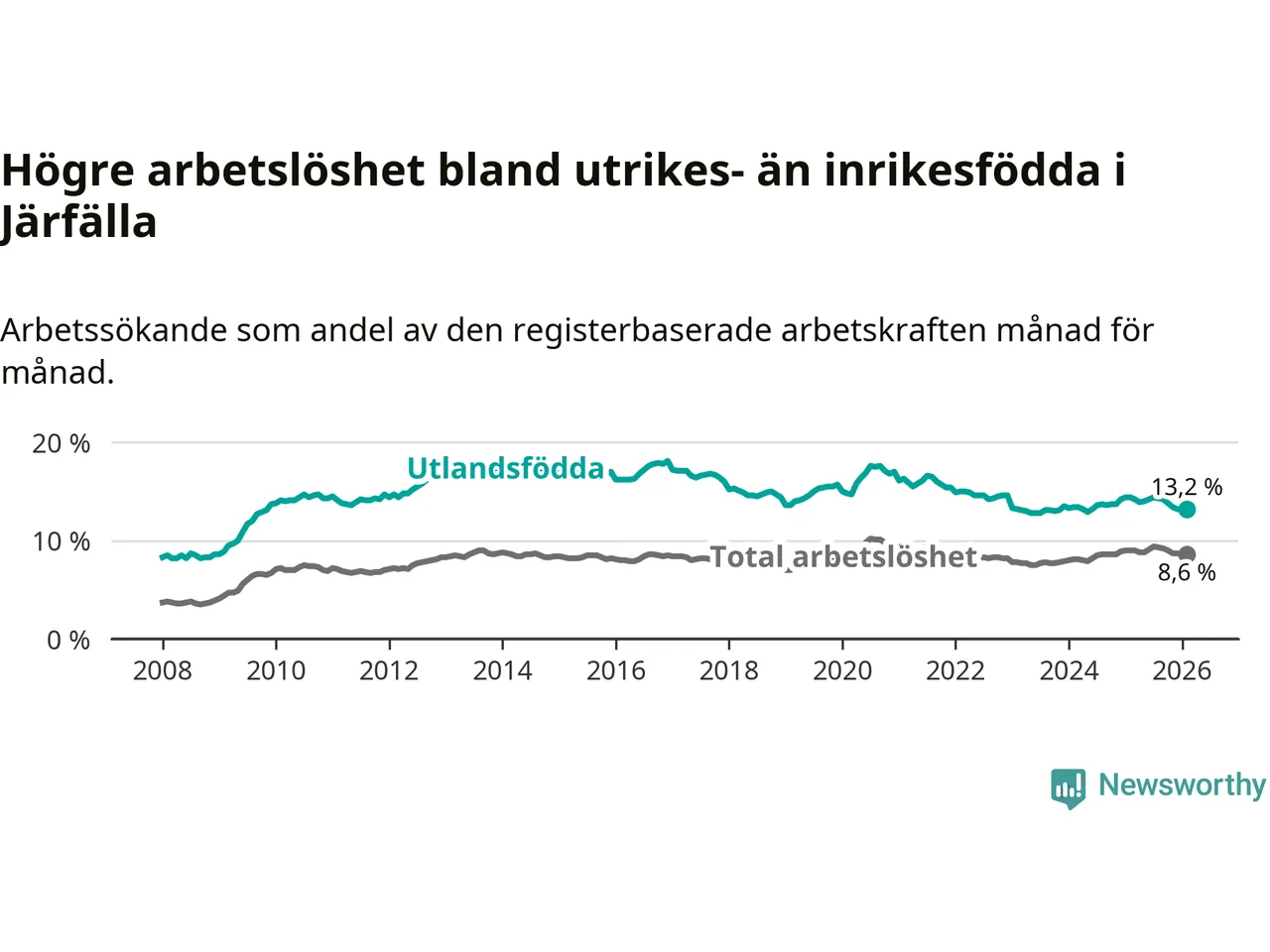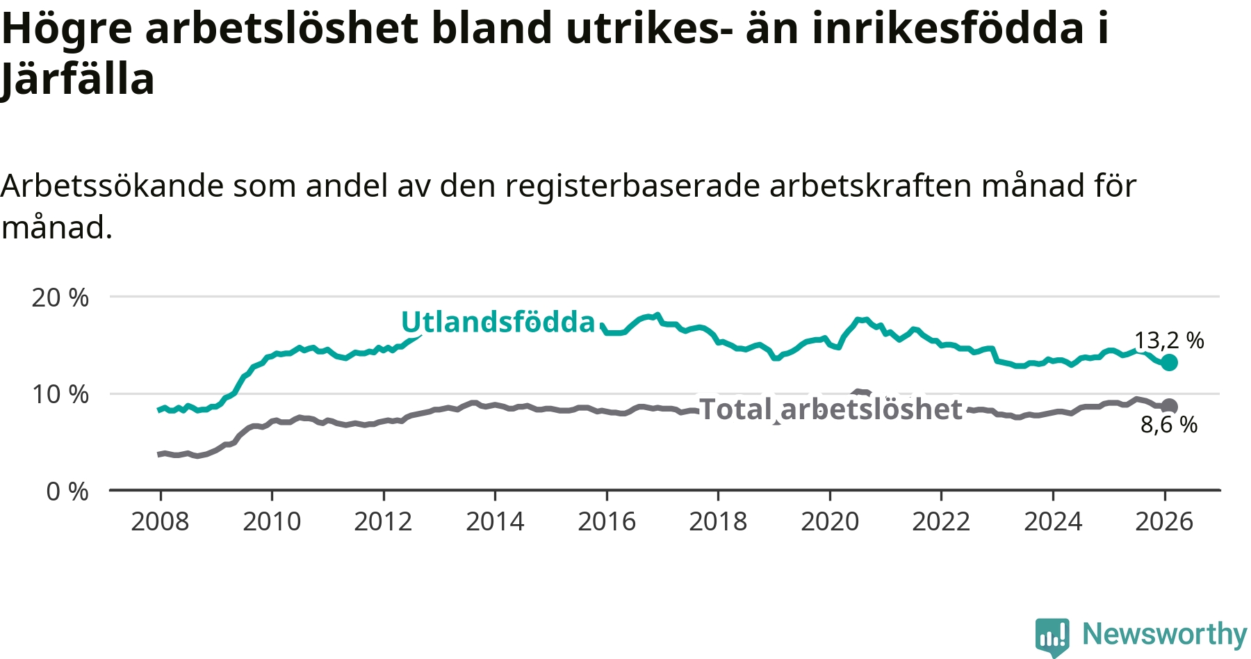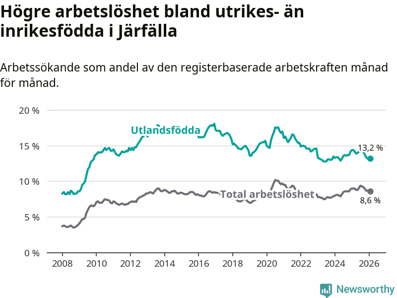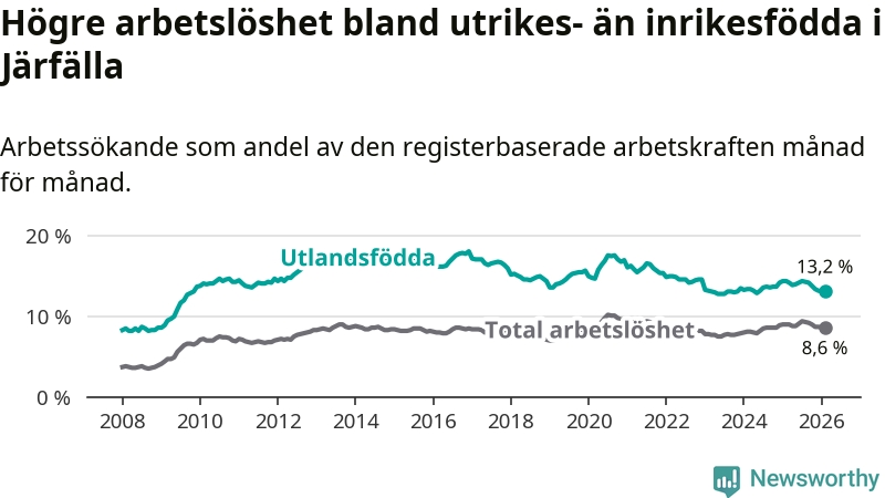 Arbetslösheten bland utlandsfödda var 13,2 procent i Järfälla under februari månad, motsvarande 2 866 av 21 712 personer. Det är 1,2 procentenheter färre än vid samma tidpunkt i fjol (−73 om man räknar personer).