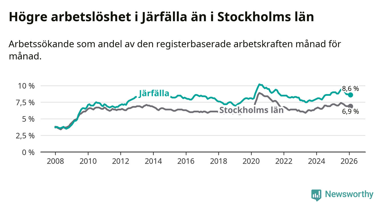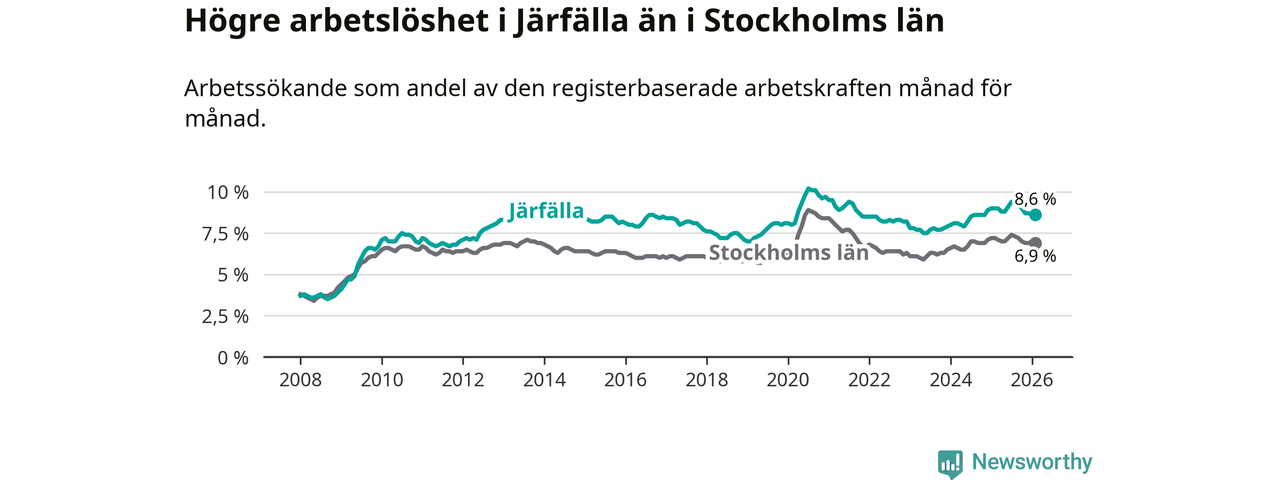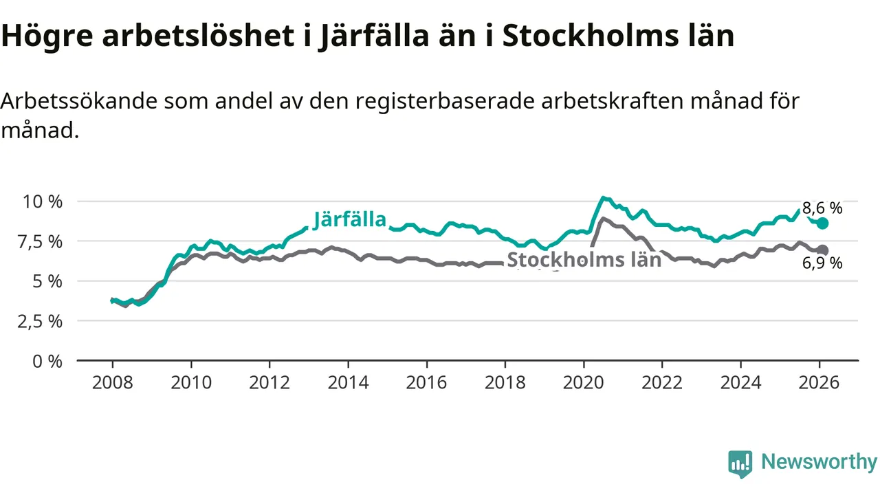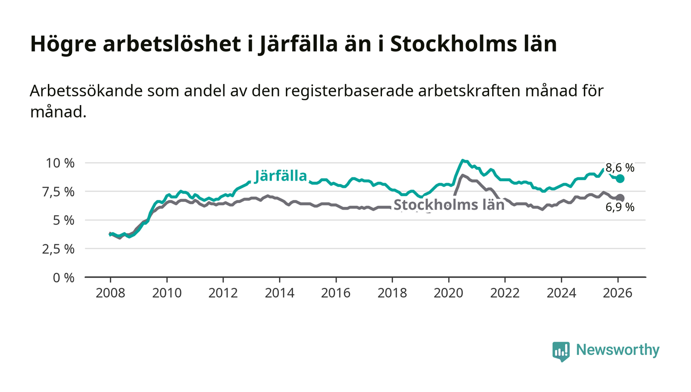 Under februari månad rapporterade Järfälla kommun en total arbetslöshet på 8,6 procent. Det är en minskning jämfört med samma tidpunkt i fjol (−0,4 procentenheter). Även i Stockholms län sjunker arbetslösheten .