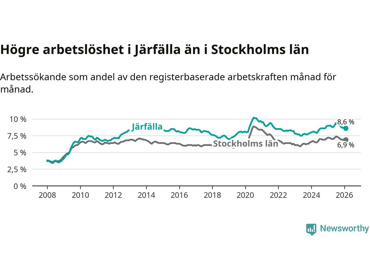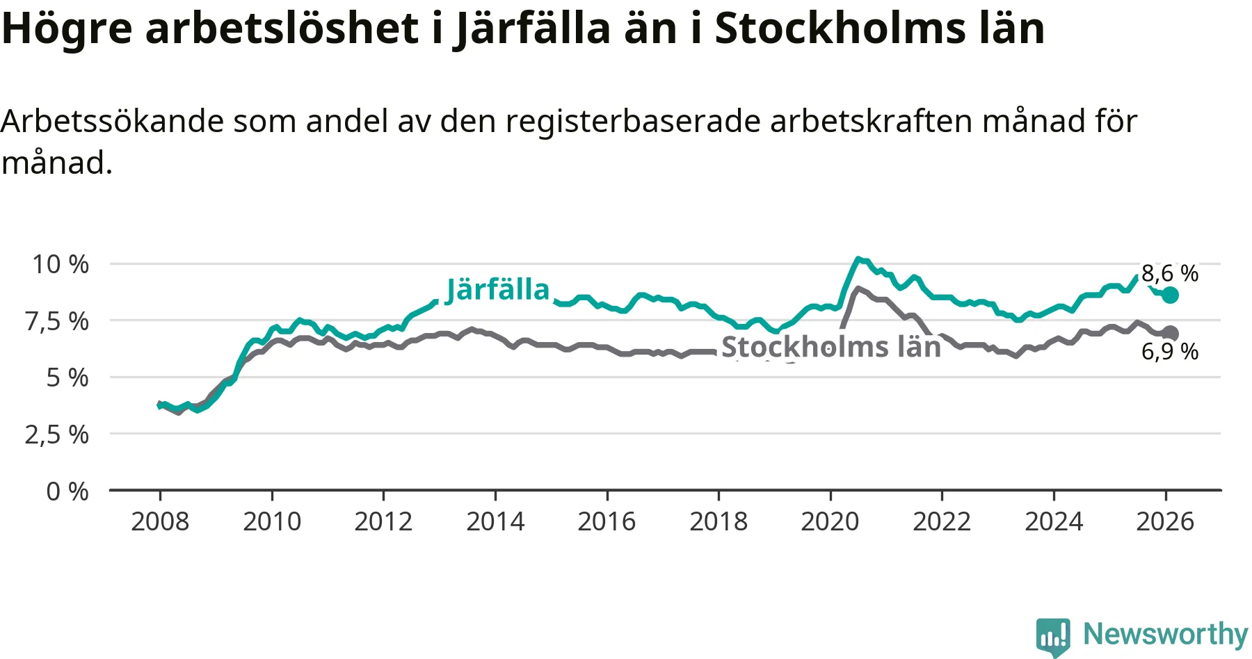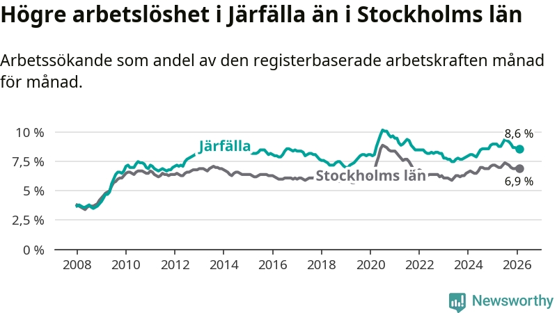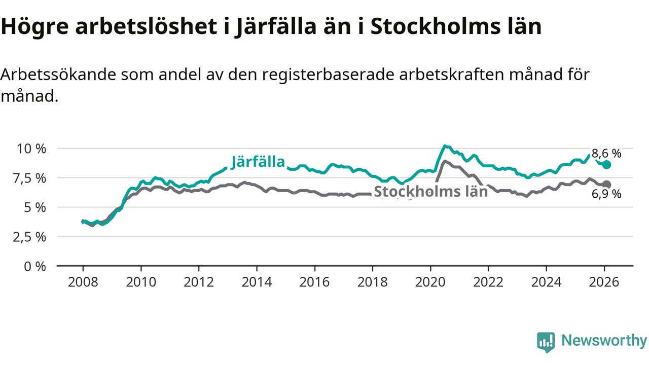 Under februari månad rapporterade Järfälla kommun en total arbetslöshet på 8,6 procent. Det är en minskning jämfört med samma tidpunkt i fjol (−0,4 procentenheter). Även i Stockholms län sjunker arbetslösheten .