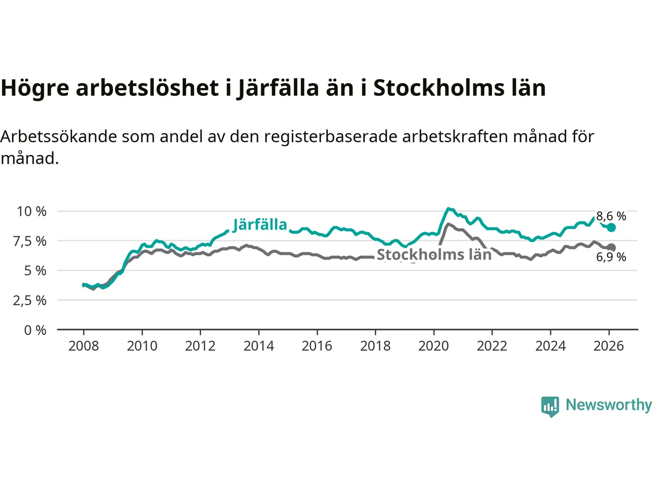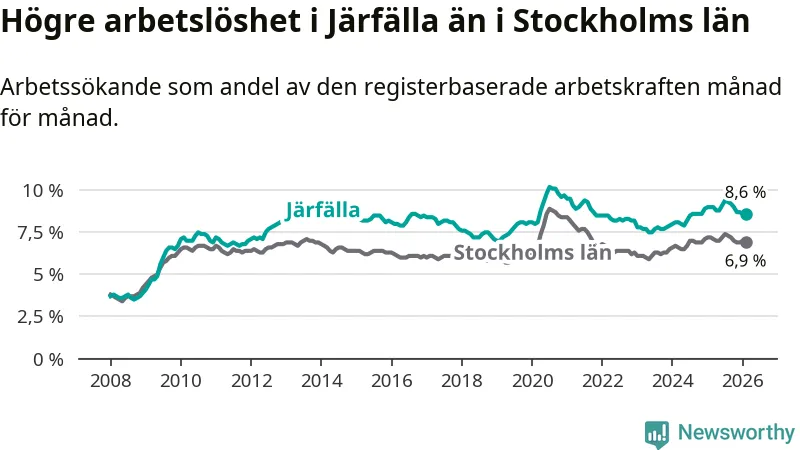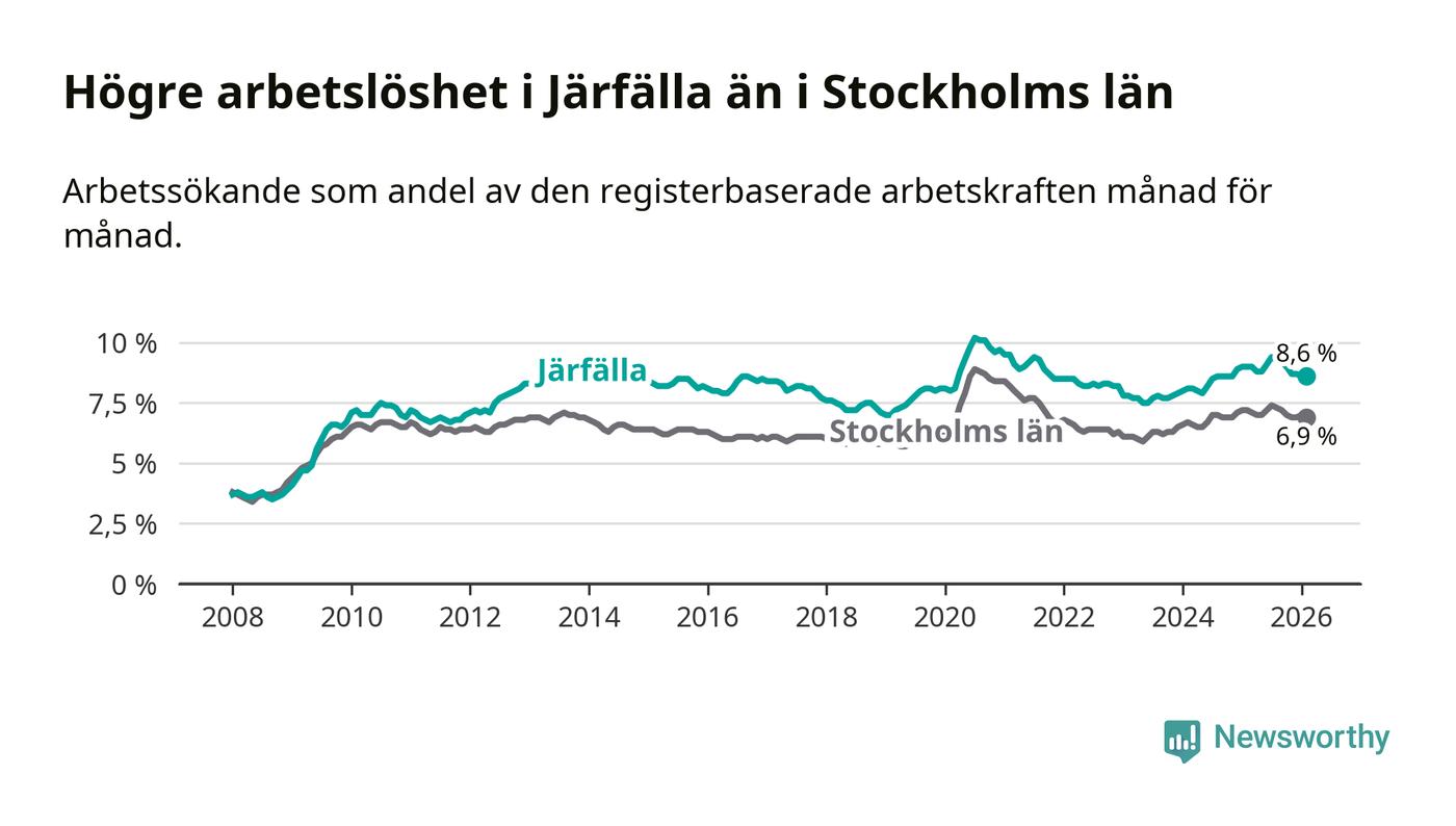 Även om arbetslösheten i Järfälla alltså minskar, så ligger den fortfarande över snittet i hela Stockholms län (8,6 procent i kommunen, jämfört med 6,9 procent i hela länet). Ekerö har den lägsta arbetslösheten i länet (3,7 procent), medan Södertälje har den högsta (10,8 procent). För att Järfälla skulle komma ner i samma arbetslöshetsnivå som Ekerö skulle 2 330 personer behöva sysselsättas.