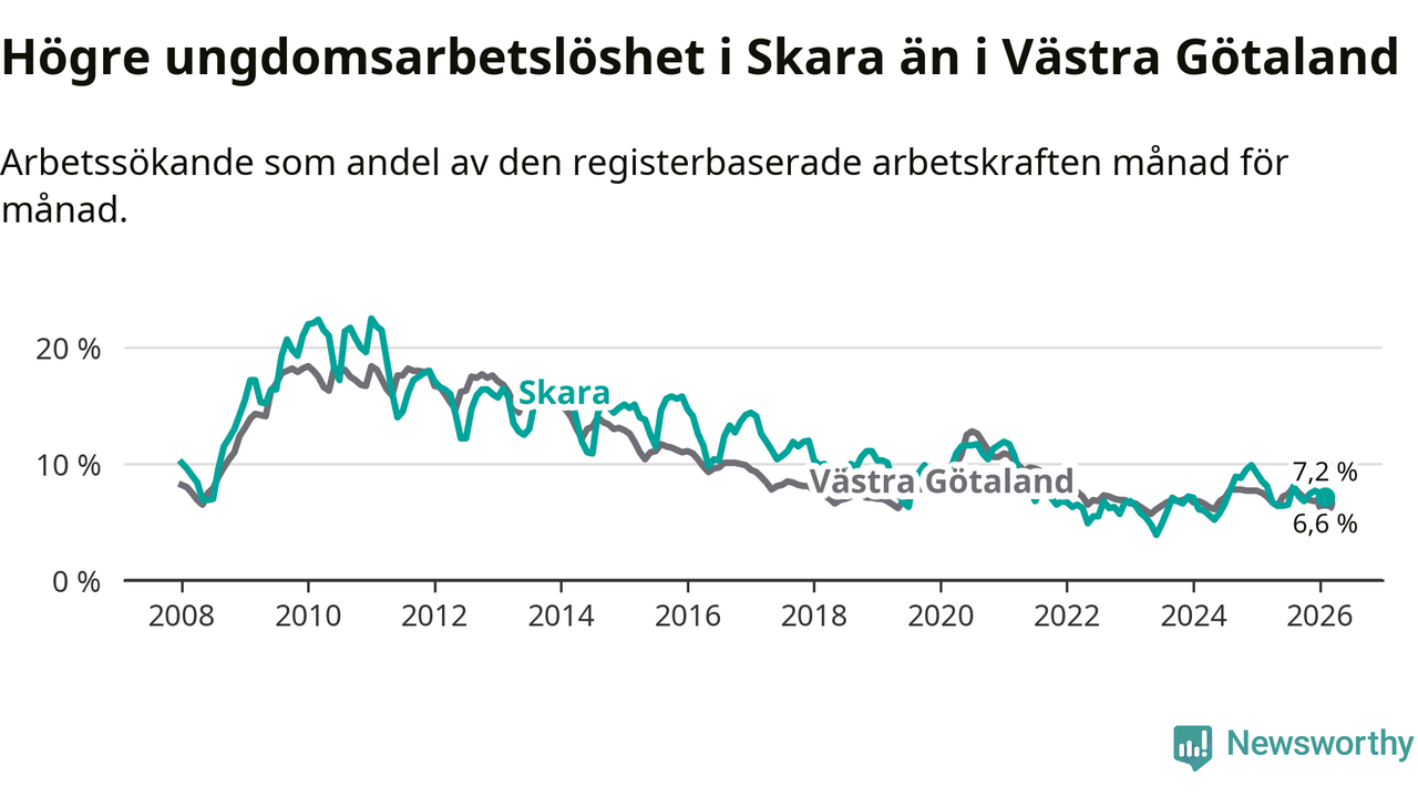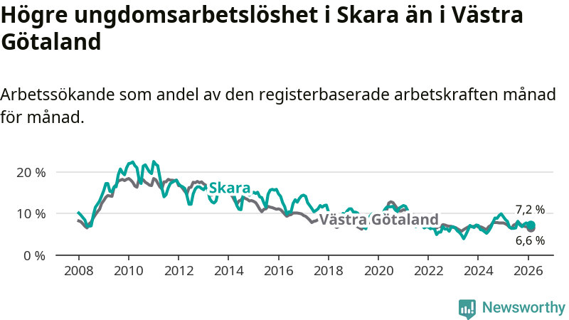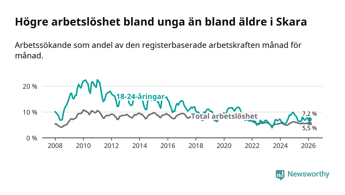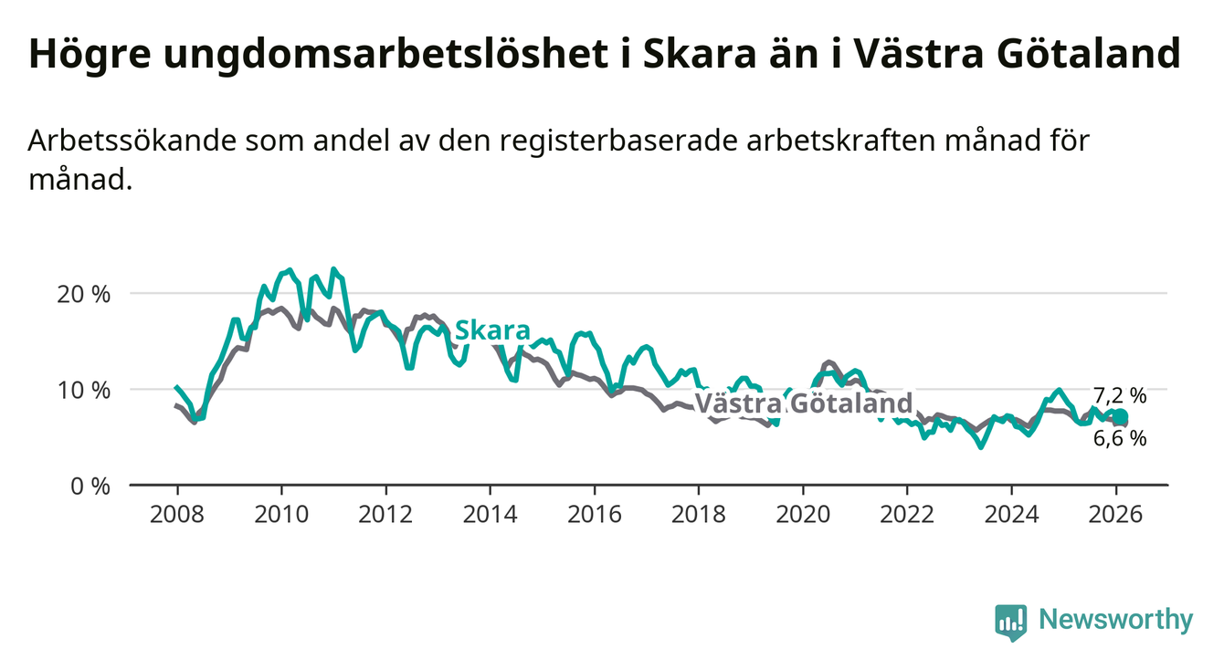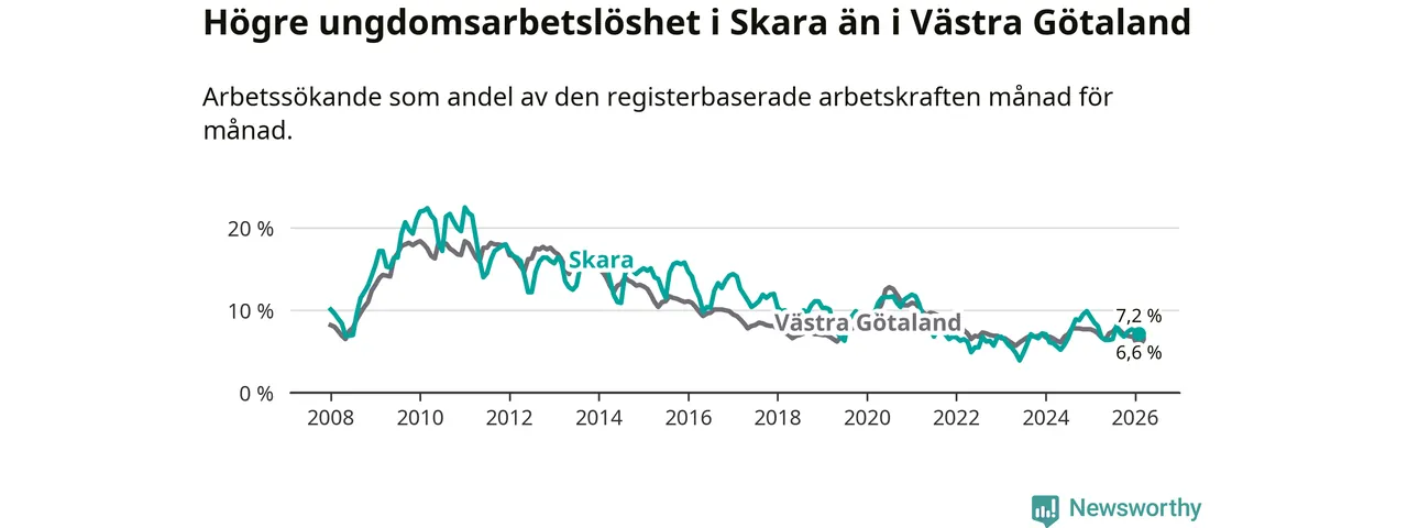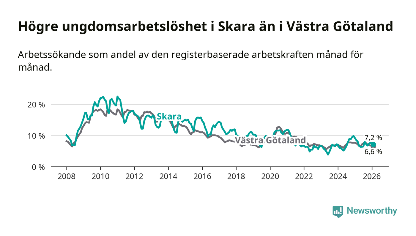 Medan Skara har lägre total arbetslöshet än Västra Götaland, ligger ungdomsarbetslösheten 0,6 procentenheter högre i Skara.