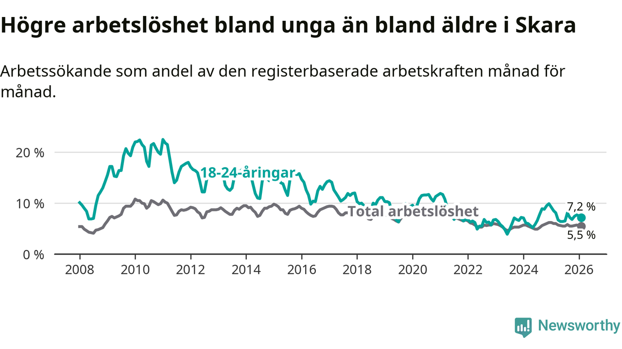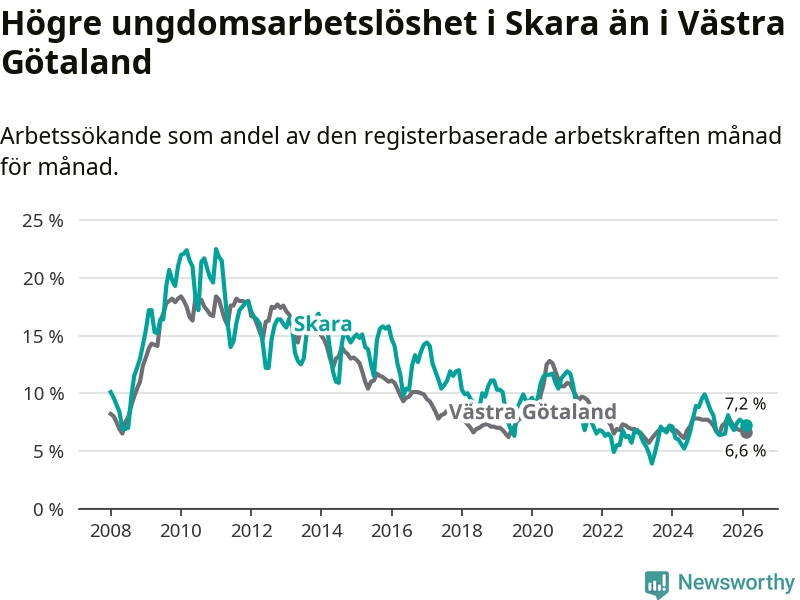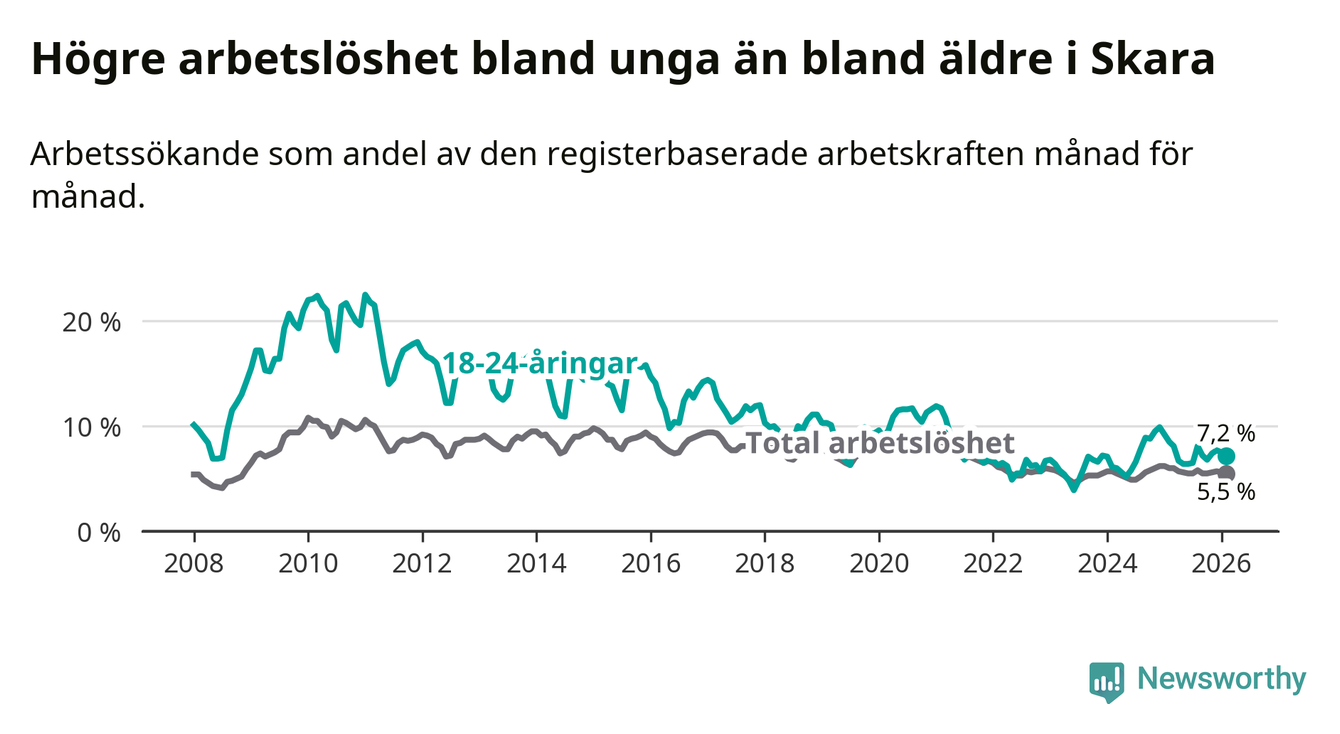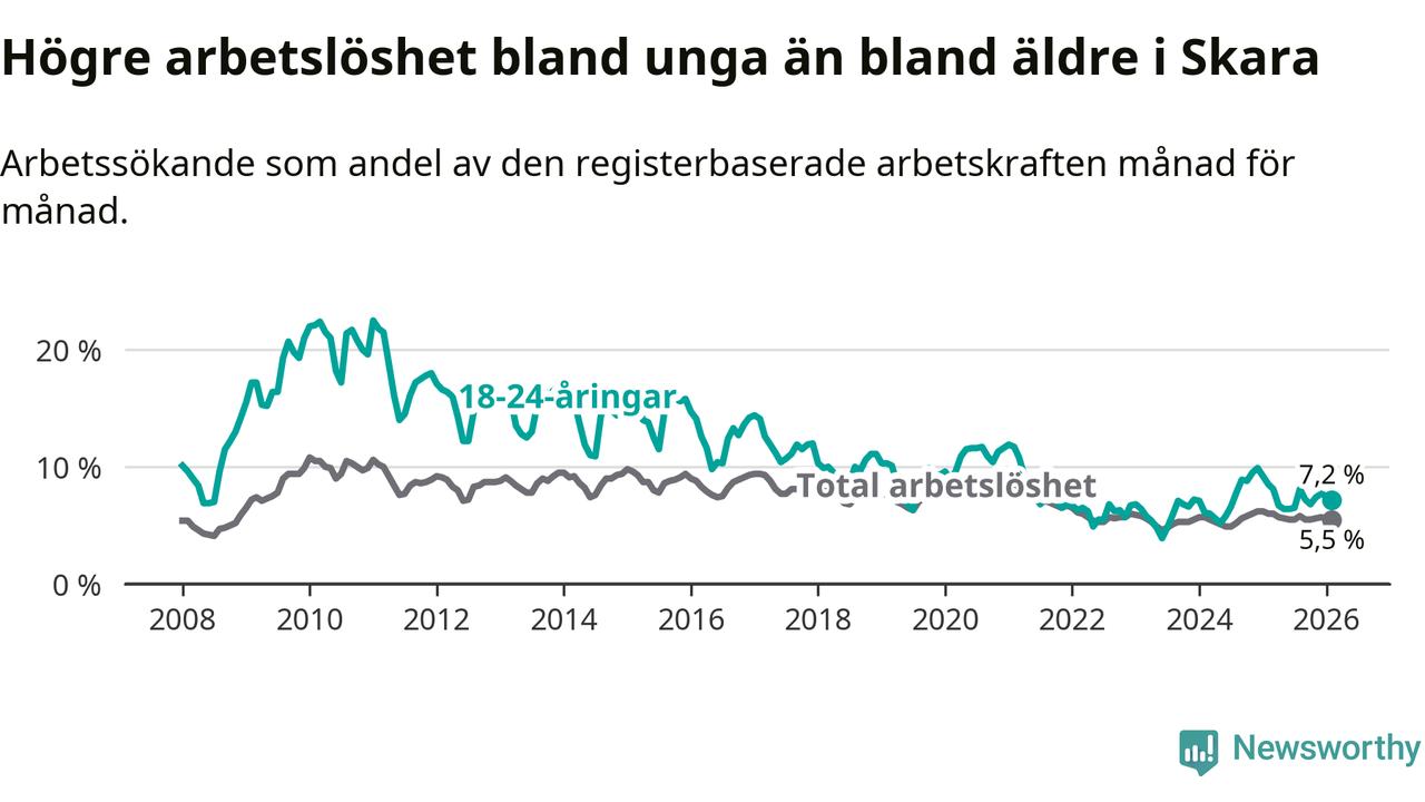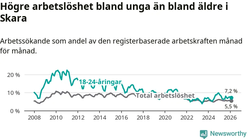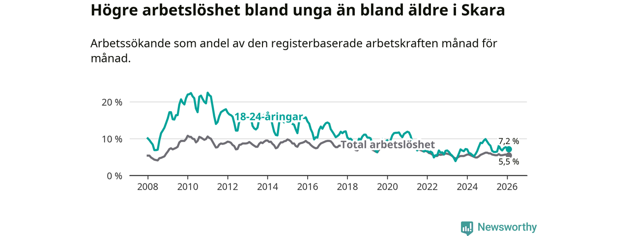 Medan Skara har lägre total arbetslöshet än Västra Götaland, ligger ungdomsarbetslösheten 0,6 procentenheter högre i Skara.