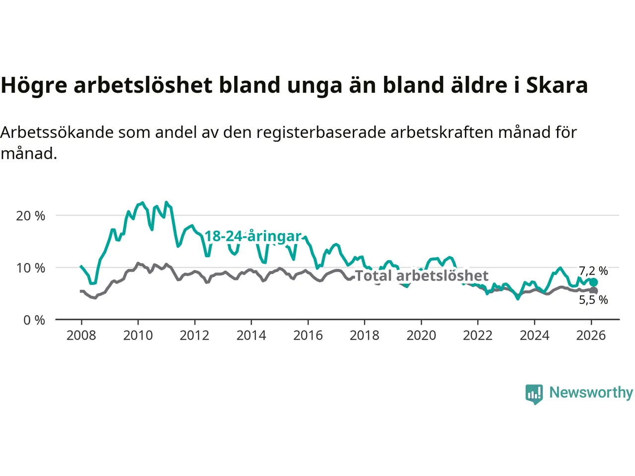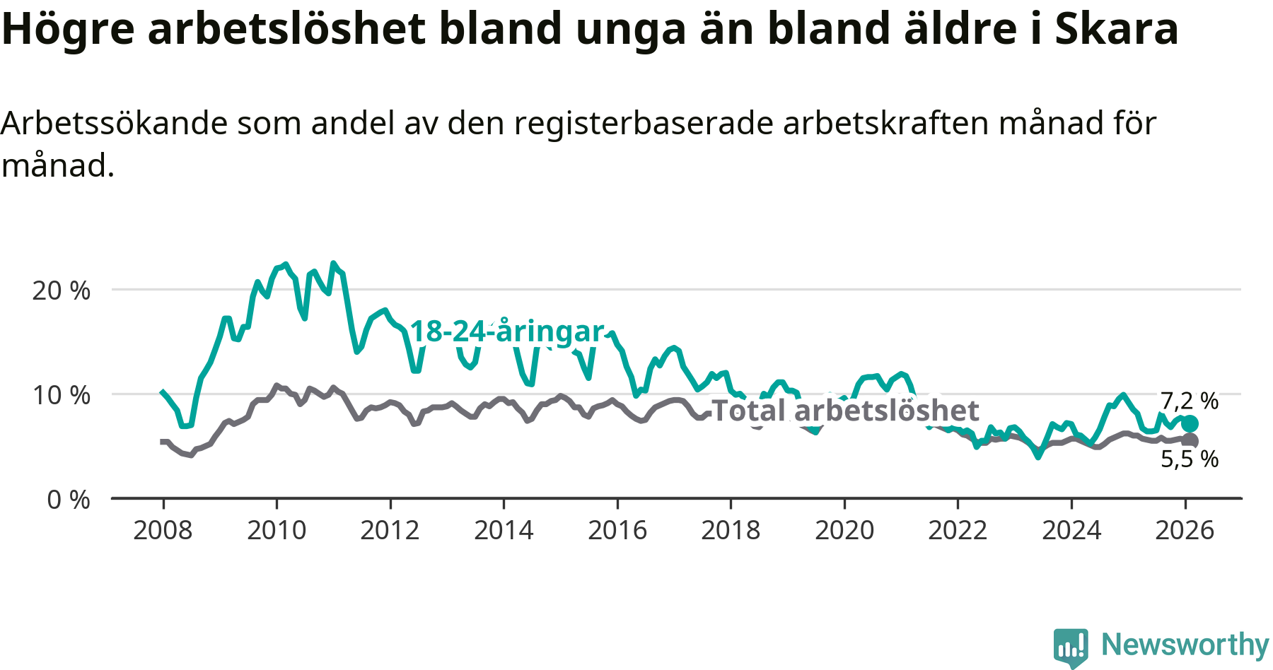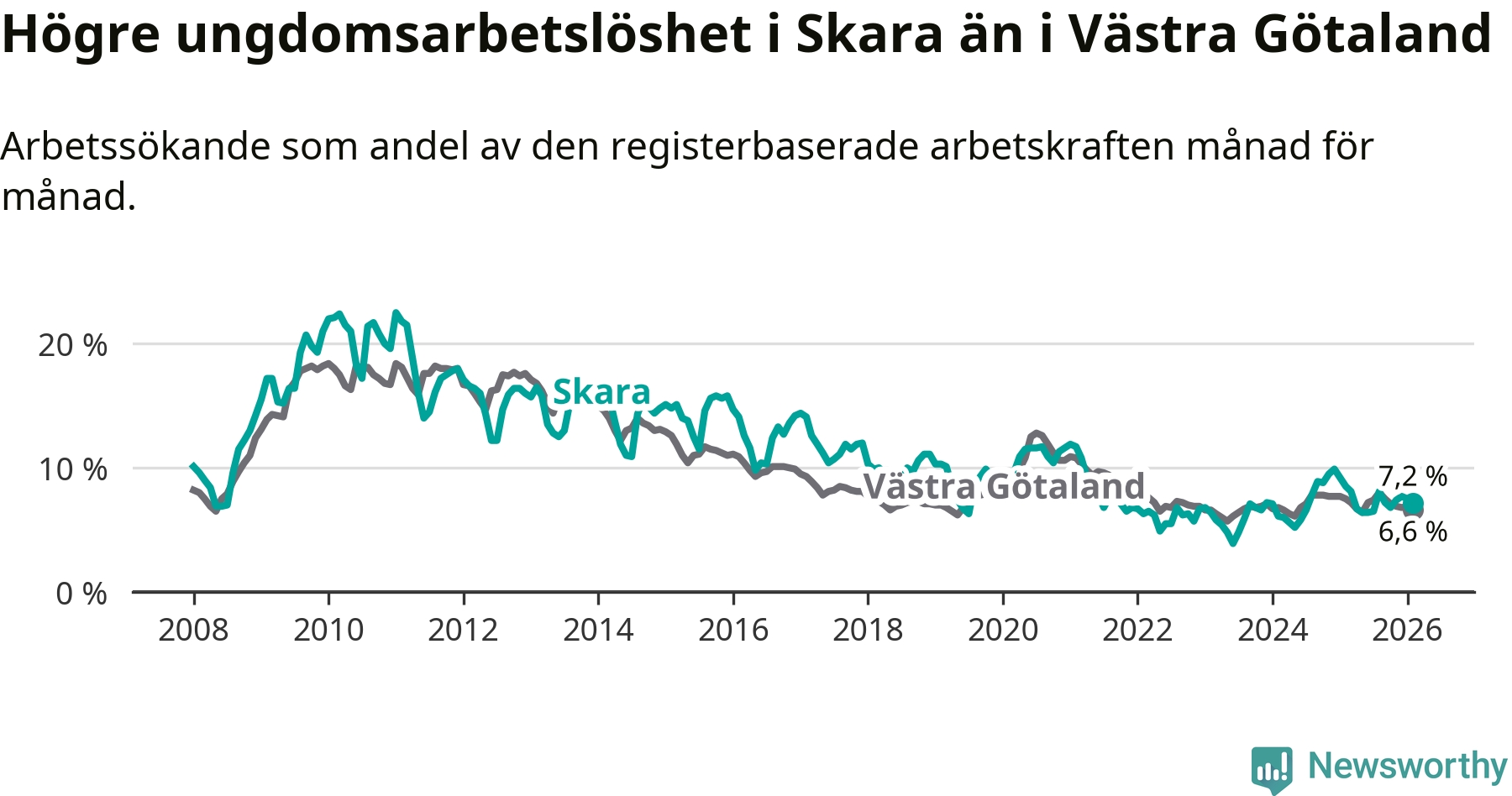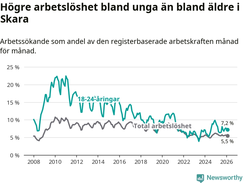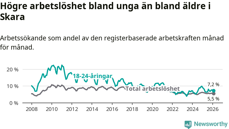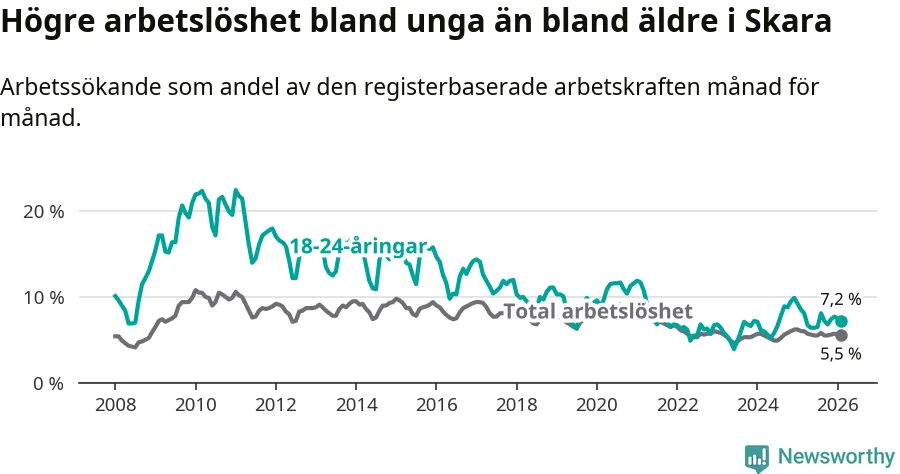 Medan Skara har lägre total arbetslöshet än Västra Götaland, ligger ungdomsarbetslösheten 0,6 procentenheter högre i Skara.