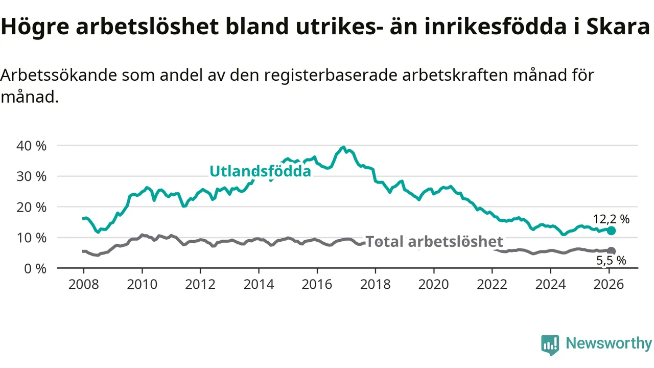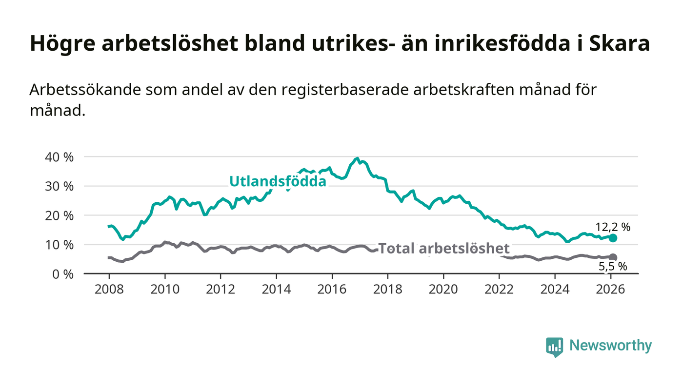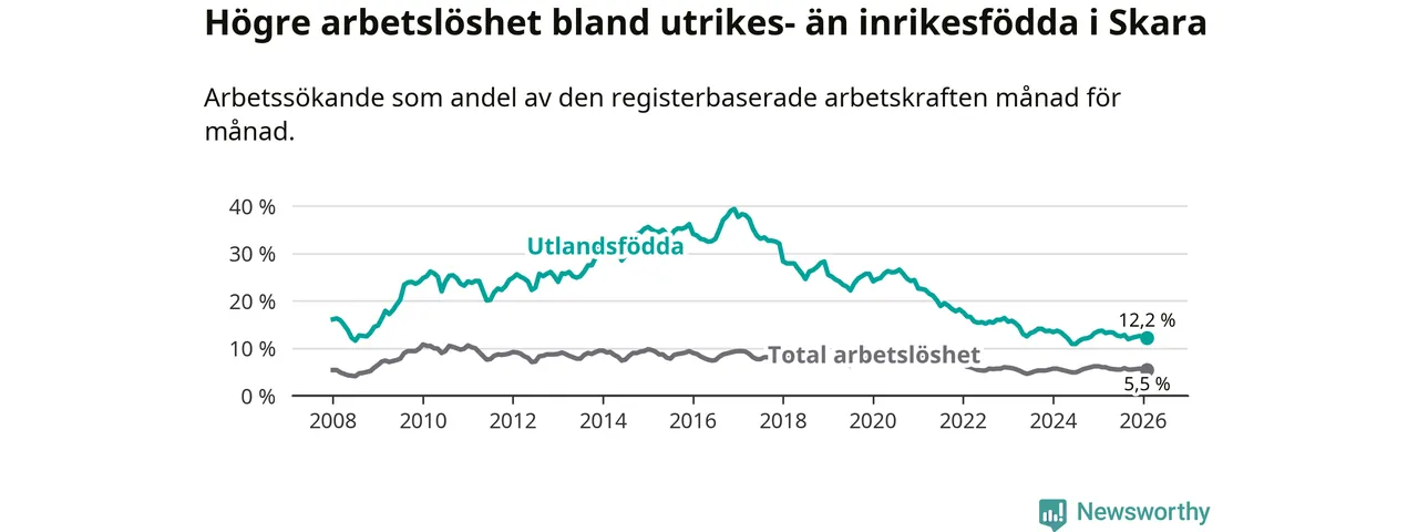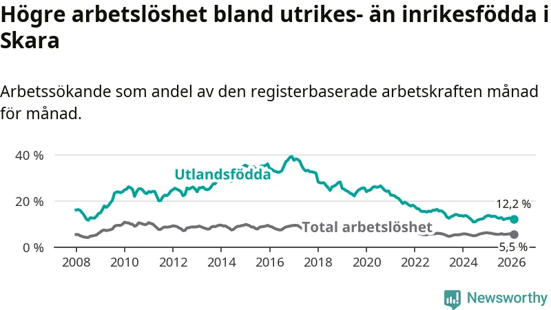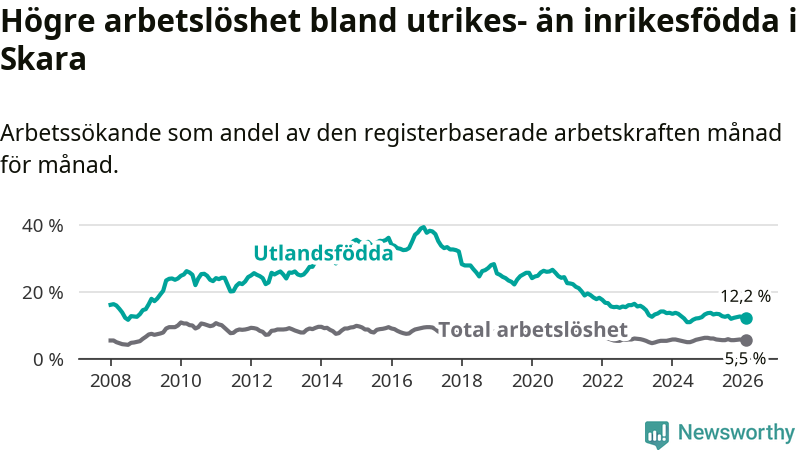 Arbetslösheten bland utlandsfödda var 12,2 procent i Skara under februari månad, motsvarande 242 av 1 984 personer. Det är 1,5 procentenheter färre än vid samma tidpunkt i fjol (−22 om man räknar personer).
