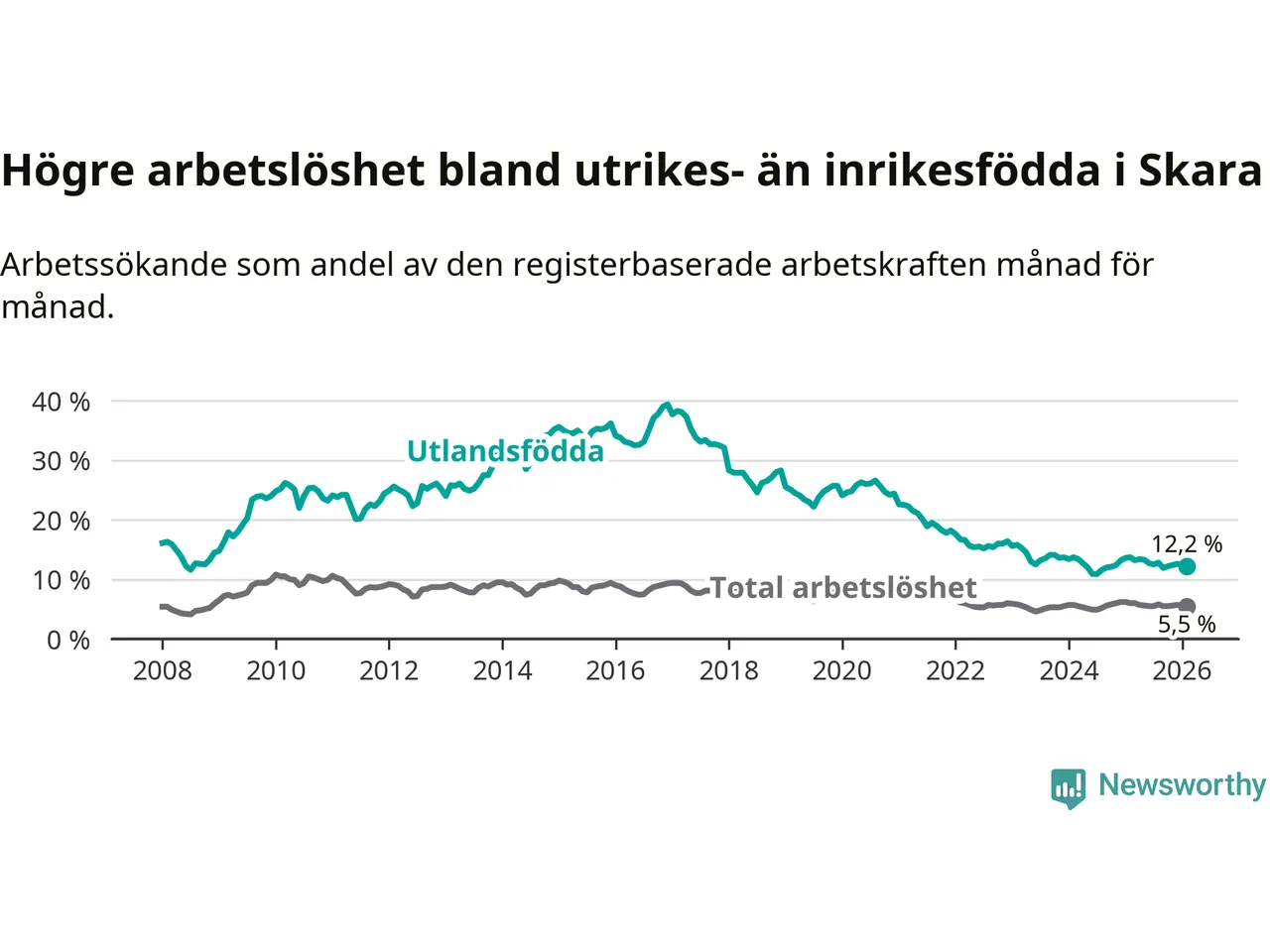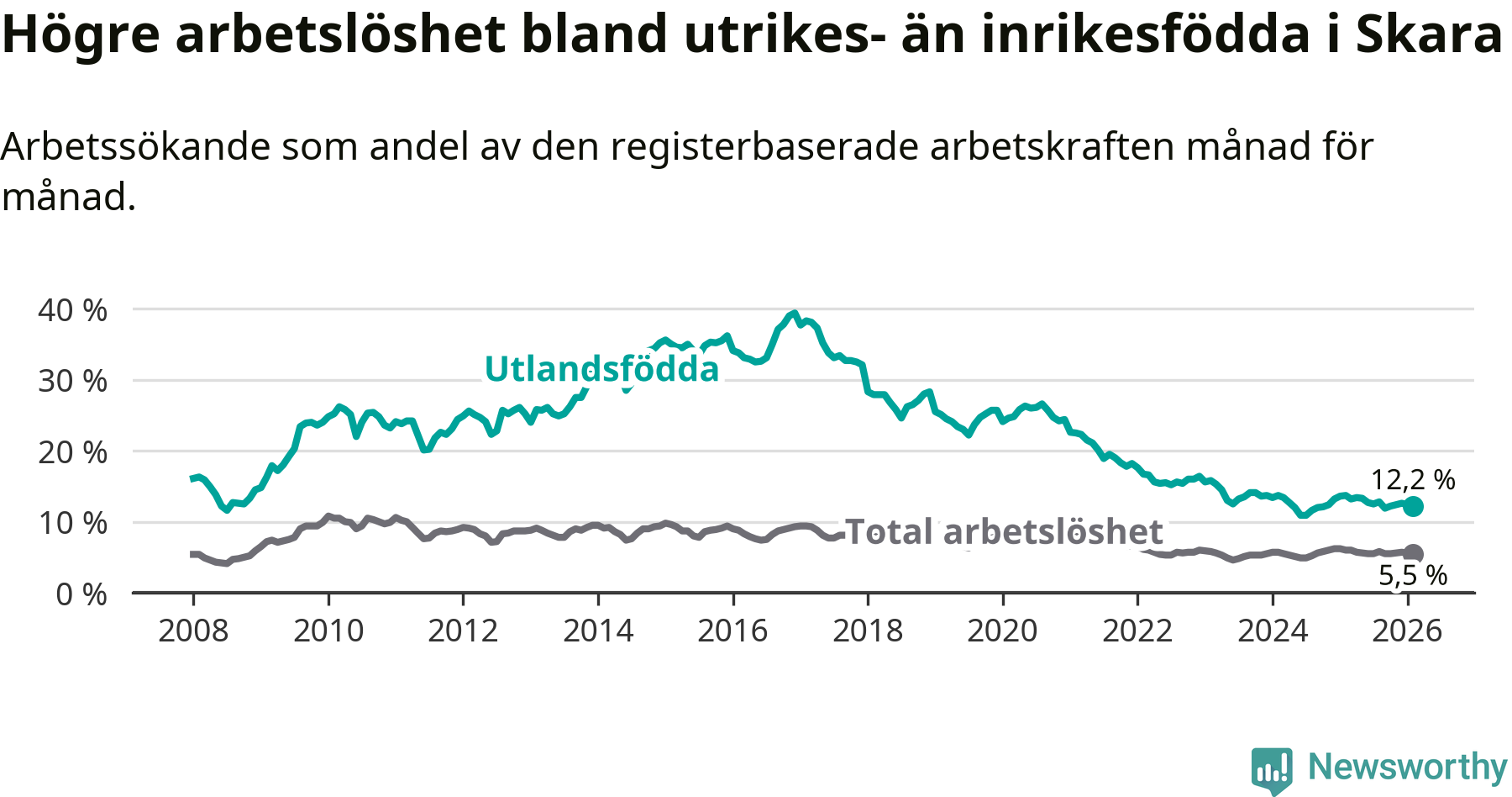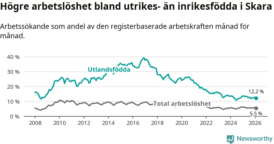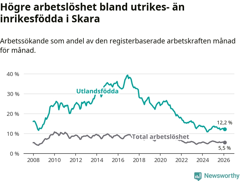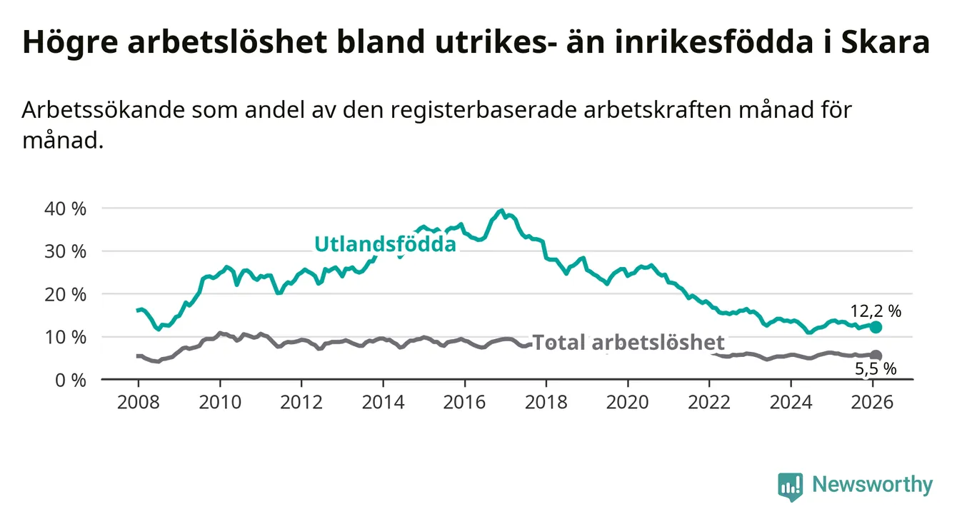 Arbetslösheten bland utlandsfödda var 12,2 procent i Skara under februari månad, motsvarande 242 av 1 984 personer. Det är 1,5 procentenheter färre än vid samma tidpunkt i fjol (−22 om man räknar personer).