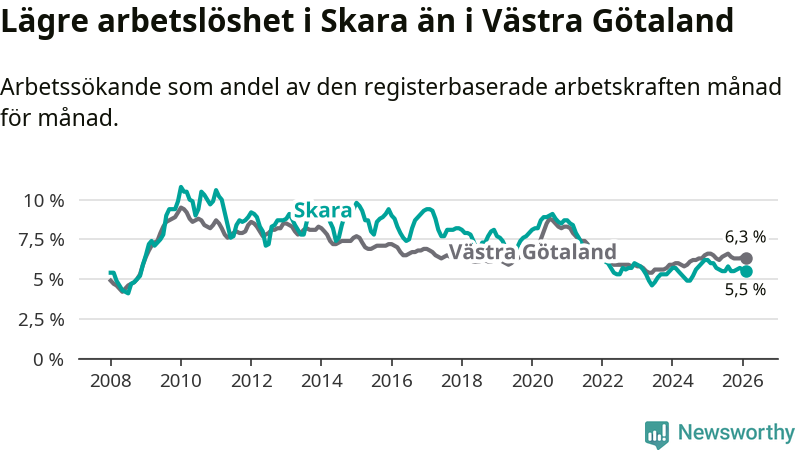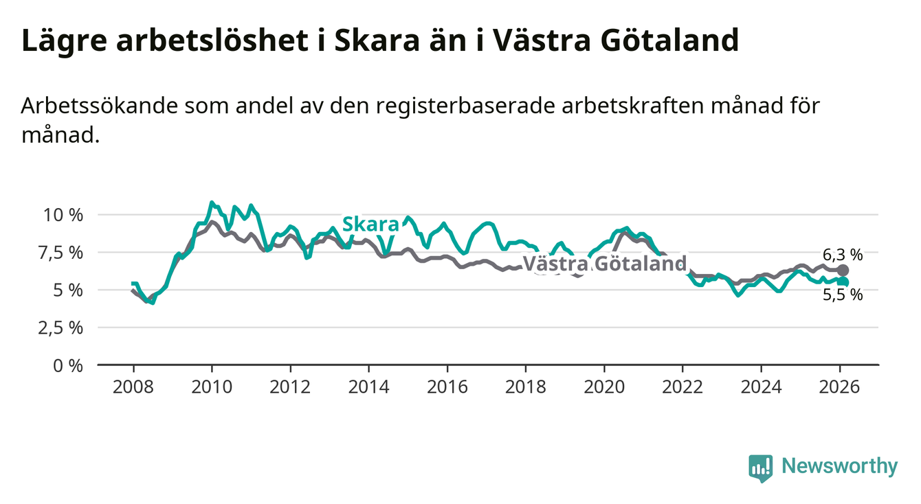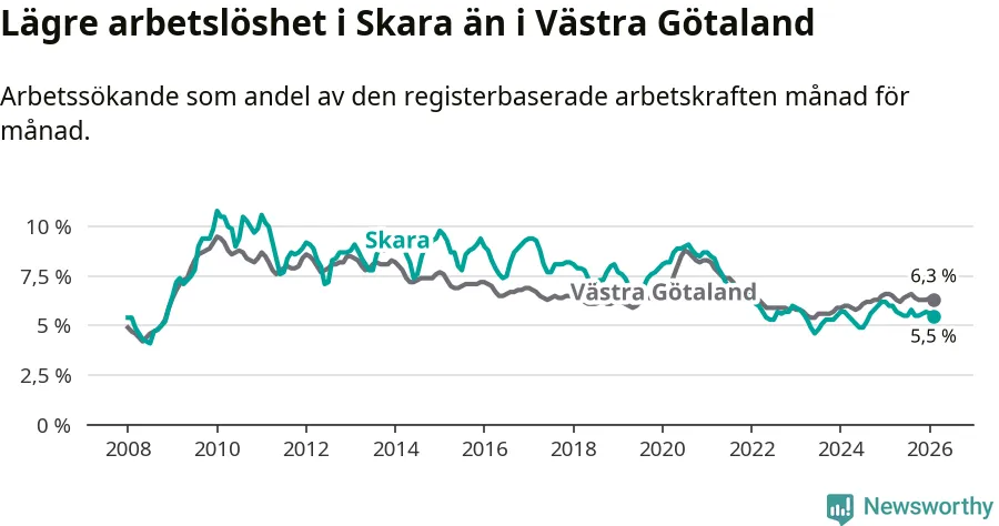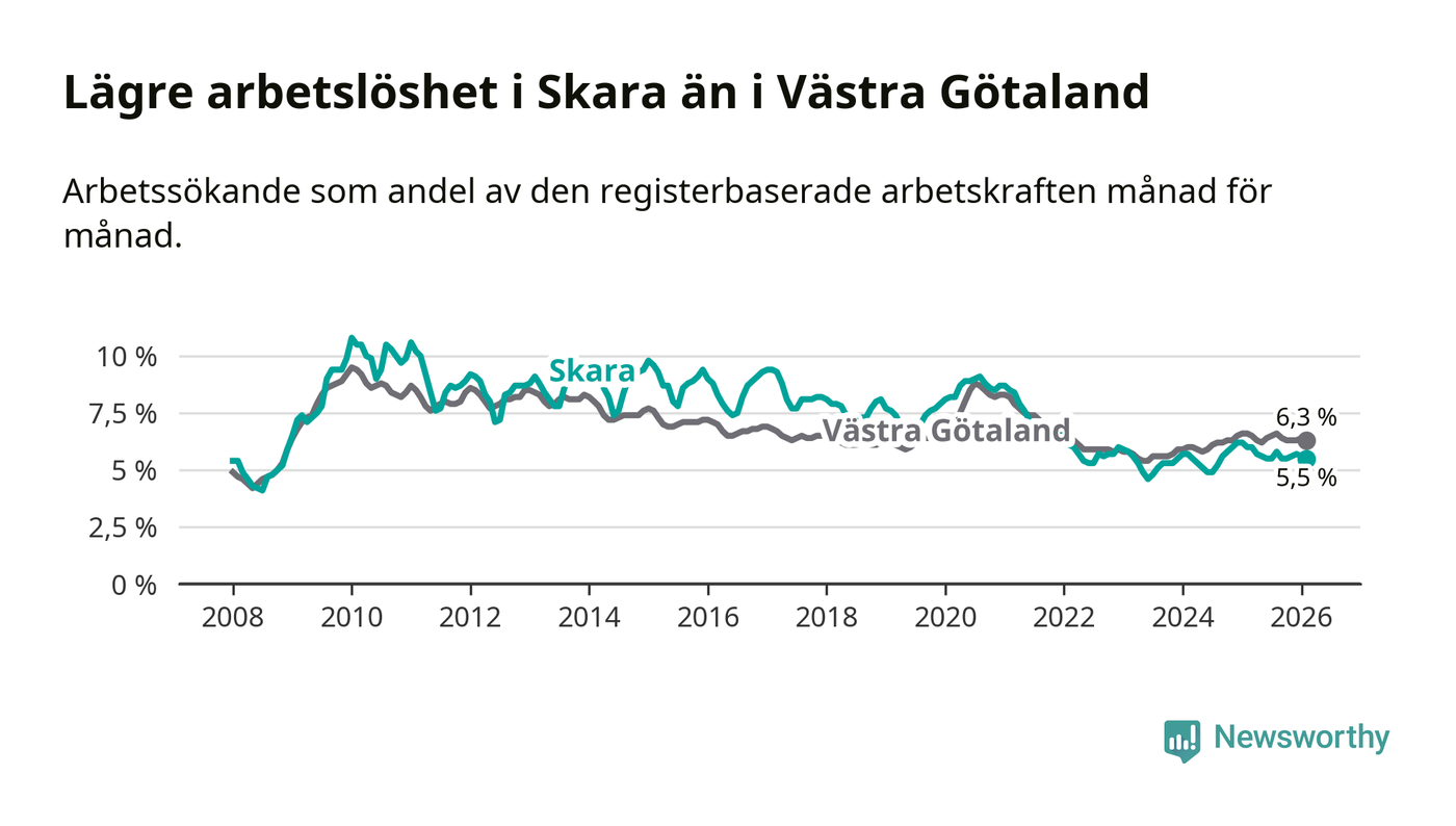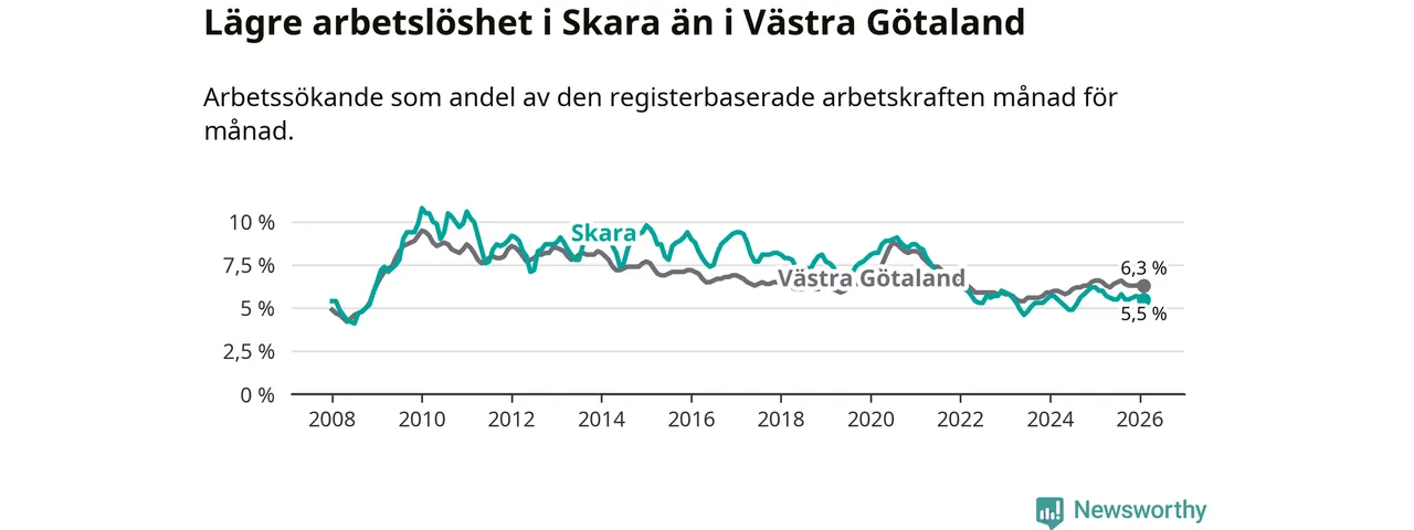 Under februari månad rapporterade Skara kommun en total arbetslöshet på 5,5 procent. Det är en minskning jämfört med samma tidpunkt i fjol (−0,5 procentenheter). Även i Västra Götalands län sjunker arbetslösheten .