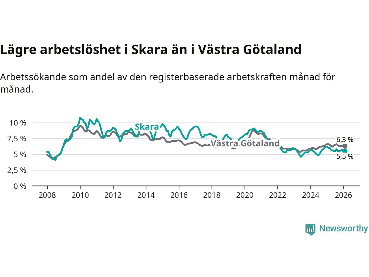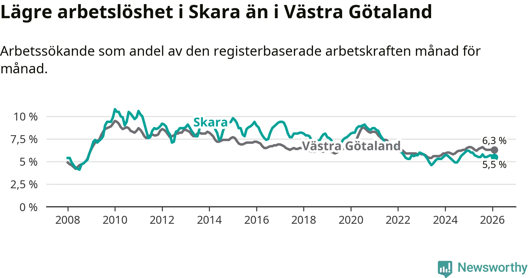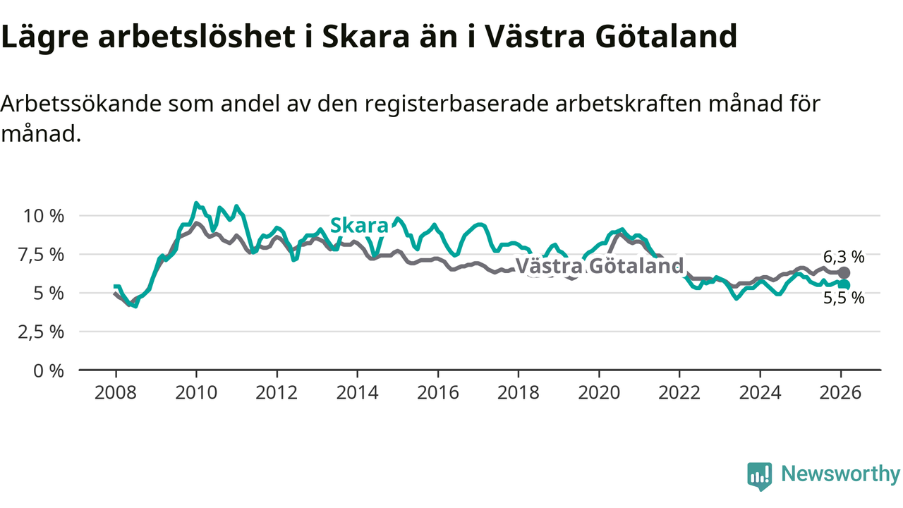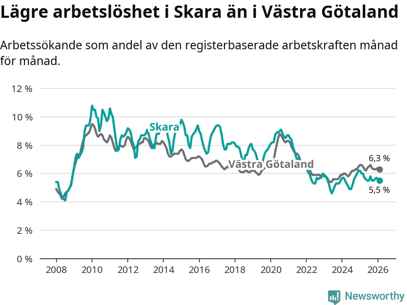 Under februari månad rapporterade Skara kommun en total arbetslöshet på 5,5 procent. Det är en minskning jämfört med samma tidpunkt i fjol (−0,5 procentenheter). Även i Västra Götalands län sjunker arbetslösheten .