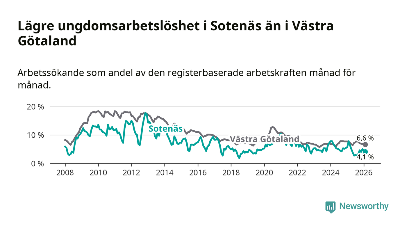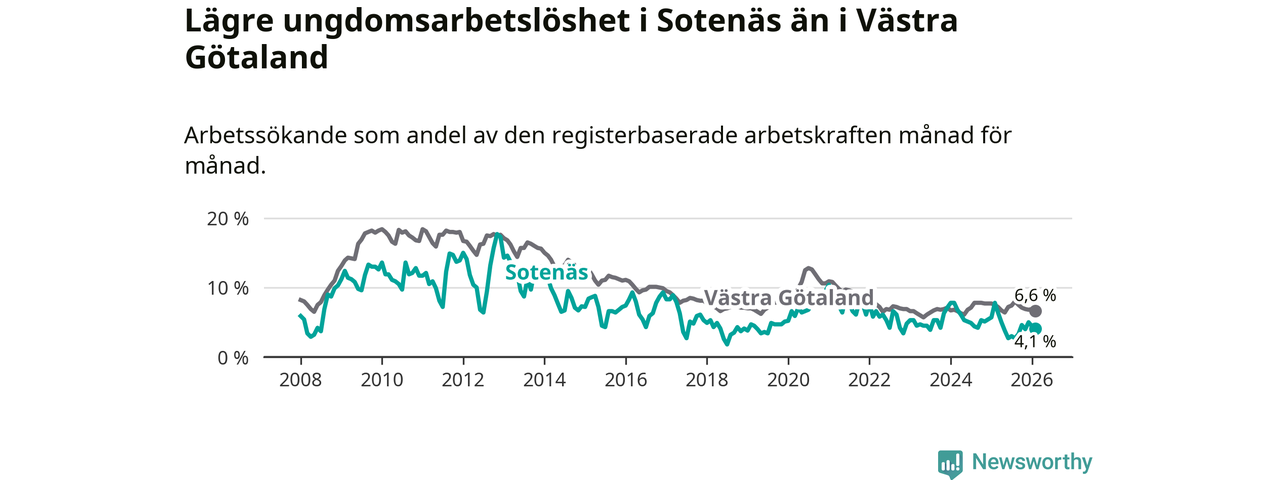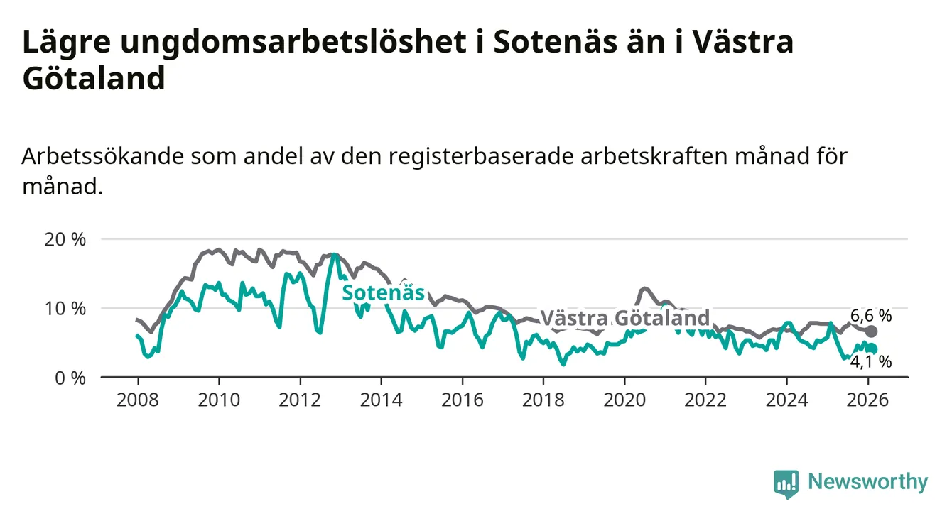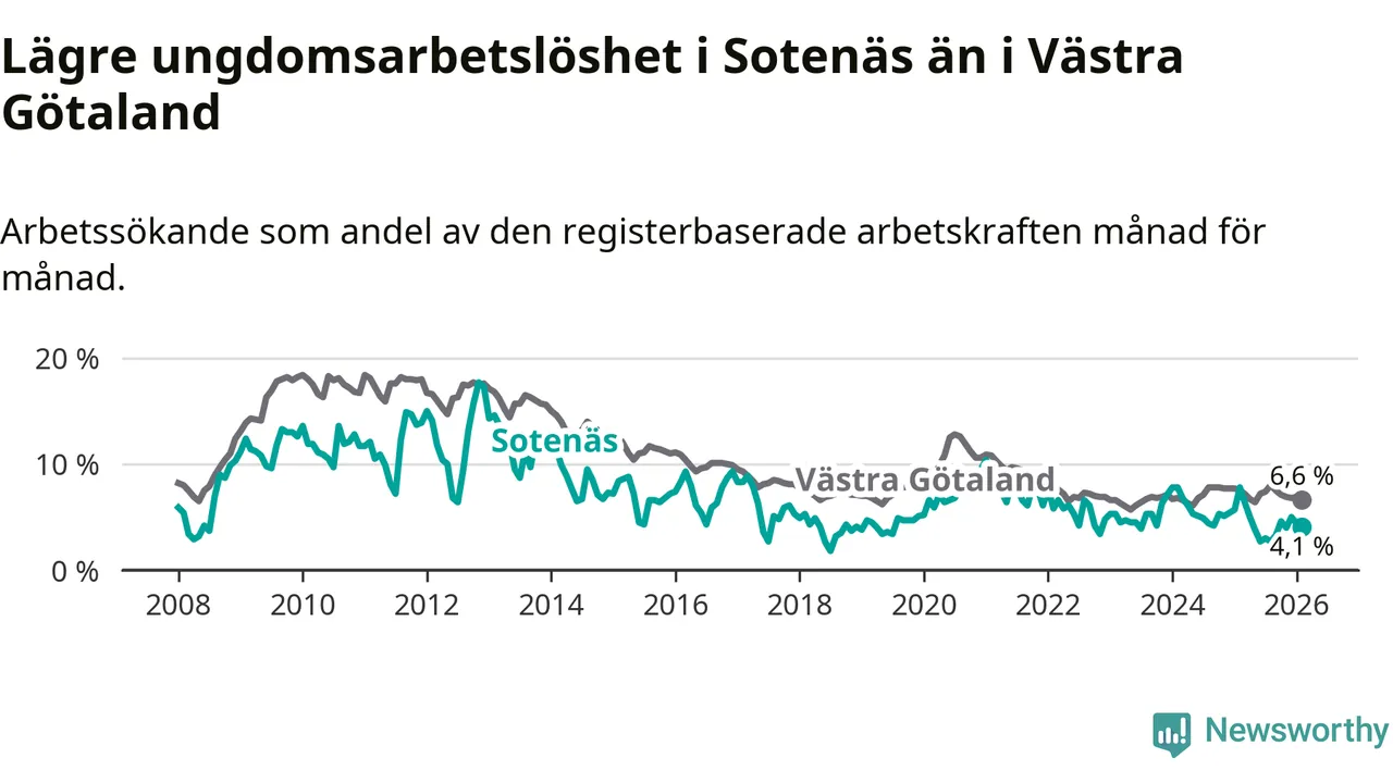 Precis som den totala arbetslösheten ligger ungdomsarbetslösheten i Sotenäs lägre än i Västra Götaland som helhet. Skillnaden mellan kommunen och länet är 2,5 procentenheter.