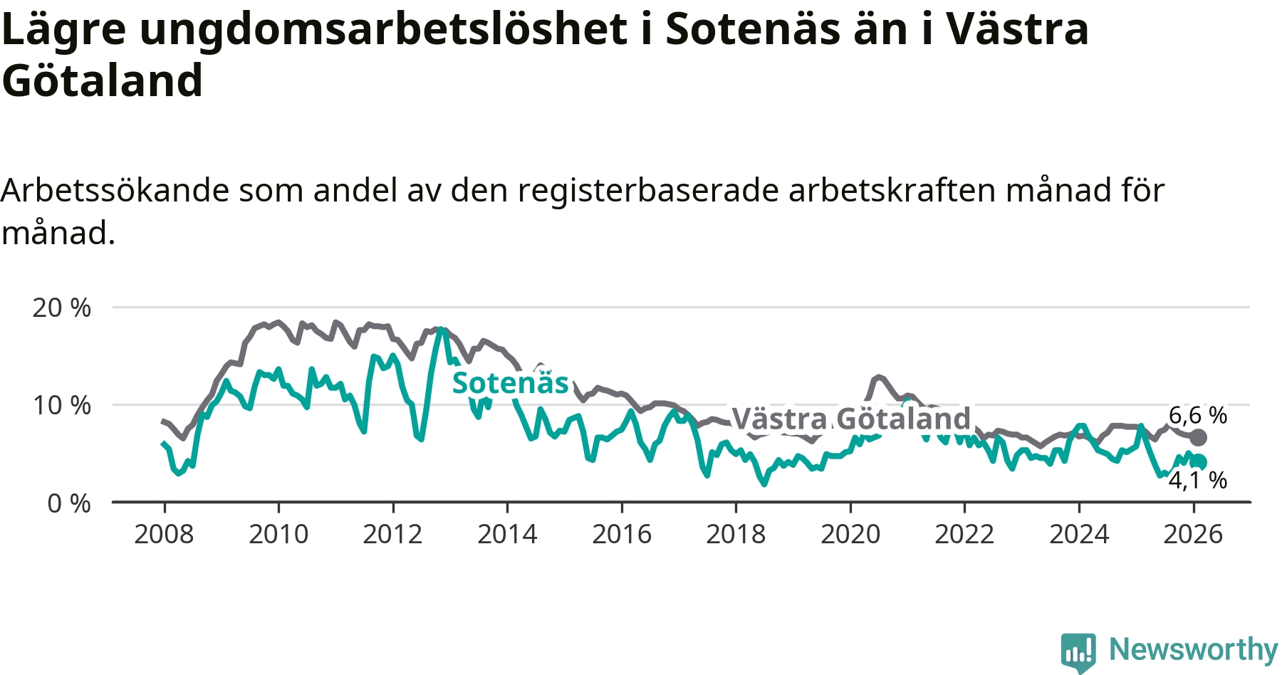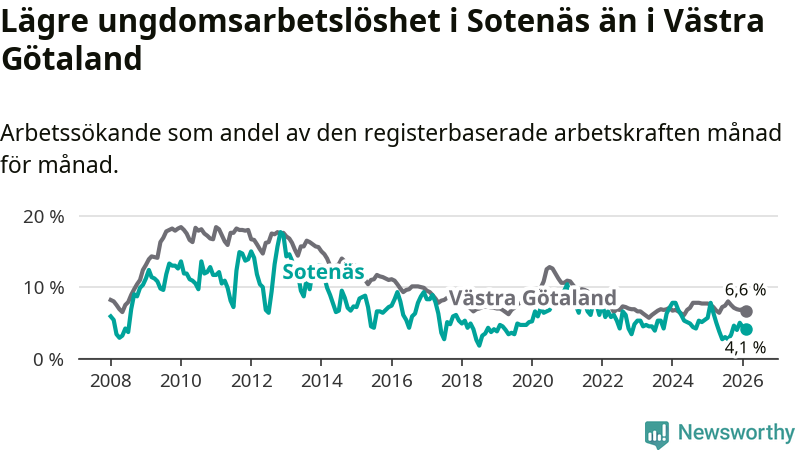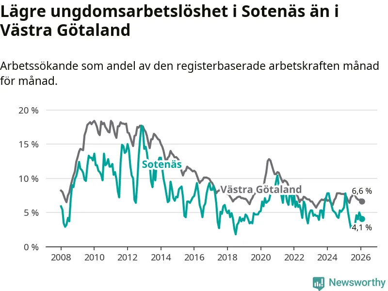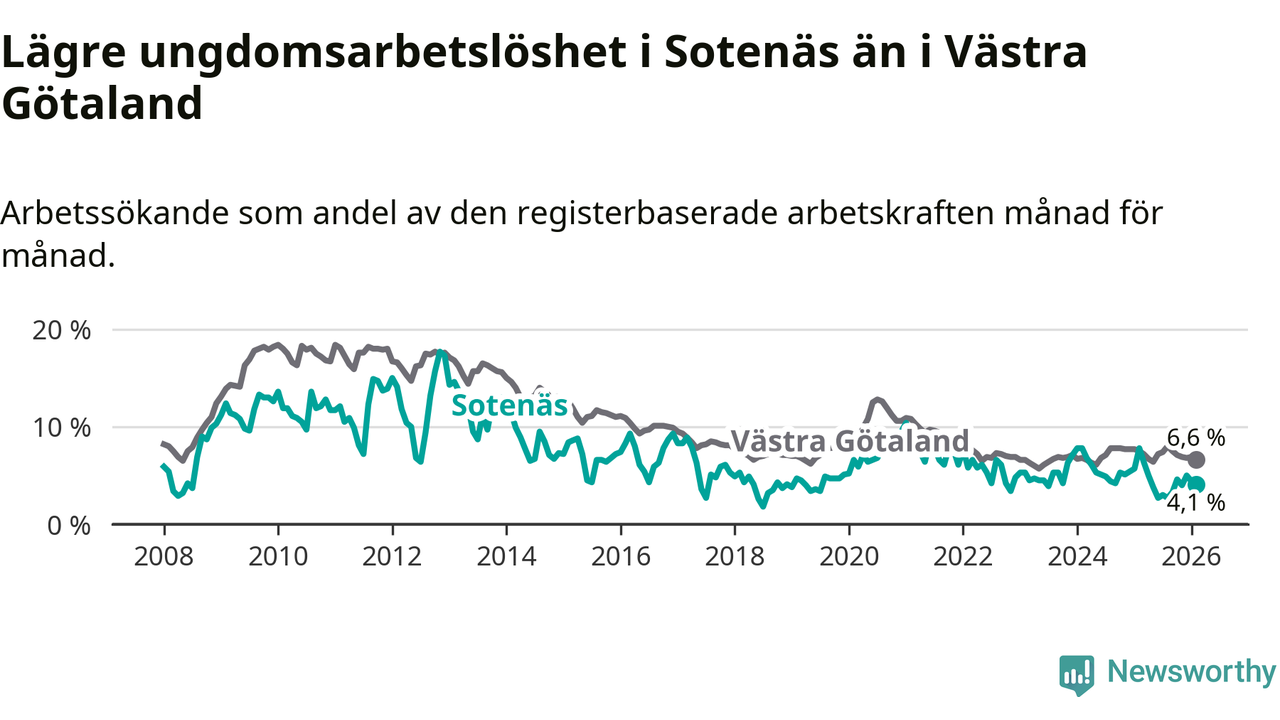 Precis som den totala arbetslösheten ligger ungdomsarbetslösheten i Sotenäs lägre än i Västra Götaland som helhet. Skillnaden mellan kommunen och länet är 2,5 procentenheter.