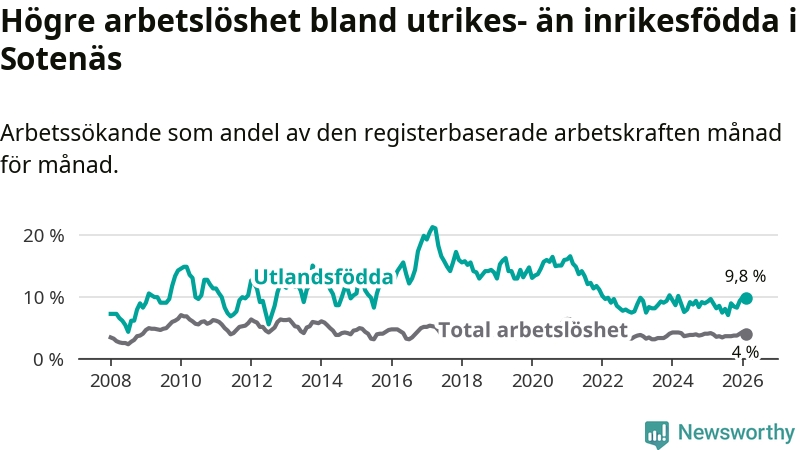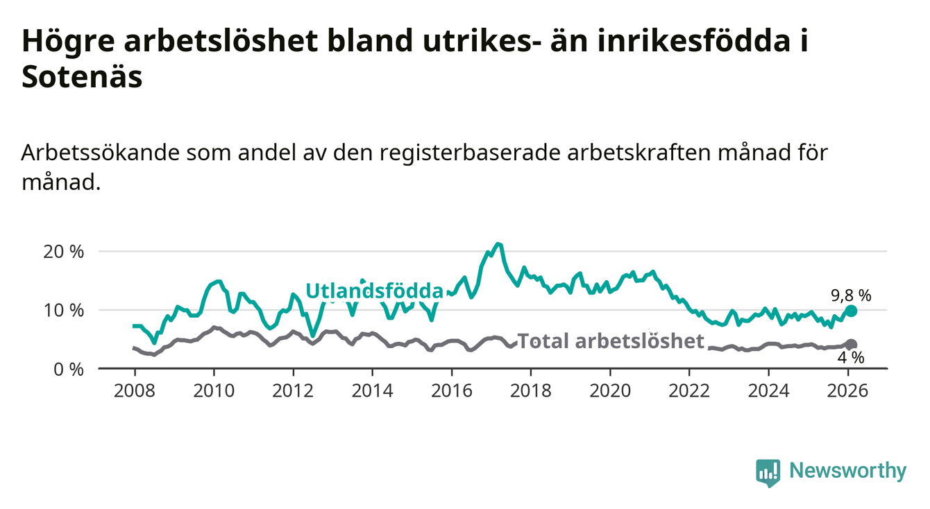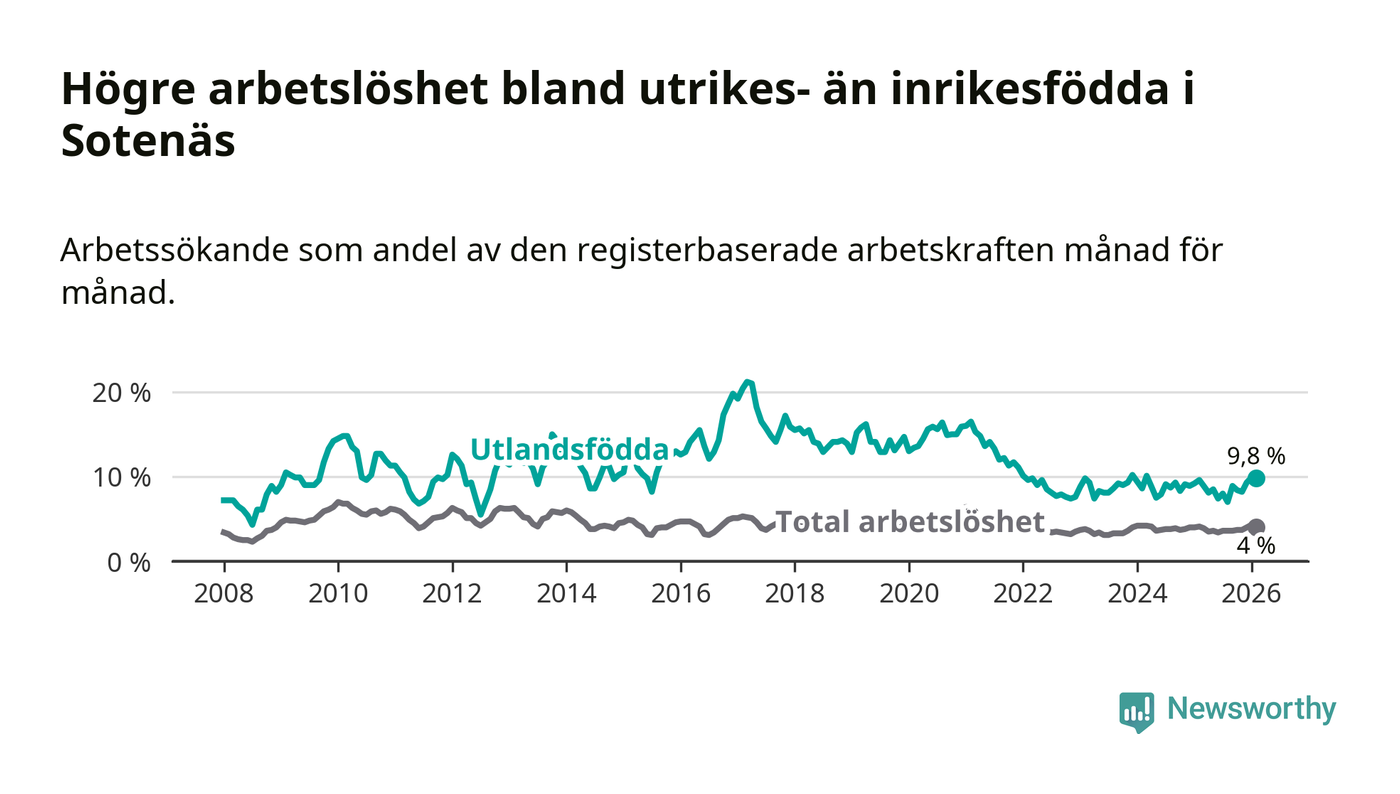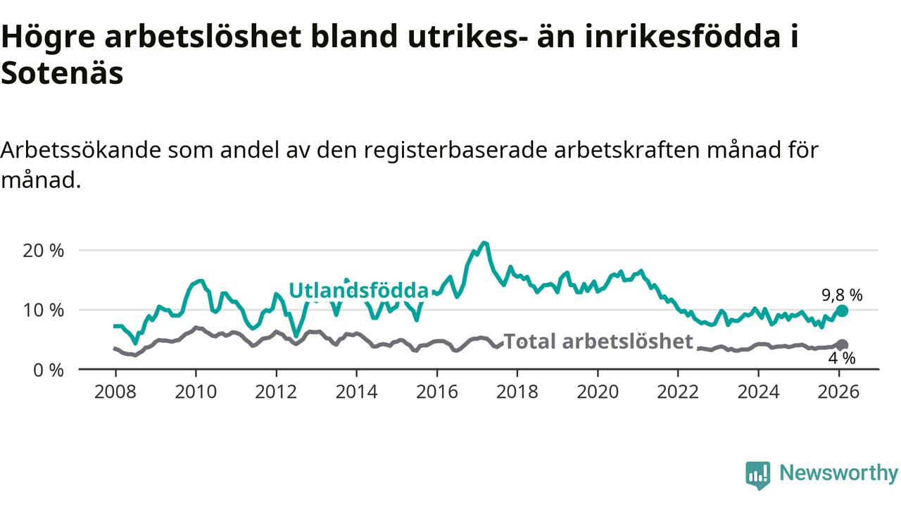 Arbetslösheten bland utlandsfödda var 9,8 procent i Sotenäs under februari månad, motsvarande 52 av 531 personer. Det är 0,2 procentenheter fler än vid samma tidpunkt i fjol (±0 om man räknar personer).