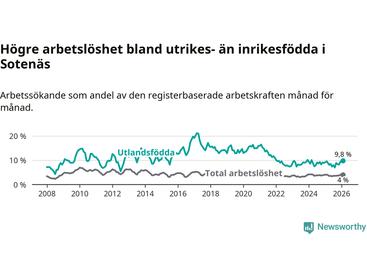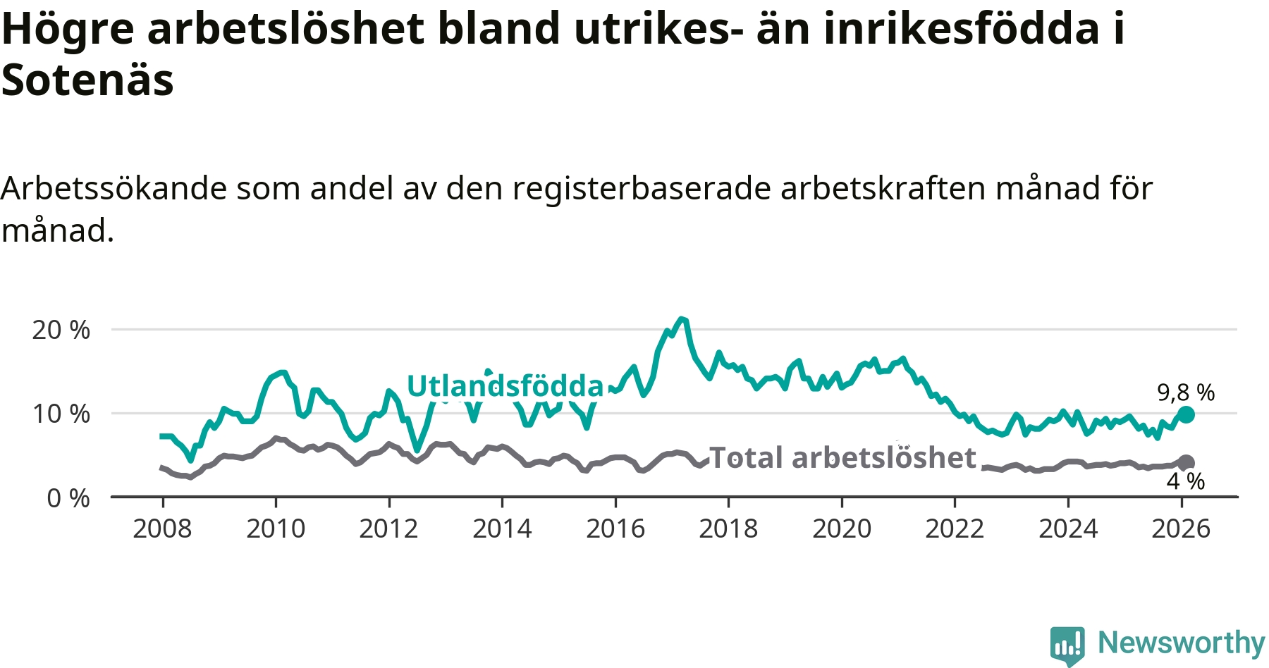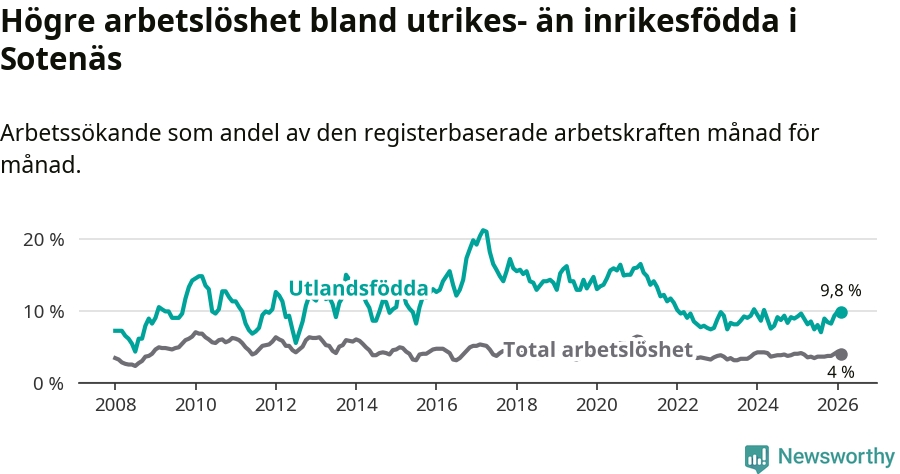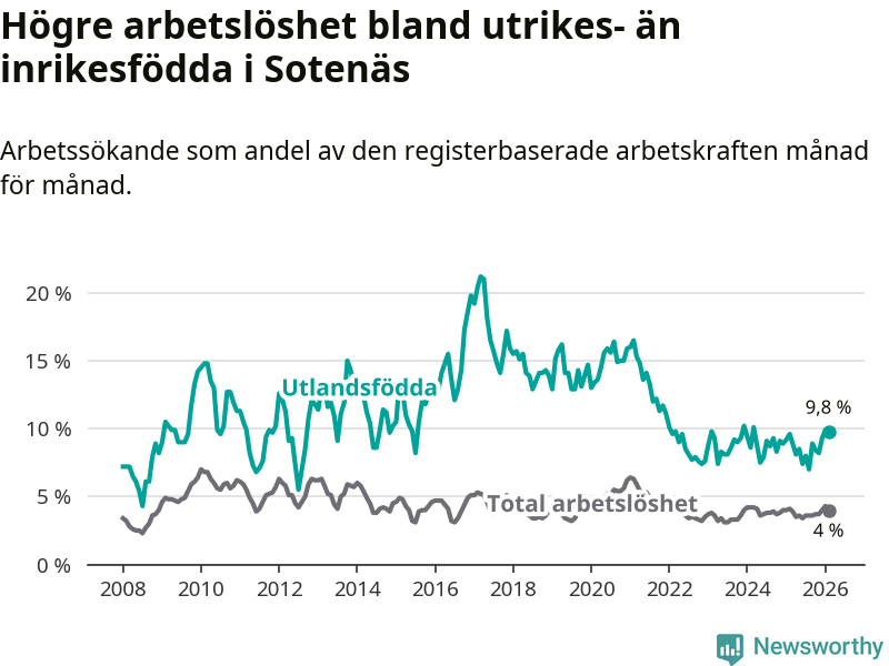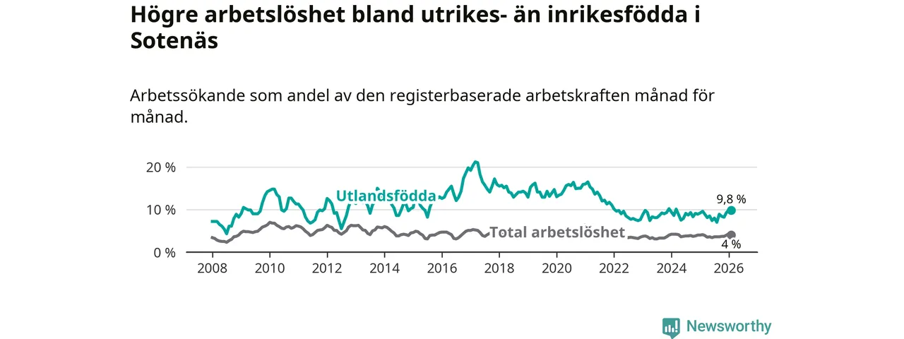 Arbetslösheten bland utlandsfödda var 9,8 procent i Sotenäs under februari månad, motsvarande 52 av 531 personer. Det är 0,2 procentenheter fler än vid samma tidpunkt i fjol (±0 om man räknar personer).