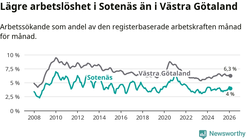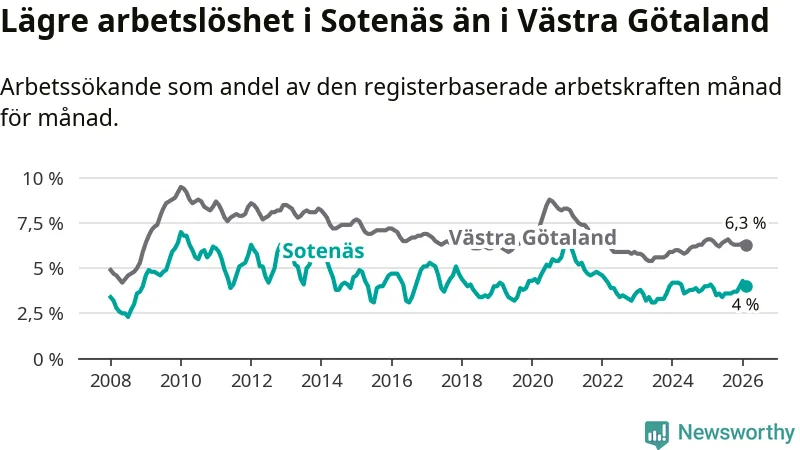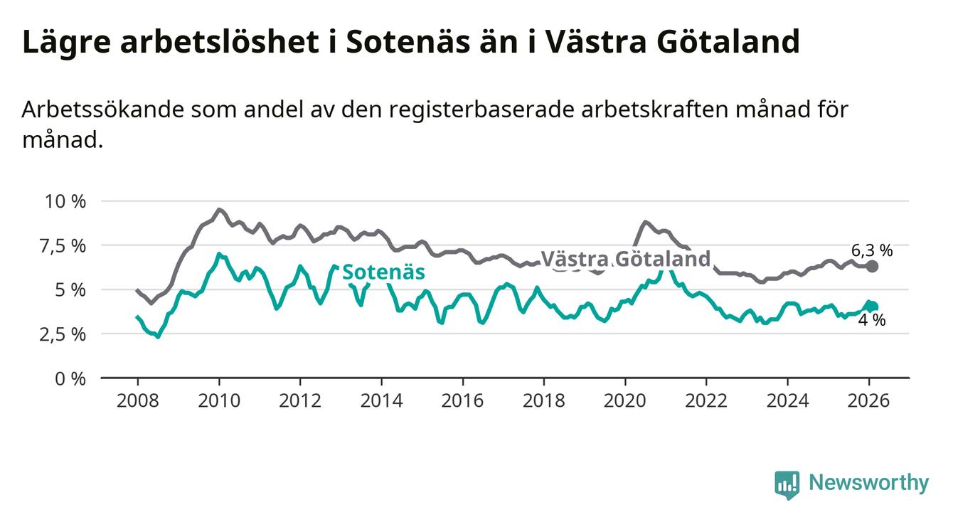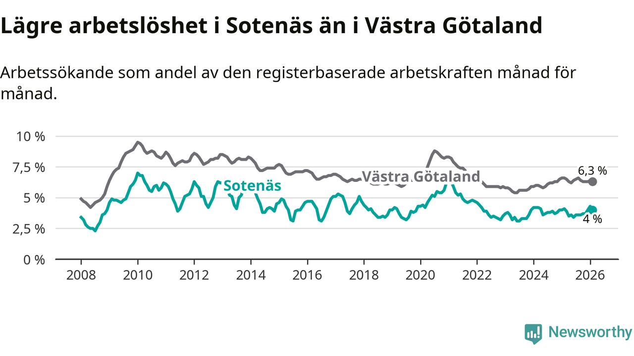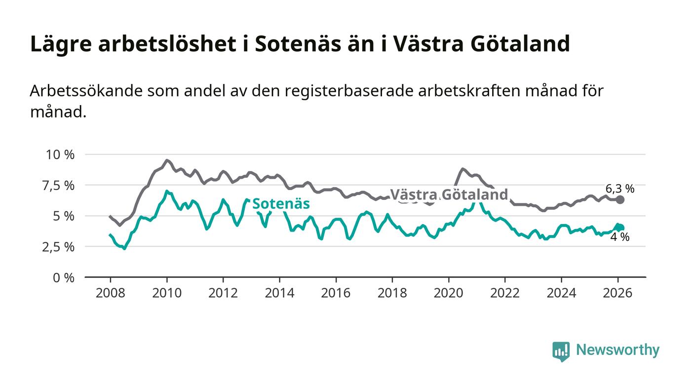 Sotenäs hade redan tidigare lägre arbetslöshet än snittet i hela Västra Götalands län och nu växer klyftan (4,0 procent i kommunen, jämfört med 6,3 procent i hela länet). Öckerö har den lägsta arbetslösheten i länet (2,7 procent), medan Gullspång har den högsta (8,3 procent). För att Sotenäs skulle komma ner i samma arbetslöshetsnivå som Öckerö skulle 52 personer behöva sysselsättas.