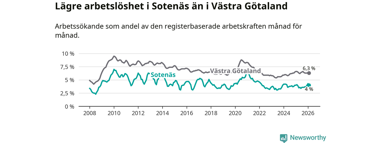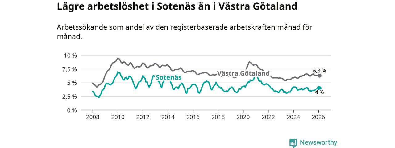 Under februari månad rapporterade Sotenäs kommun en total arbetslöshet på 4,0 procent. Det är en minskning jämfört med samma tidpunkt i fjol (−0,1 procentenheter). Även i Västra Götalands län sjunker arbetslösheten .