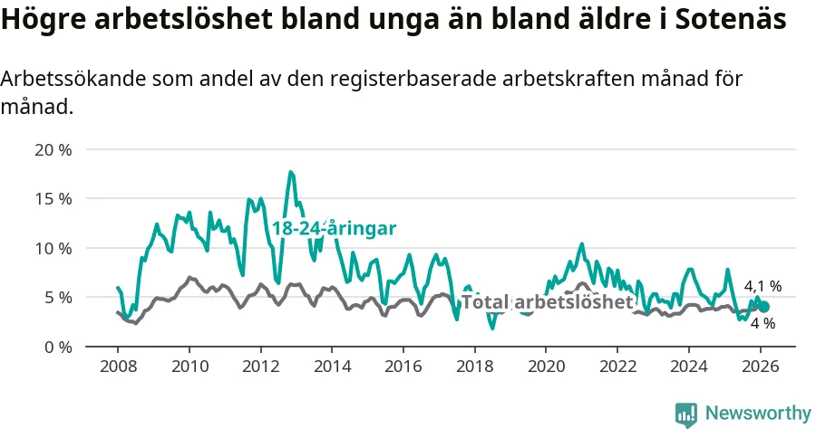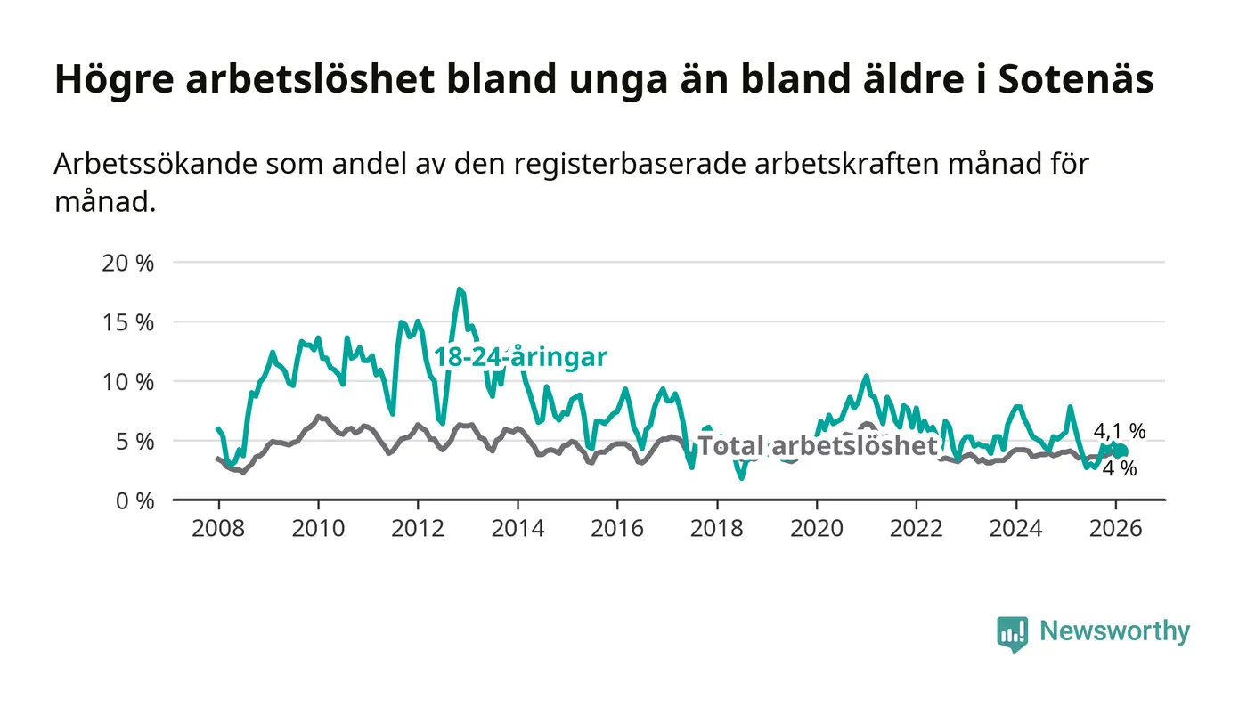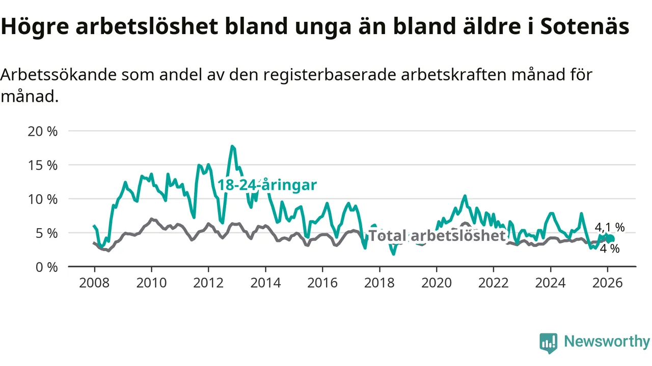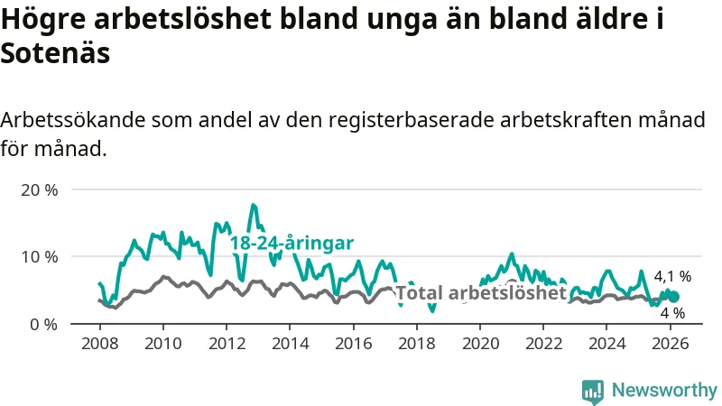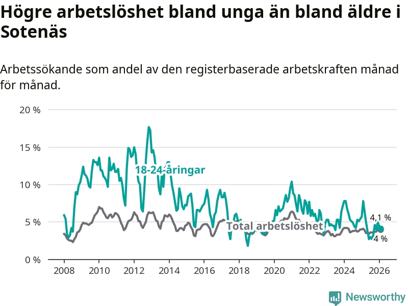 I och med den senaste månadens nedgång har de ungas arbetslöshet i Sotenäs sjunkit tolv månader i följd (ner från 7,8 procent i februari 2025 till 4,1 procent nu).