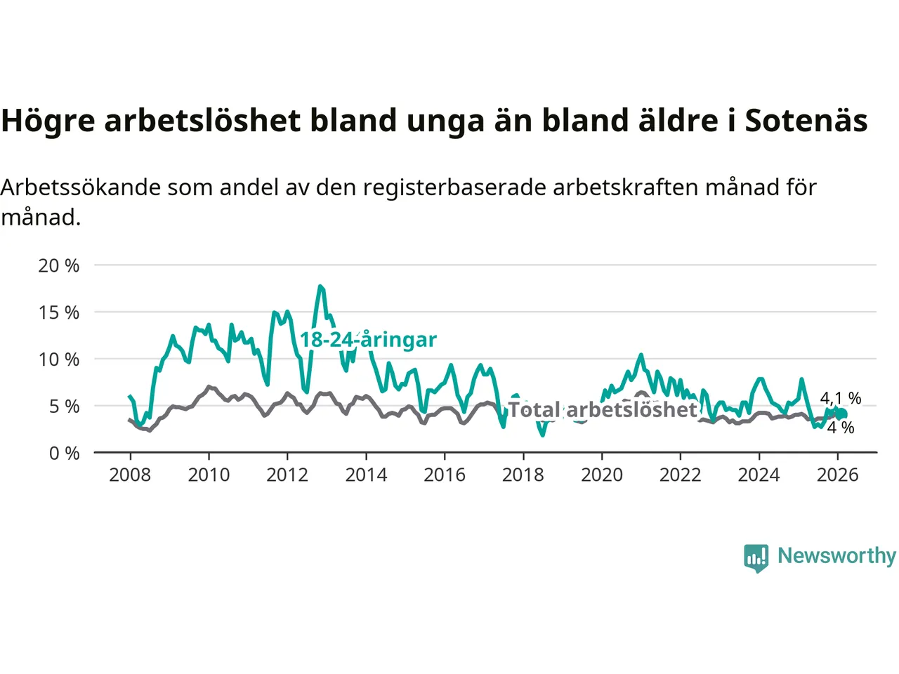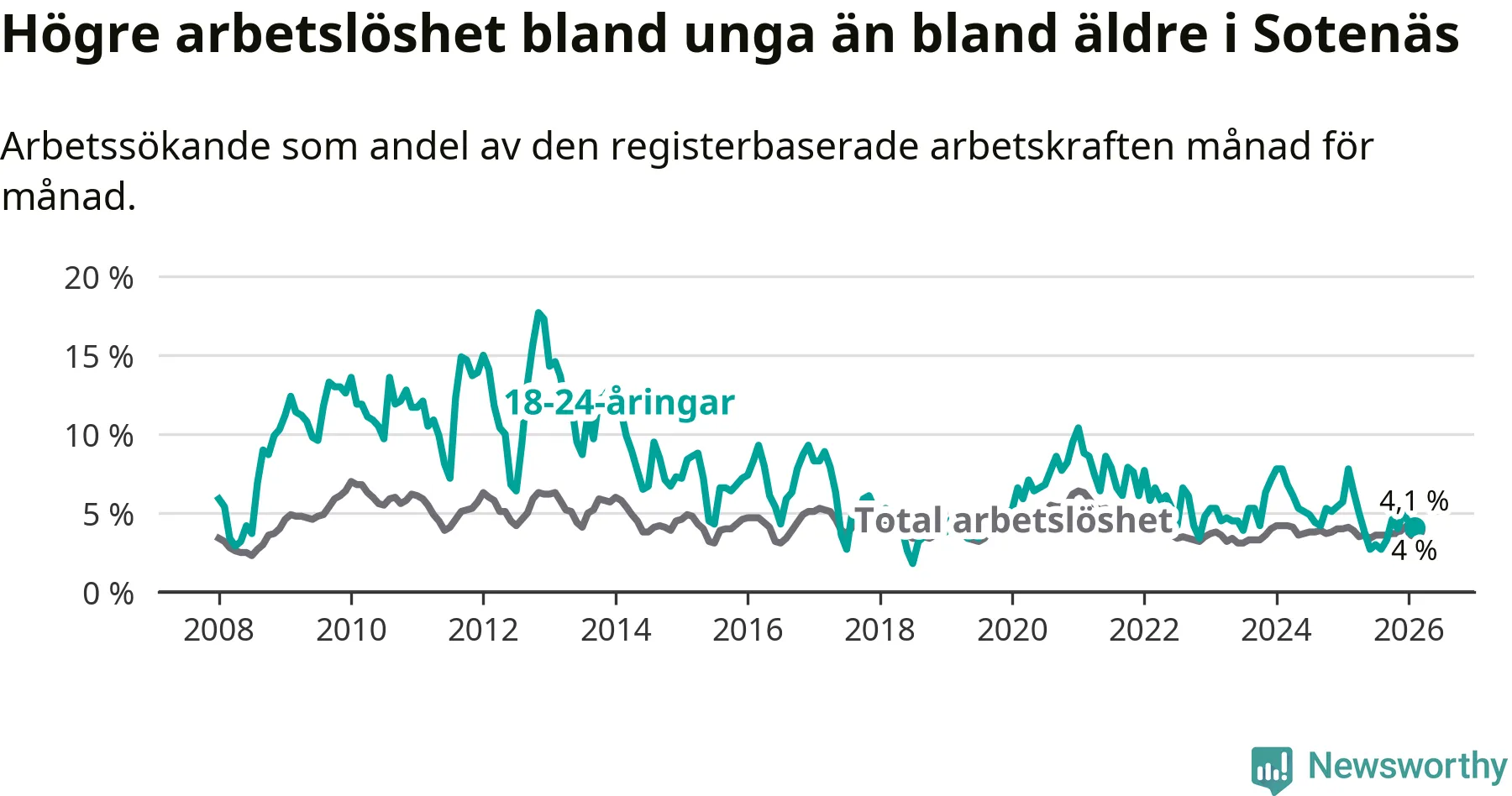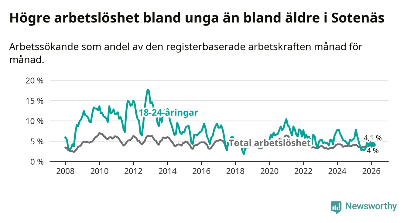 I och med den senaste månadens nedgång har de ungas arbetslöshet i Sotenäs sjunkit tolv månader i följd (ner från 7,8 procent i februari 2025 till 4,1 procent nu).