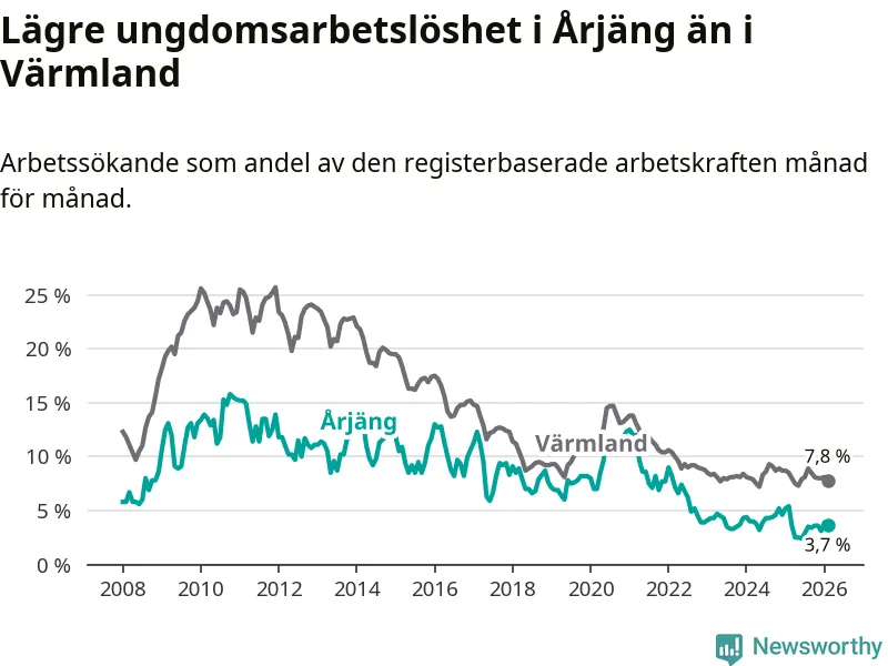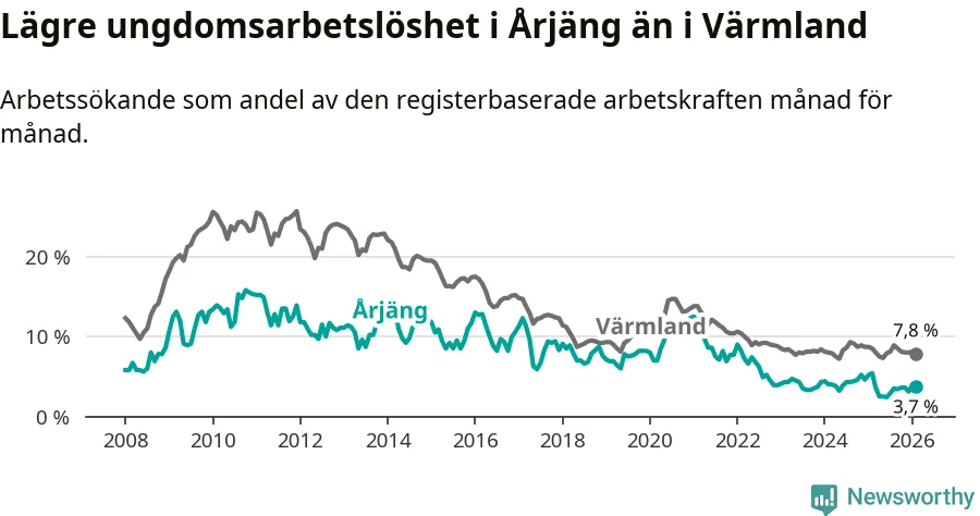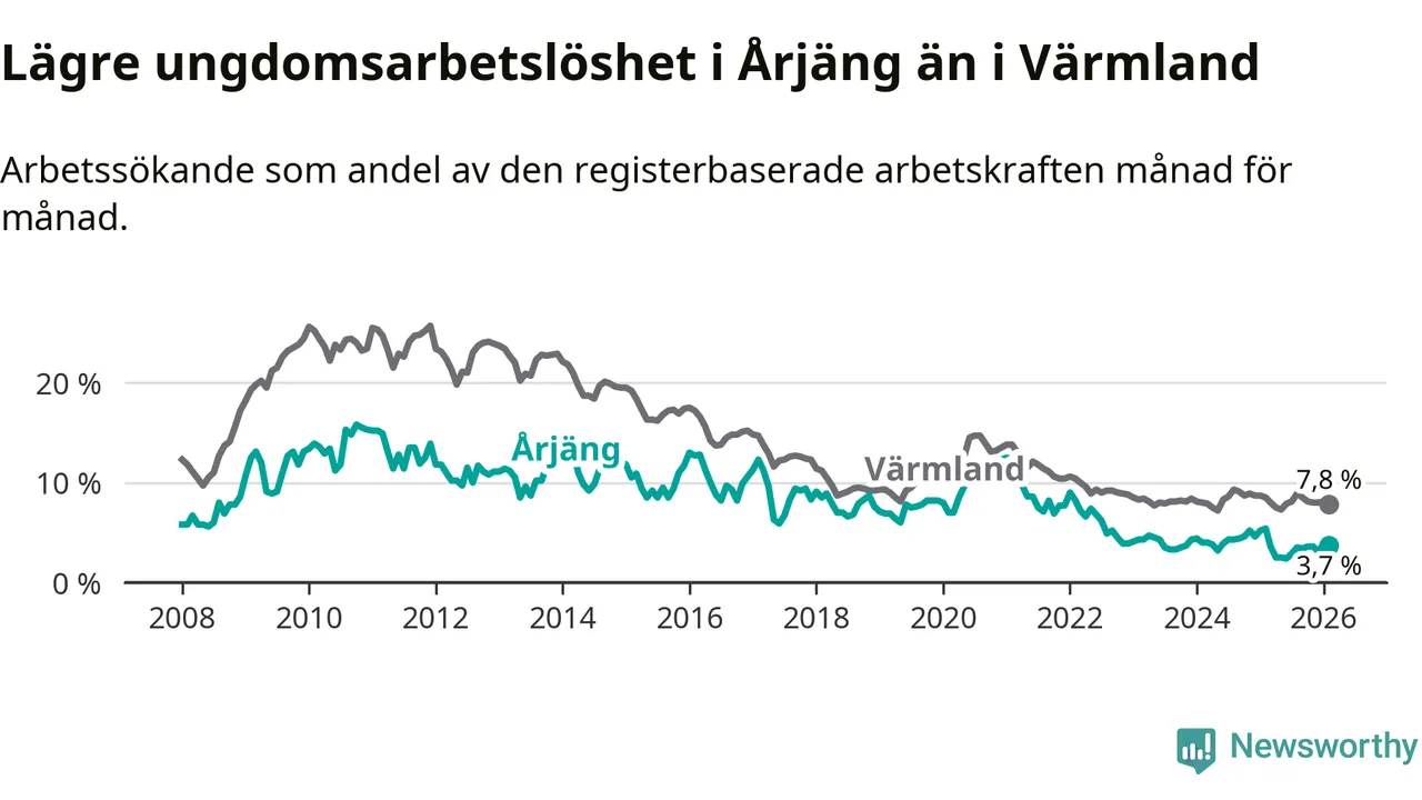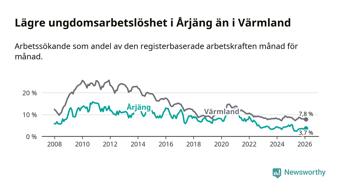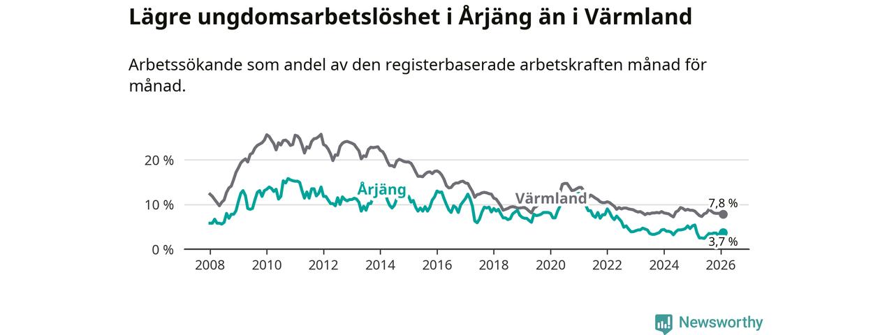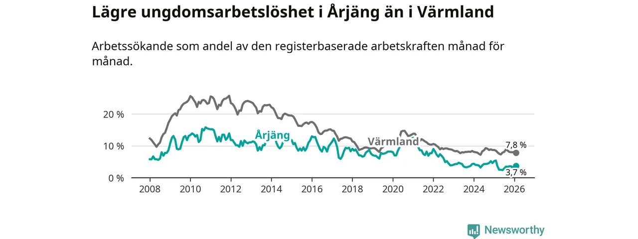 I och med den senaste månadens nedgång har de ungas arbetslöshet i Årjäng sjunkit tolv månader i följd (ner från 5,4 procent i februari 2025 till 3,7 procent nu).