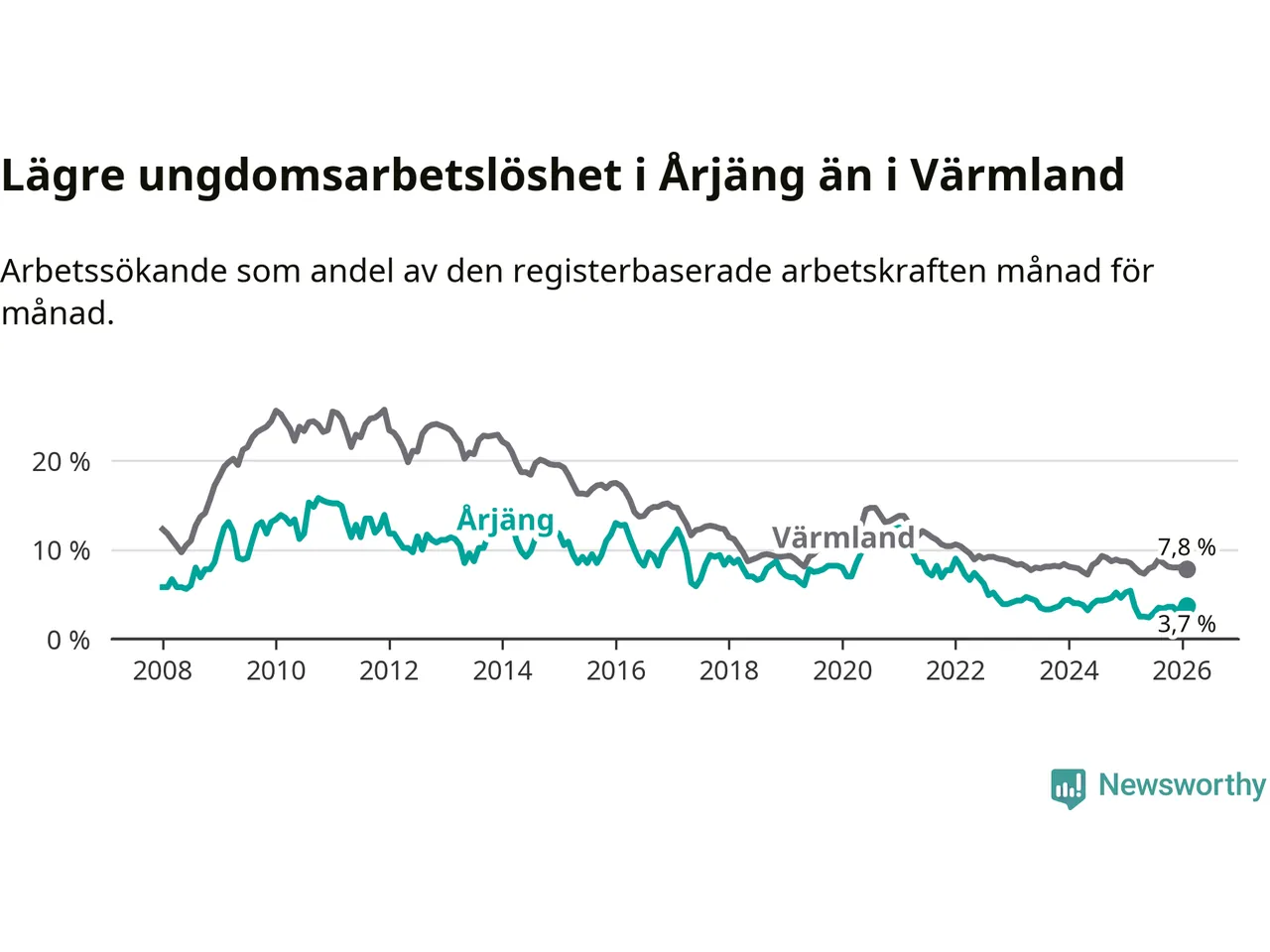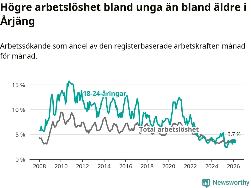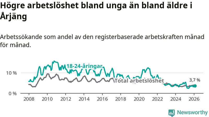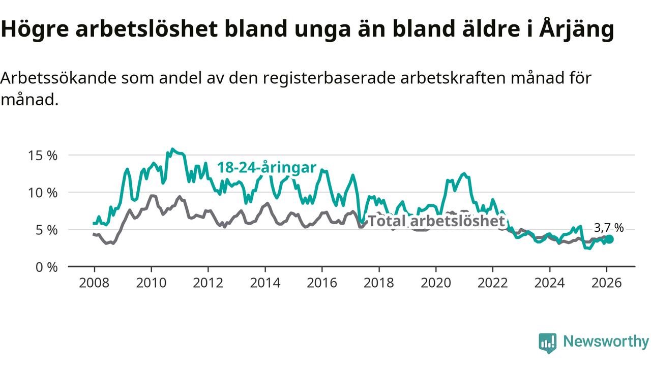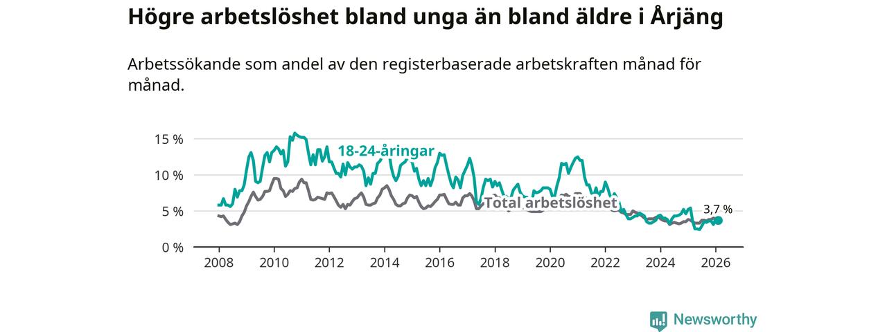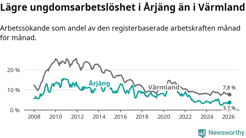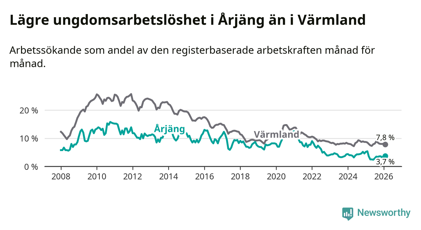I och med den senaste månadens nedgång har de ungas arbetslöshet i Årjäng sjunkit tolv månader i följd (ner från 5,4 procent i februari 2025 till 3,7 procent nu).
