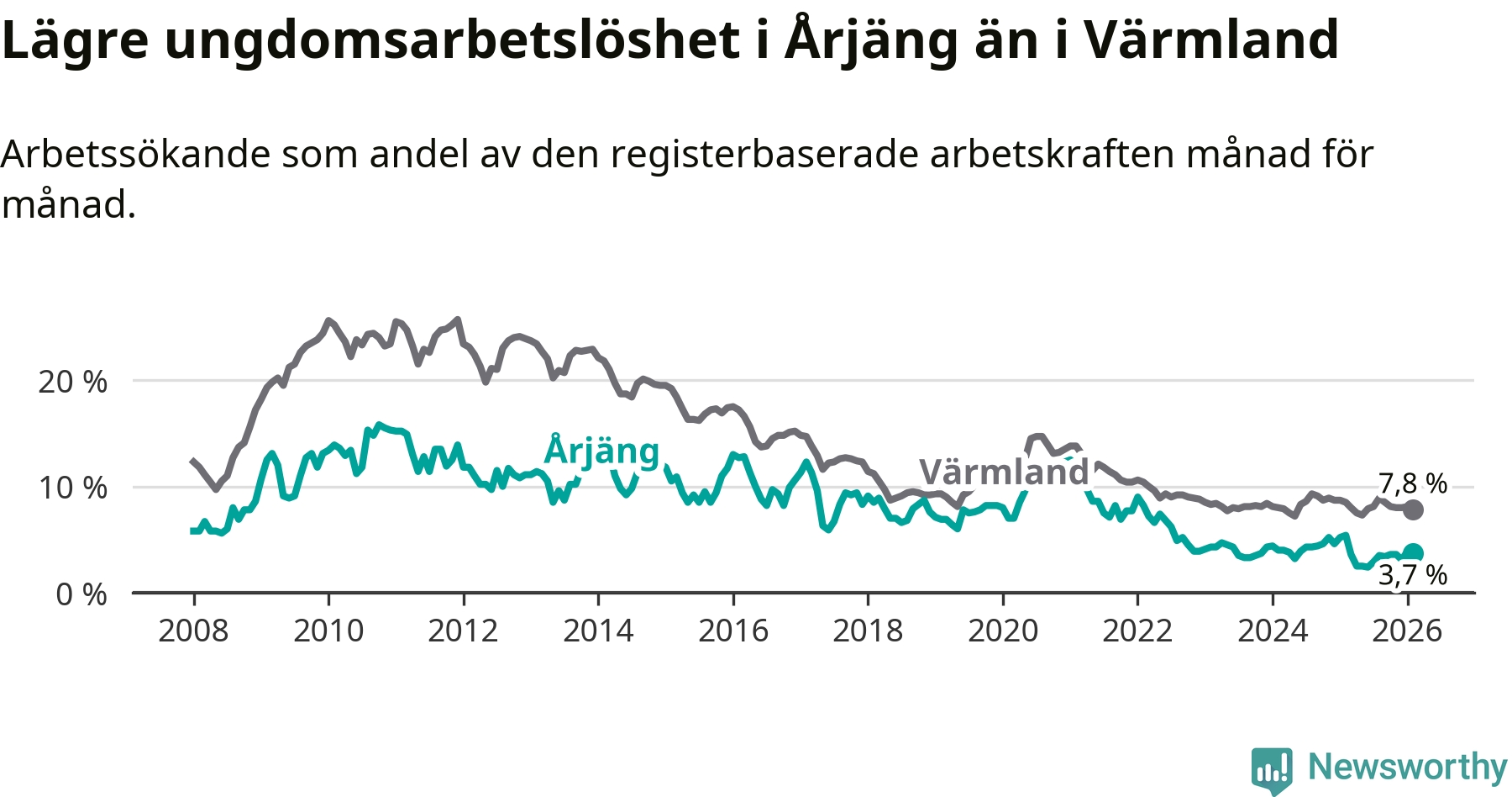 Graf: Arbetslöshet bland unga i Årjängs kommun och Värmlands län