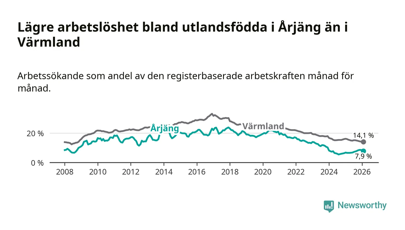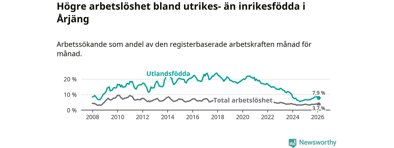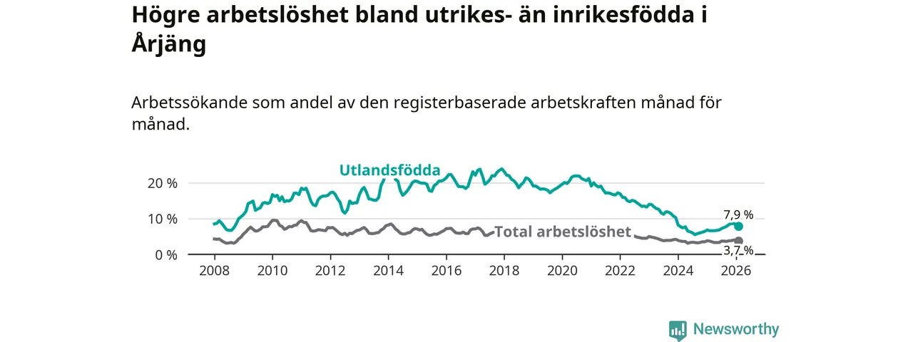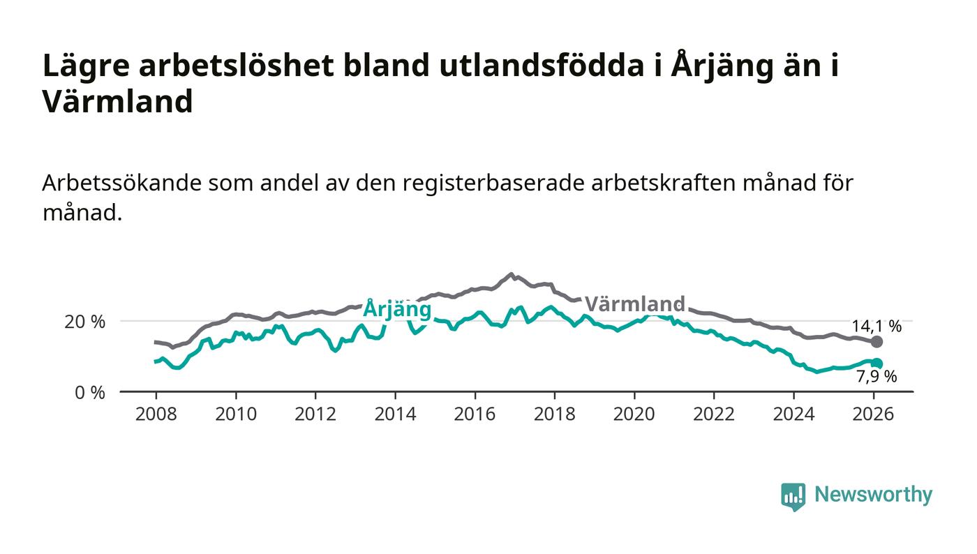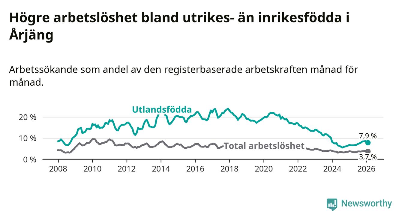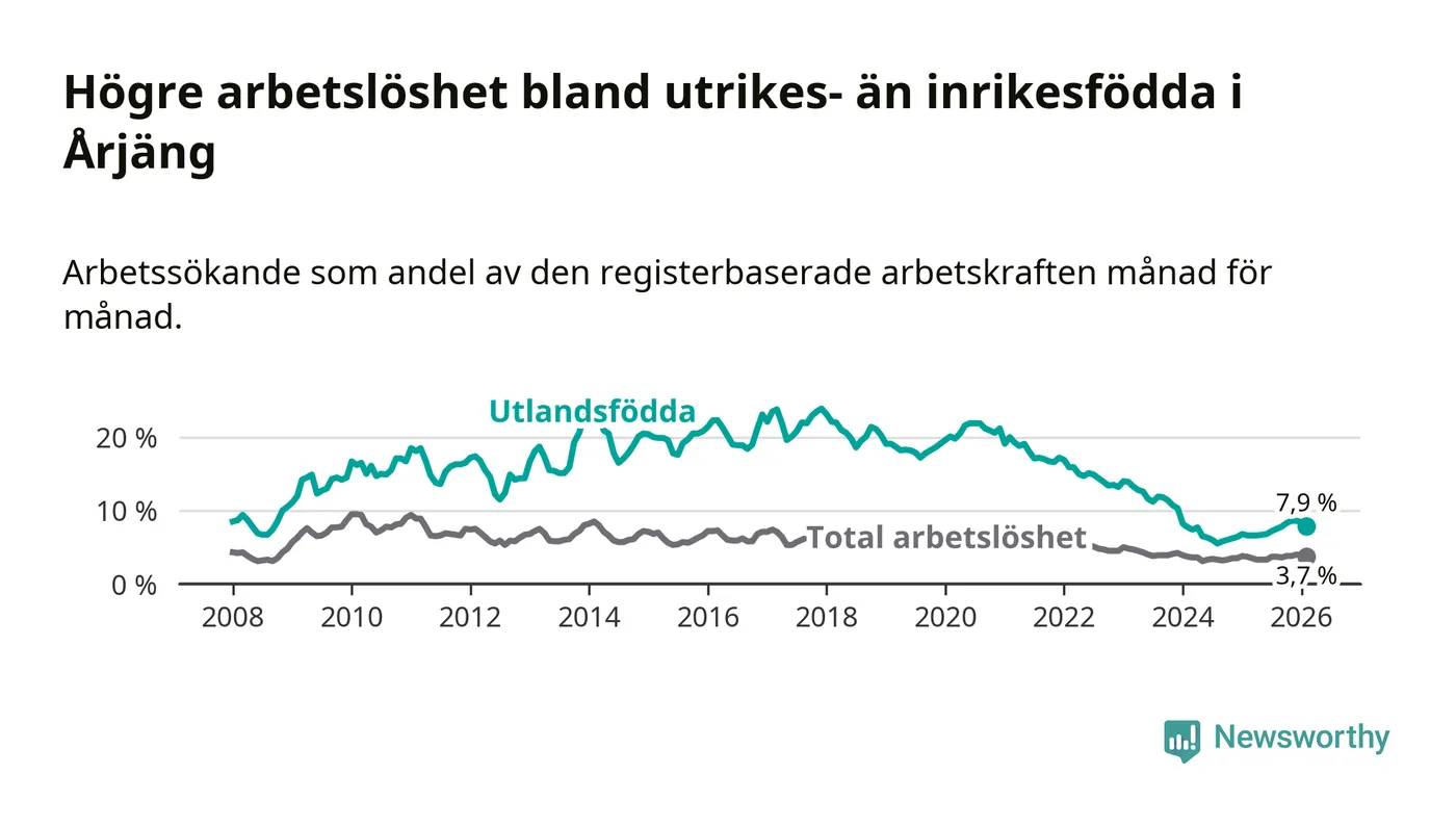 Arbetslösheten bland utlandsfödda var 7,9 procent i Årjäng under februari månad, motsvarande 90 av 1 139 personer. Det är 1,3 procentenheter fler än vid samma tidpunkt i fjol (+15 om man räknar personer). Därmed är de utlandsföddas arbetslöshet högre än vid samma tidpunkt i fjol för tionde månaden i följd. Sedan april 2025 har arbetslösheten bland utlandsfödda ökat från 6,6 till 7,9 procent.