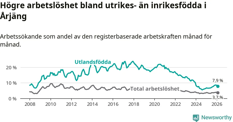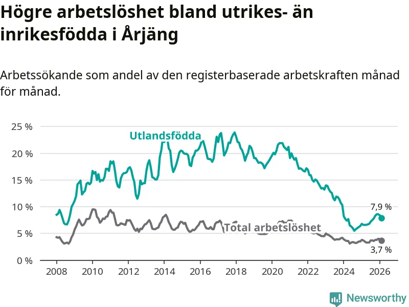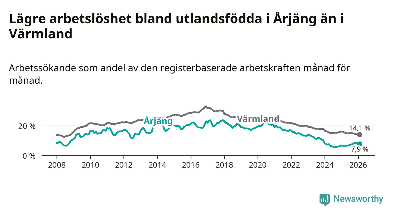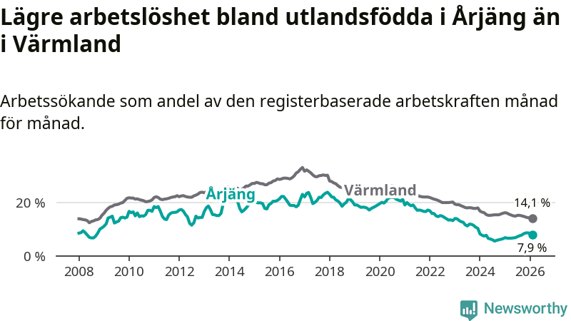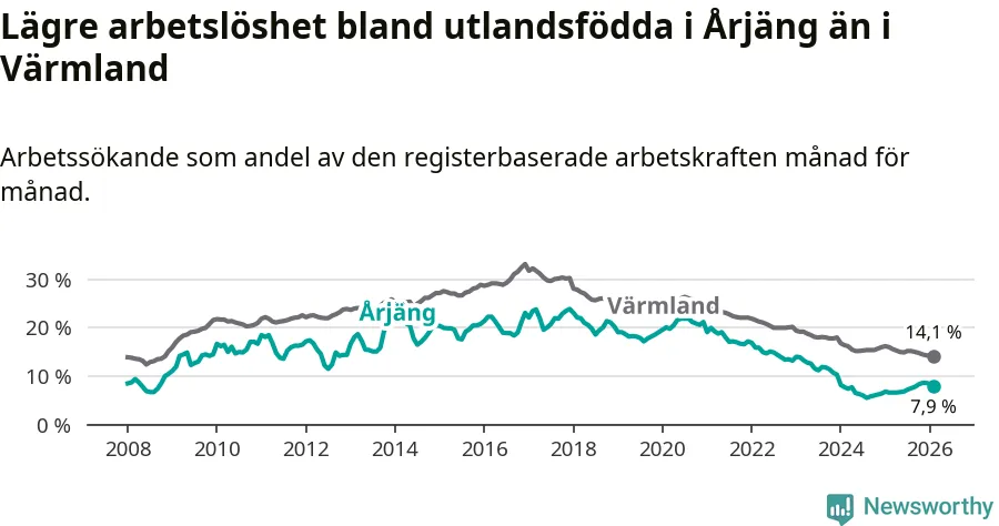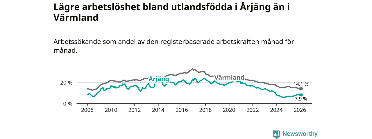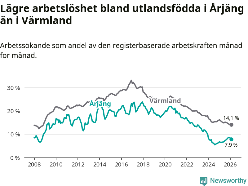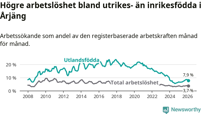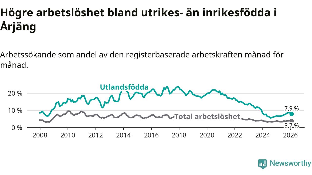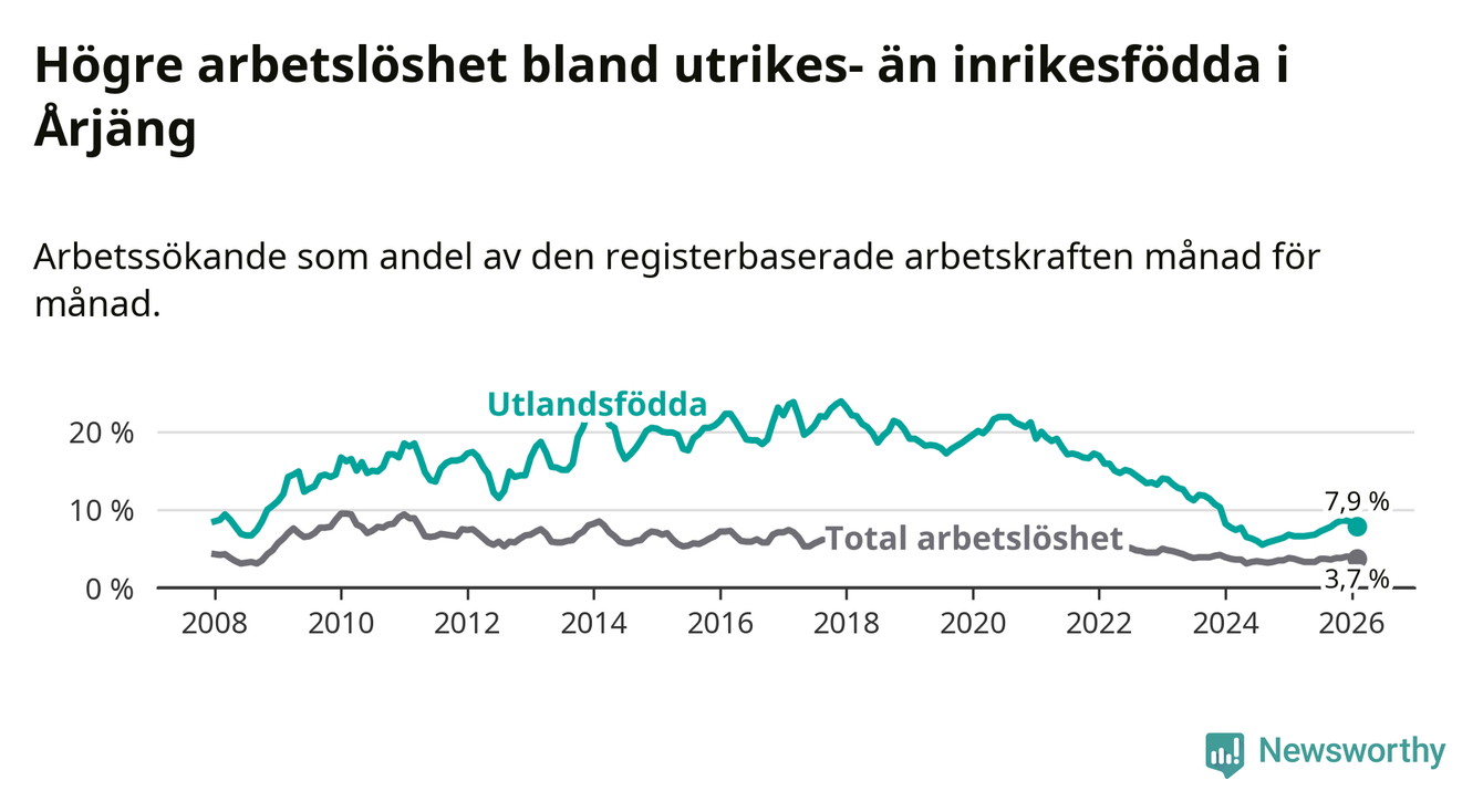 Arbetslösheten bland utlandsfödda var 7,9 procent i Årjäng under februari månad, motsvarande 90 av 1 139 personer. Det är 1,3 procentenheter fler än vid samma tidpunkt i fjol (+15 om man räknar personer). Därmed är de utlandsföddas arbetslöshet högre än vid samma tidpunkt i fjol för tionde månaden i följd. Sedan april 2025 har arbetslösheten bland utlandsfödda ökat från 6,6 till 7,9 procent.