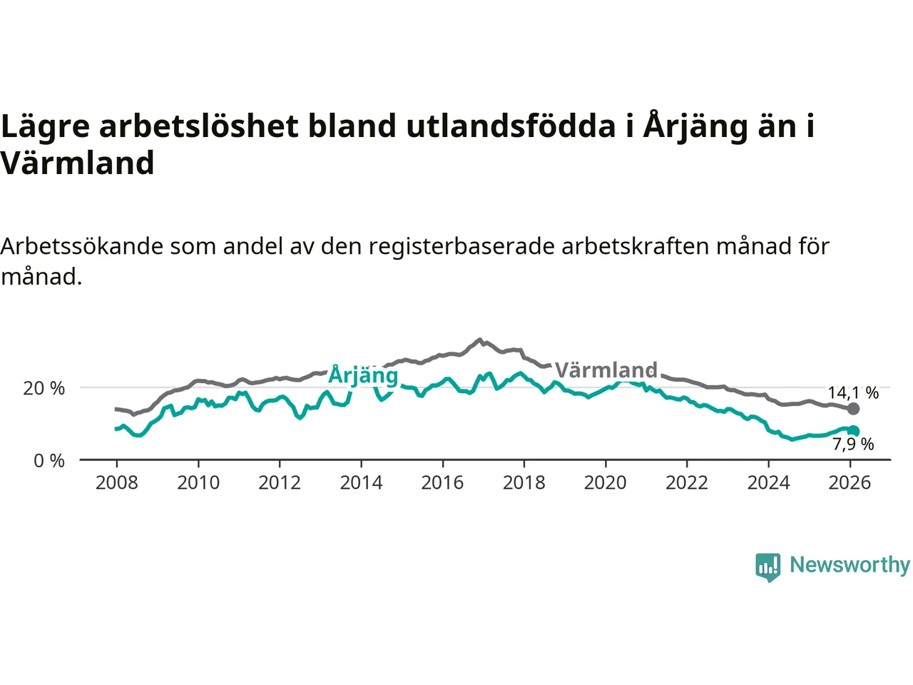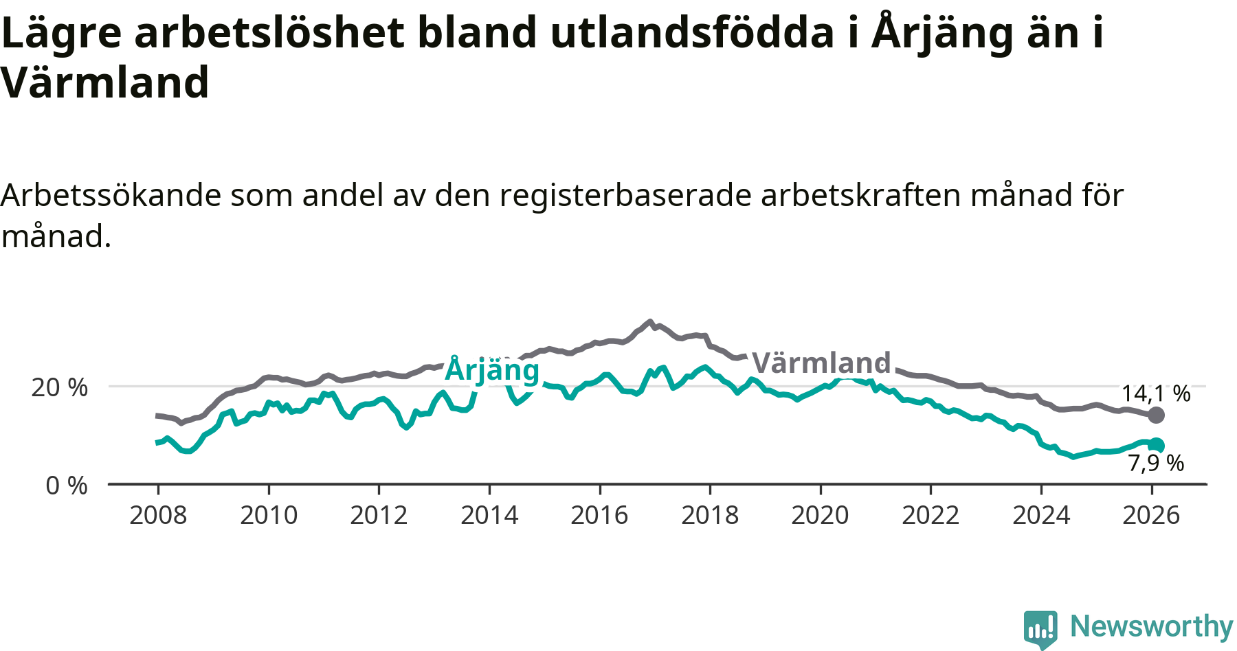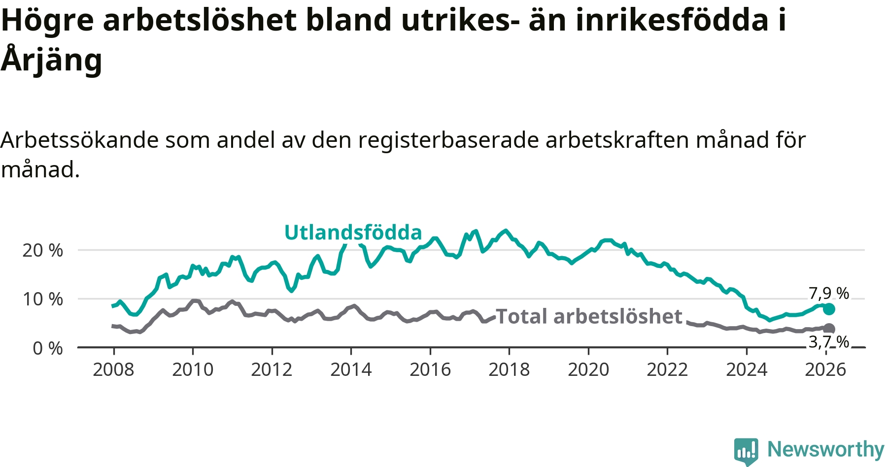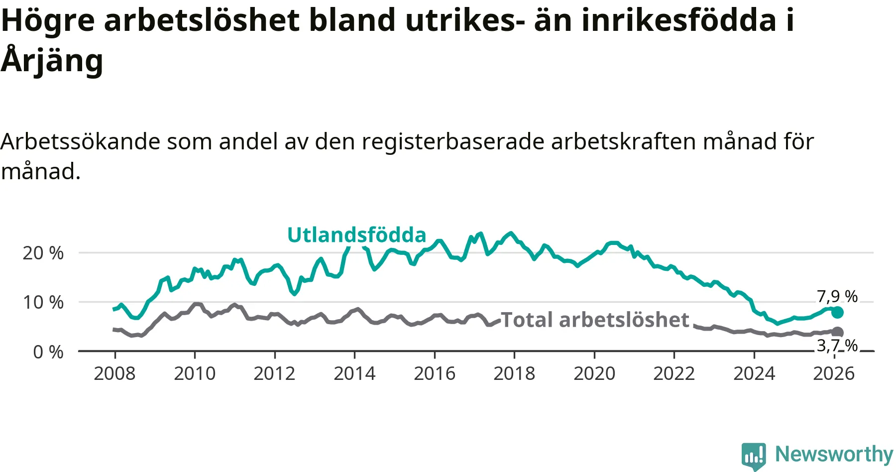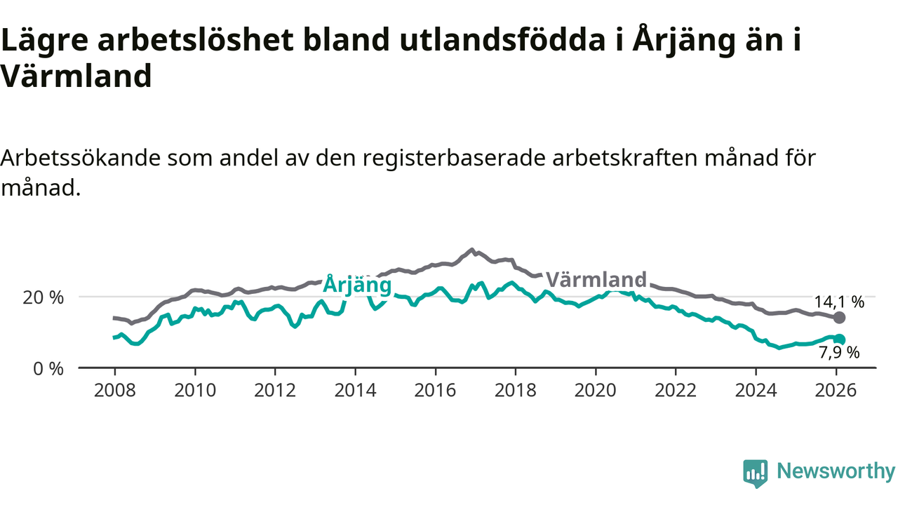 Arbetslösheten bland utlandsfödda var 7,9 procent i Årjäng under februari månad, motsvarande 90 av 1 139 personer. Det är 1,3 procentenheter fler än vid samma tidpunkt i fjol (+15 om man räknar personer). Därmed är de utlandsföddas arbetslöshet högre än vid samma tidpunkt i fjol för tionde månaden i följd. Sedan april 2025 har arbetslösheten bland utlandsfödda ökat från 6,6 till 7,9 procent.