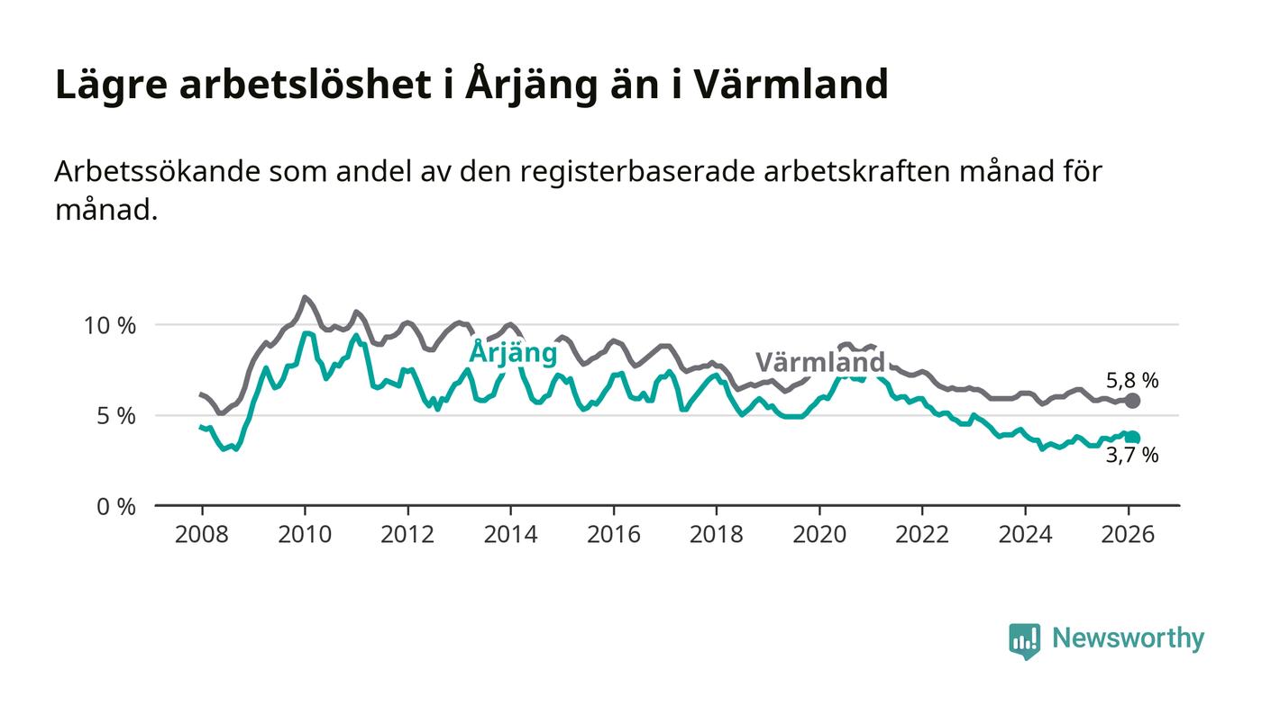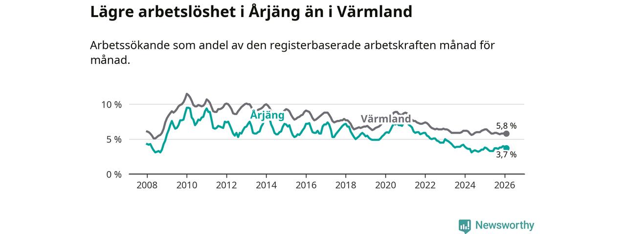Under februari månad rapporterade Årjängs kommun en total arbetslöshet på 3,7 procent. Det är i samma nivå som i februari i fjol. I Värmlands län däremot sjunker arbetslösheten