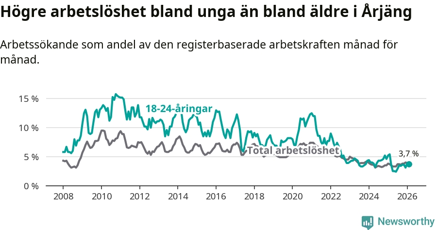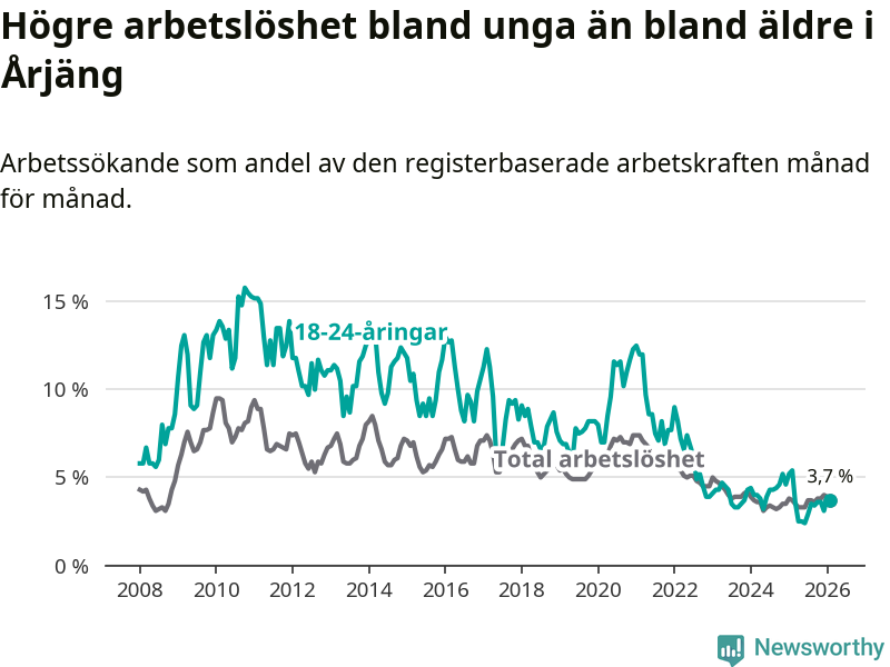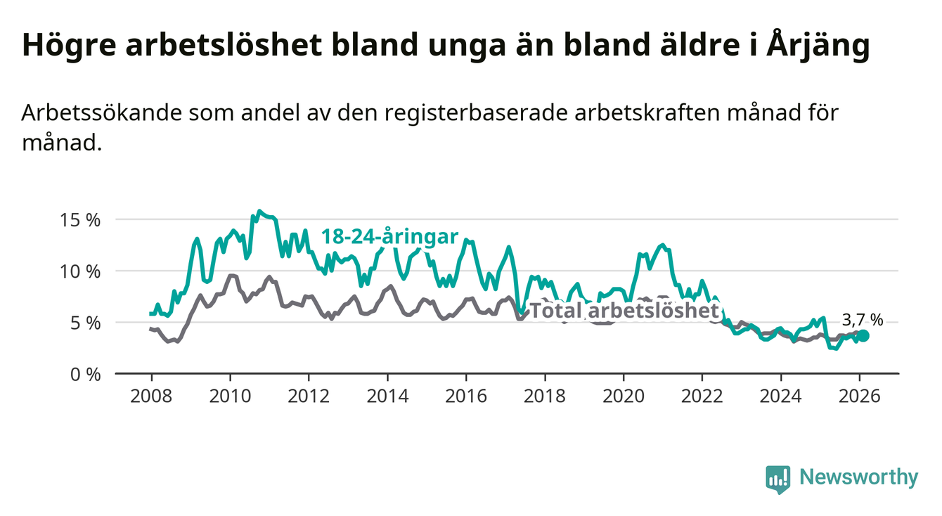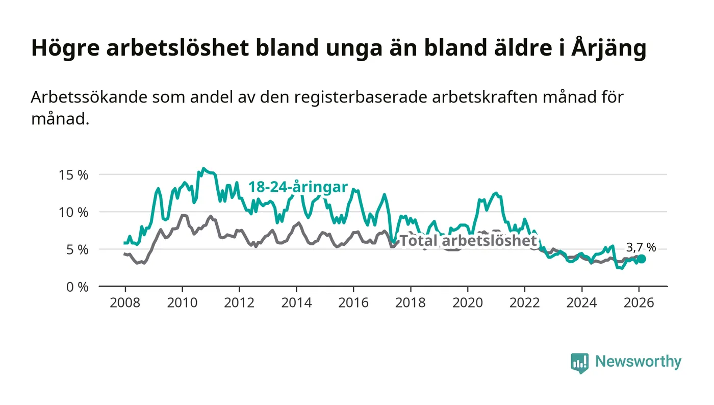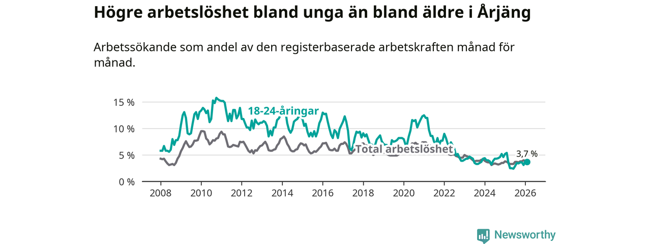 Till skillnad från den totala arbetslösheten sjunker arbetslösheten bland unga (−1,7 procentenheter). I februari var 3,7 procent av 18–24-åringarna inskrivna som arbetssökande (motsvarande 19 personer). Mäter vi antalet inskrivna ser vi en minskning med elva personer på ett års sikt.