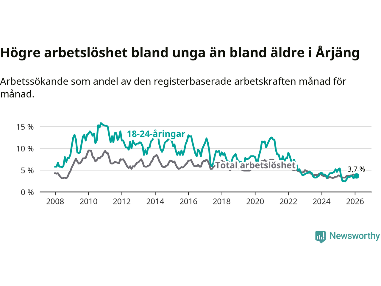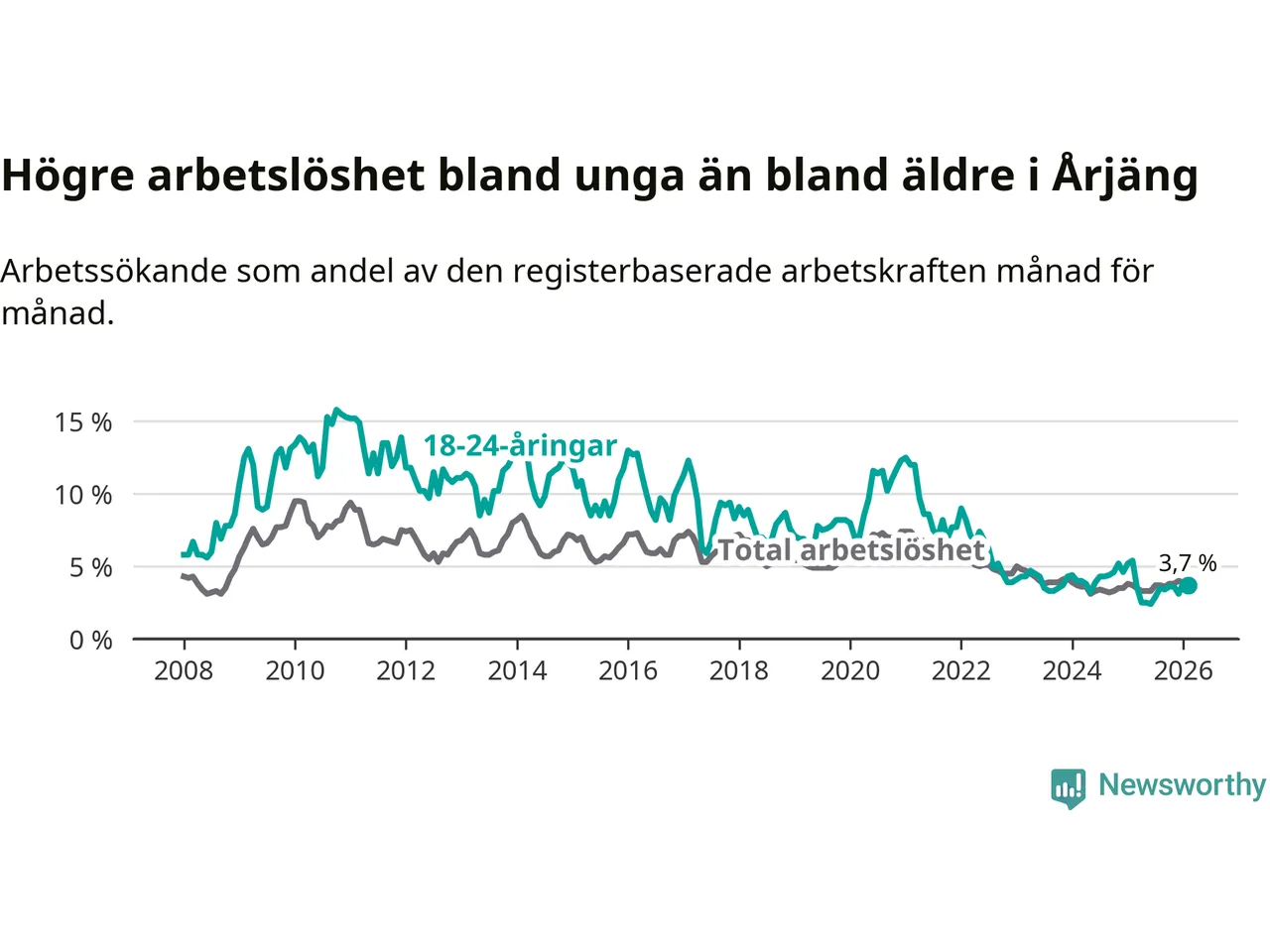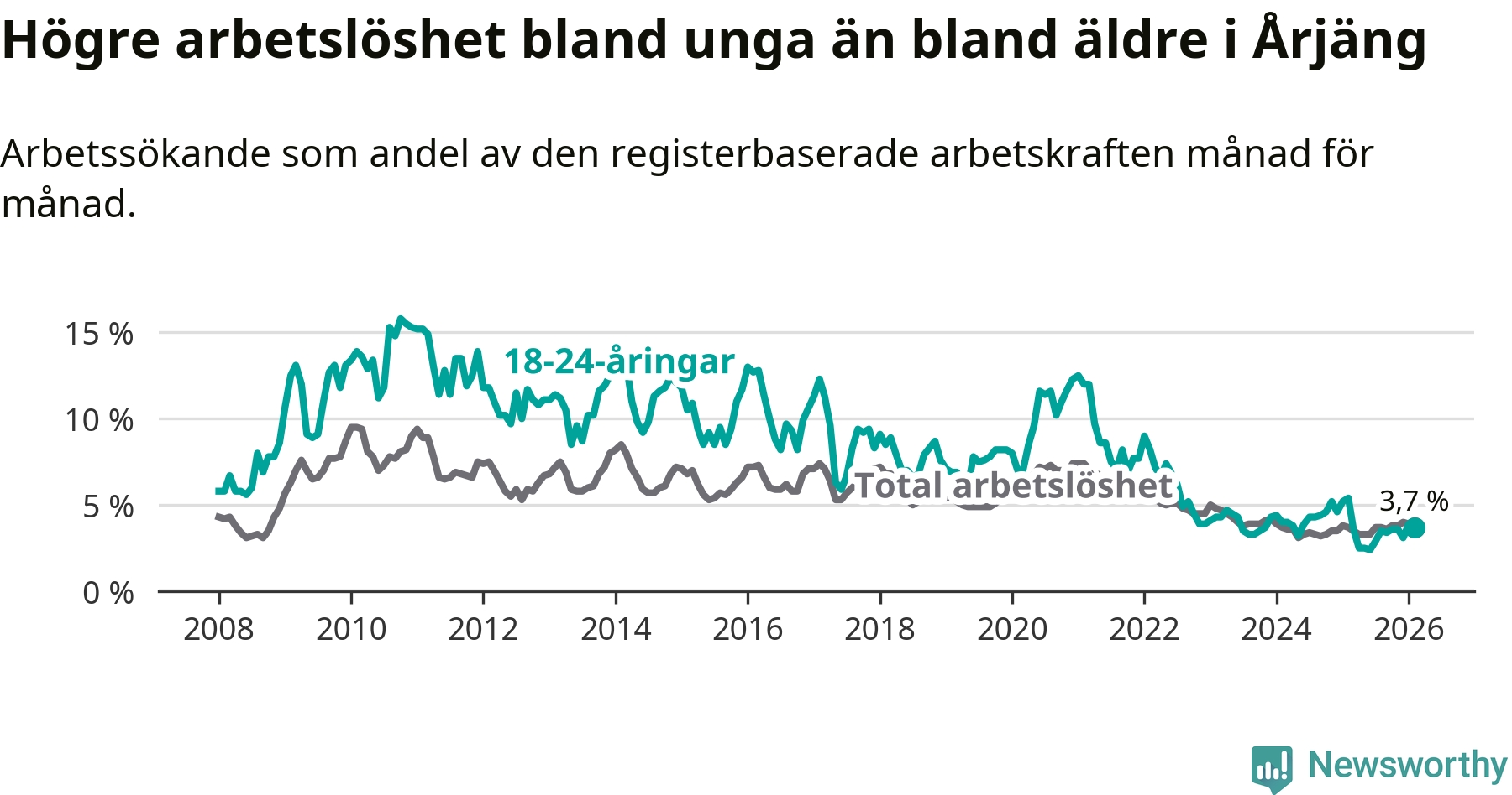 Till skillnad från den totala arbetslösheten sjunker arbetslösheten bland unga (−1,7 procentenheter). I februari var 3,7 procent av 18–24-åringarna inskrivna som arbetssökande (motsvarande 19 personer). Mäter vi antalet inskrivna ser vi en minskning med elva personer på ett års sikt.