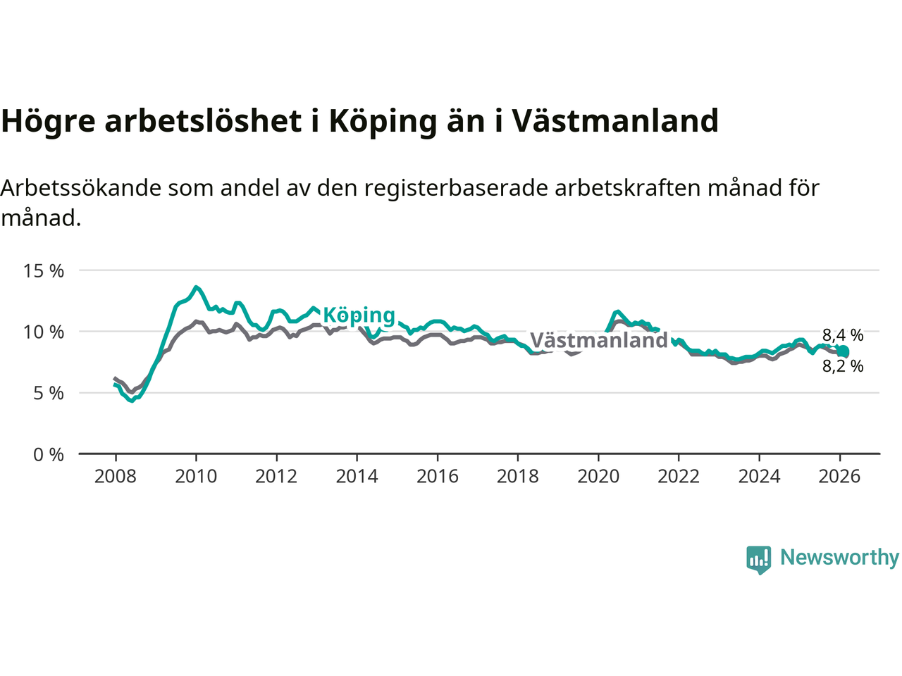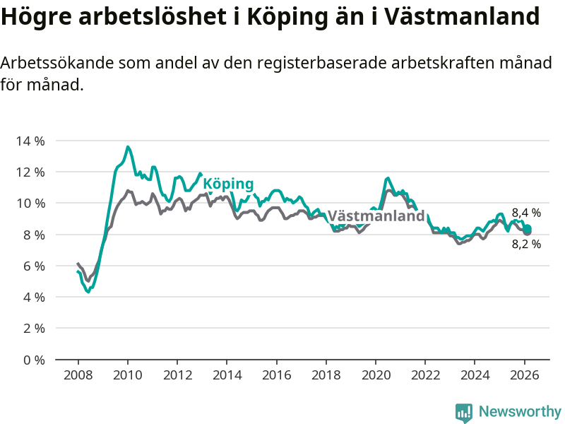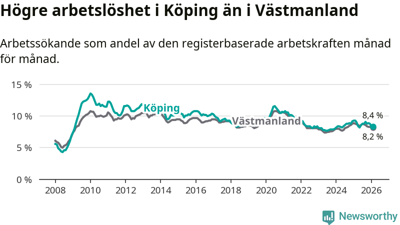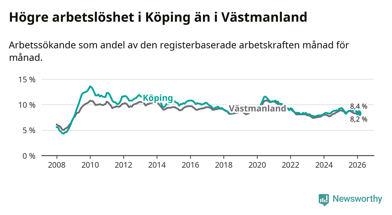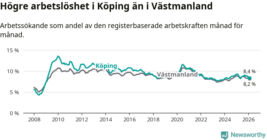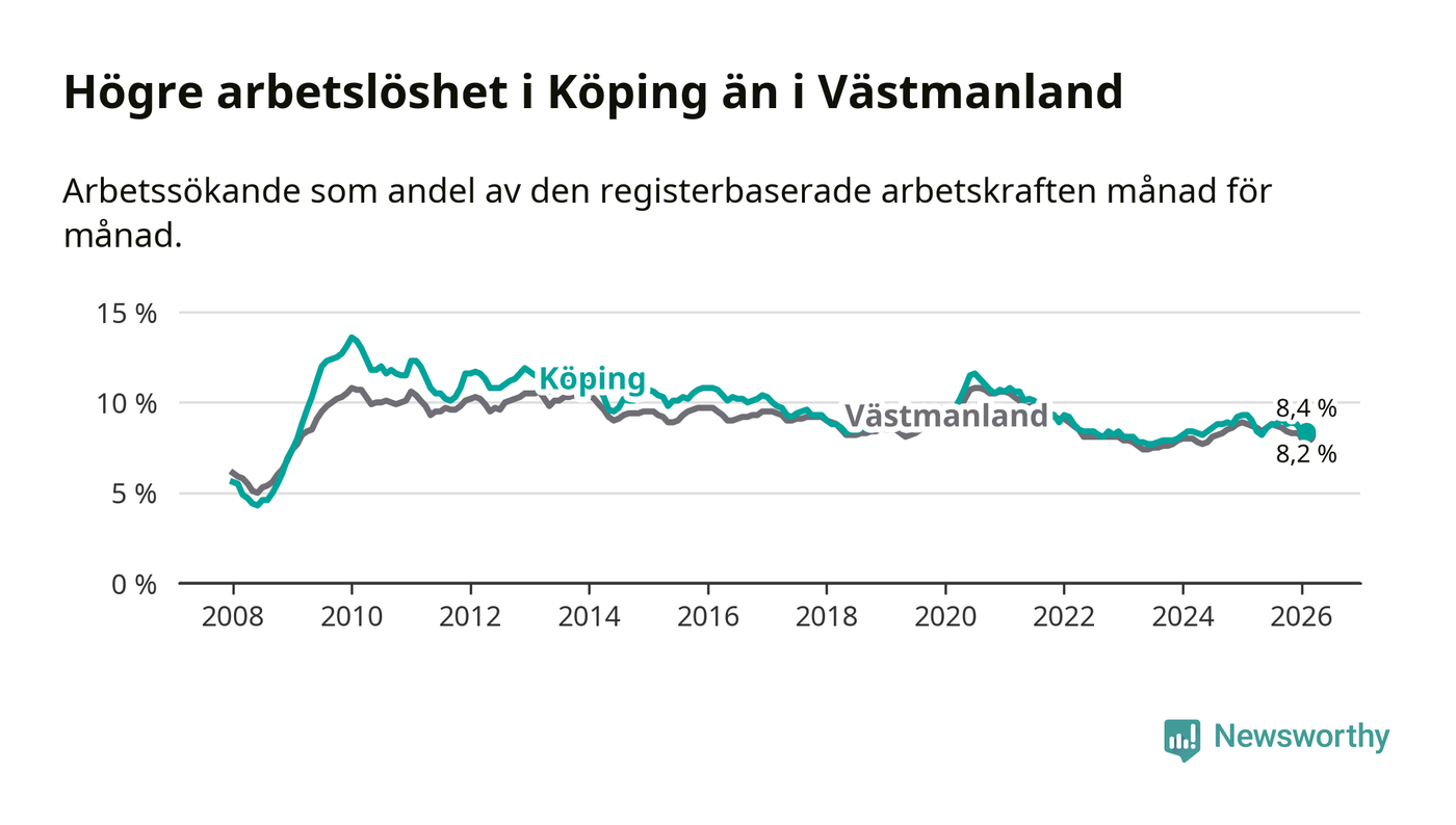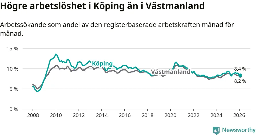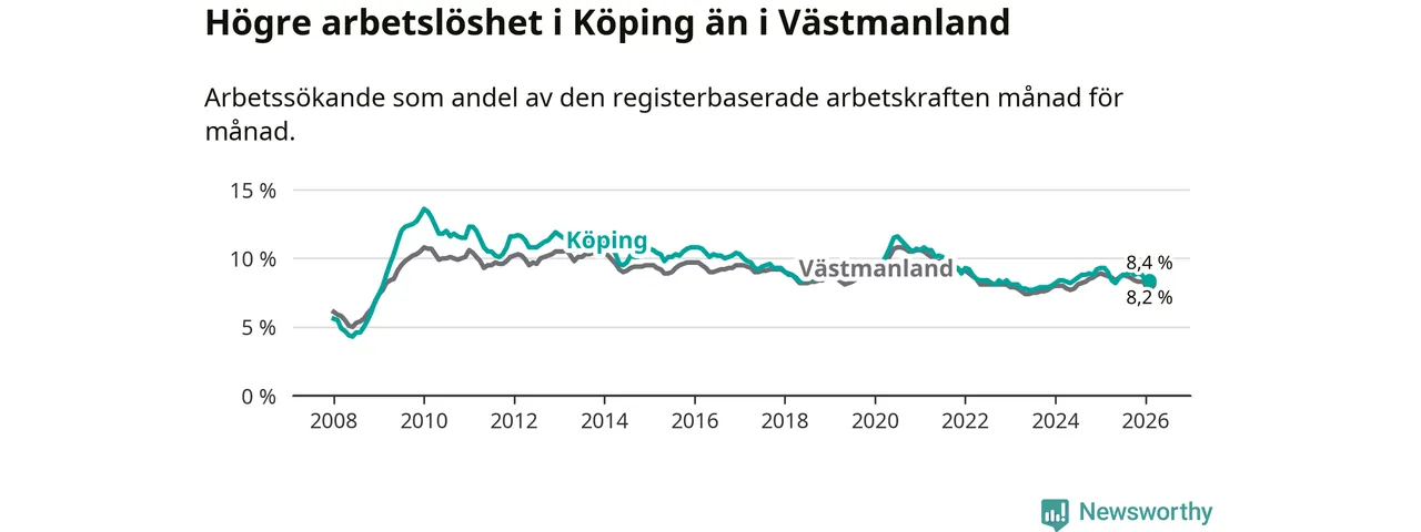 Under februari månad rapporterade Köpings kommun en total arbetslöshet på 8,4 procent. Det är en minskning jämfört med samma tidpunkt i fjol (−0,9 procentenheter). Även i Västmanlands län sjunker arbetslösheten .