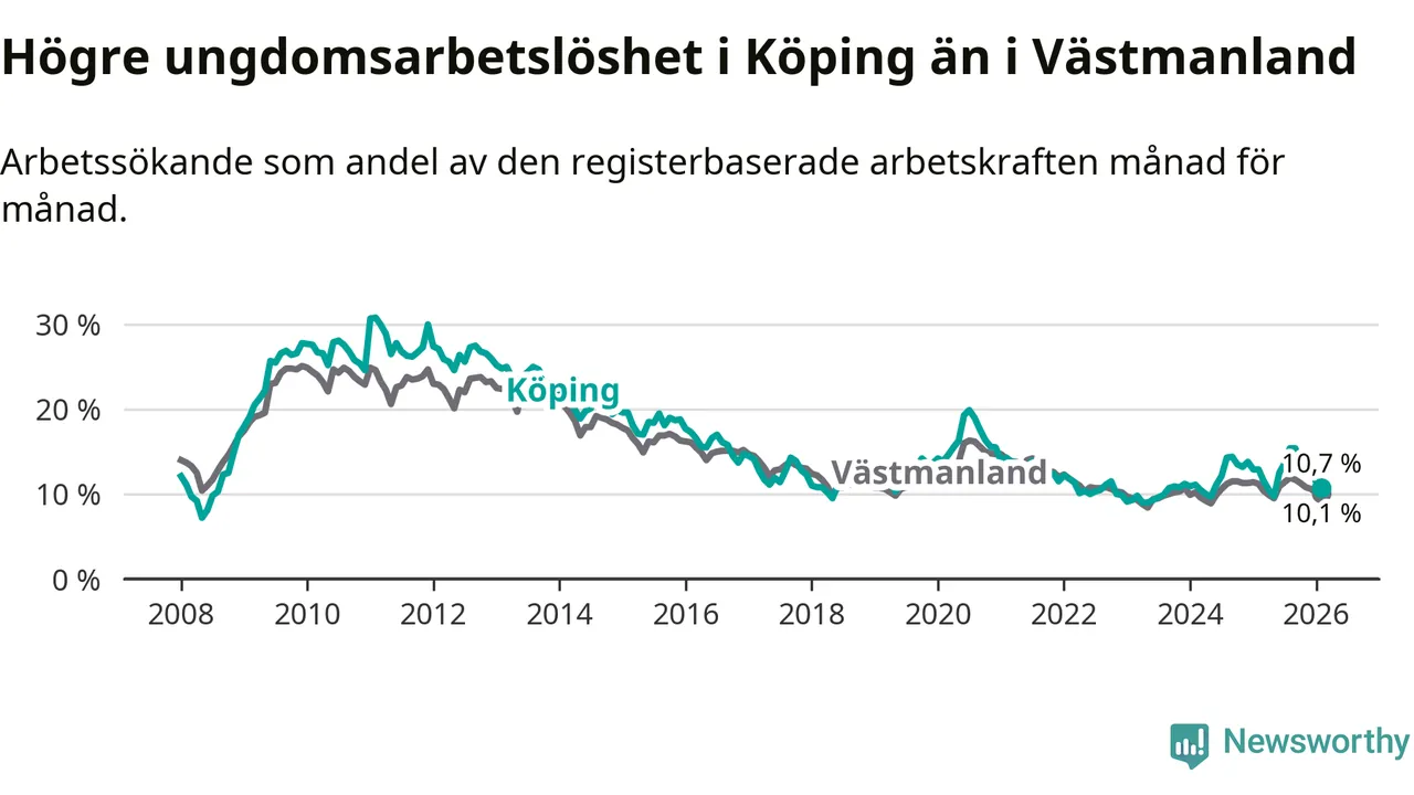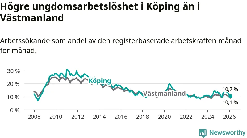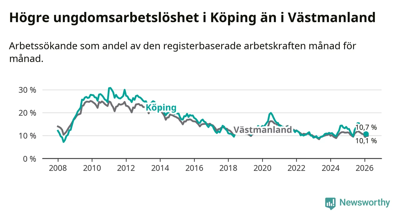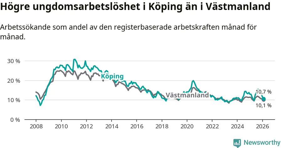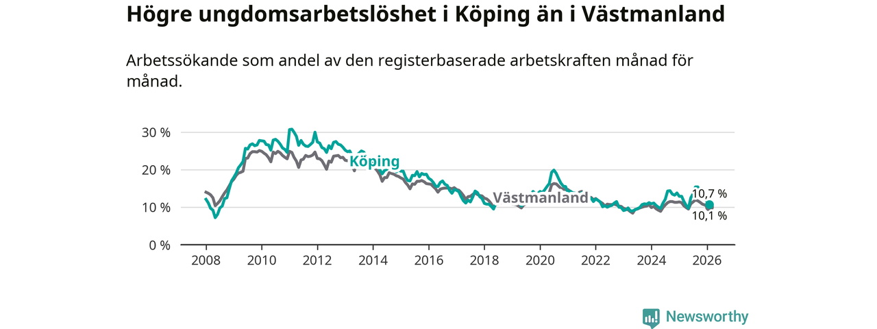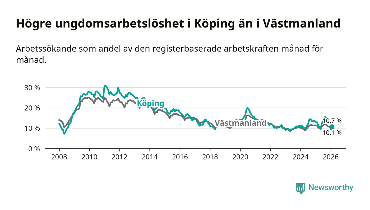 Precis som den totala arbetslösheten ligger ungdomsarbetslösheten i Köping högre än i Västmanland som helhet. Skillnaden mellan kommunen och länet är 0,6 procentenheter.