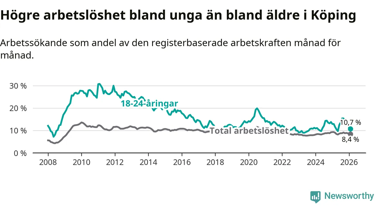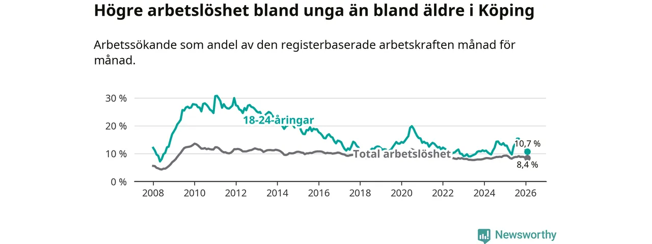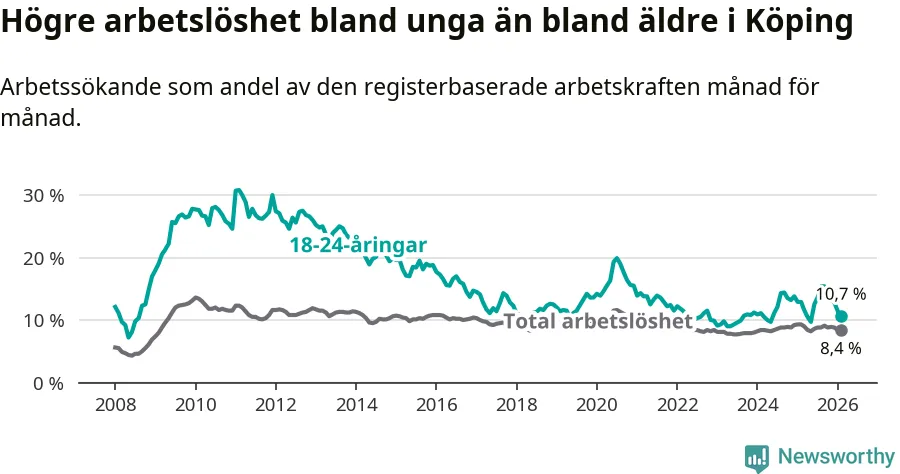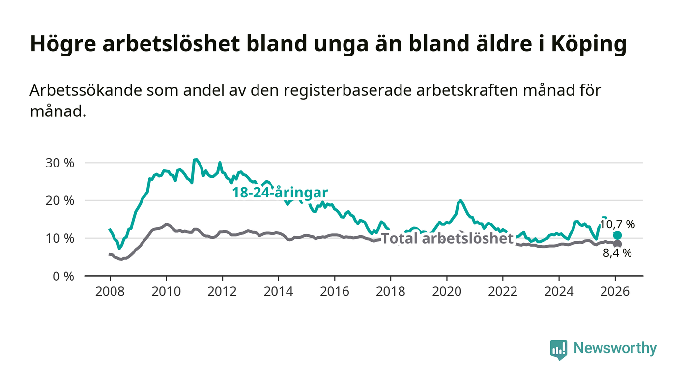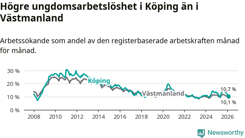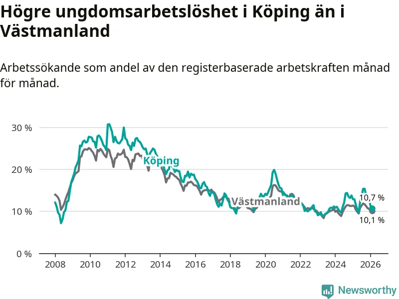 Precis som den totala arbetslösheten ligger ungdomsarbetslösheten i Köping högre än i Västmanland som helhet. Skillnaden mellan kommunen och länet är 0,6 procentenheter.