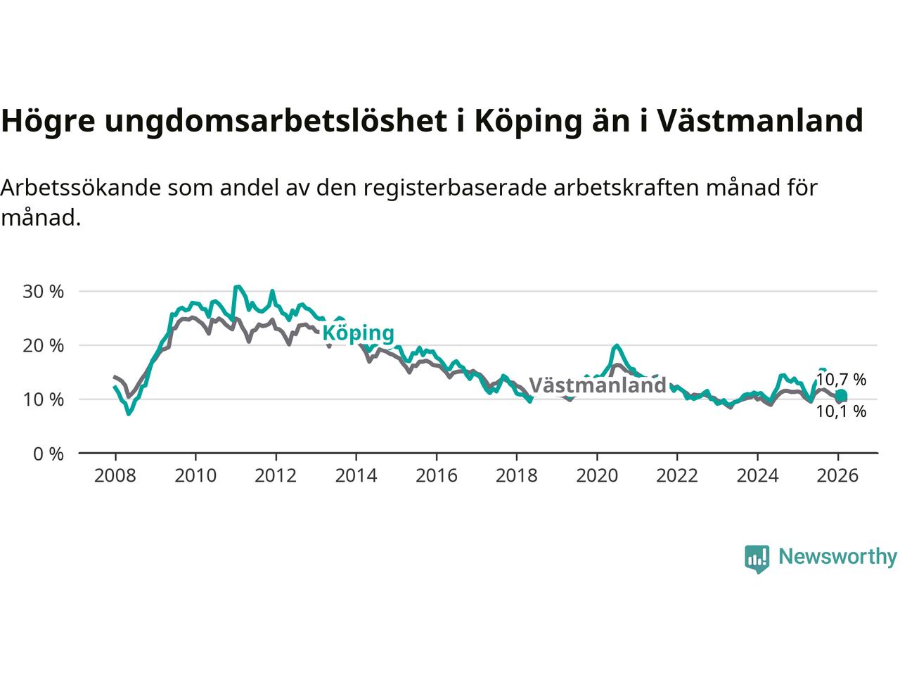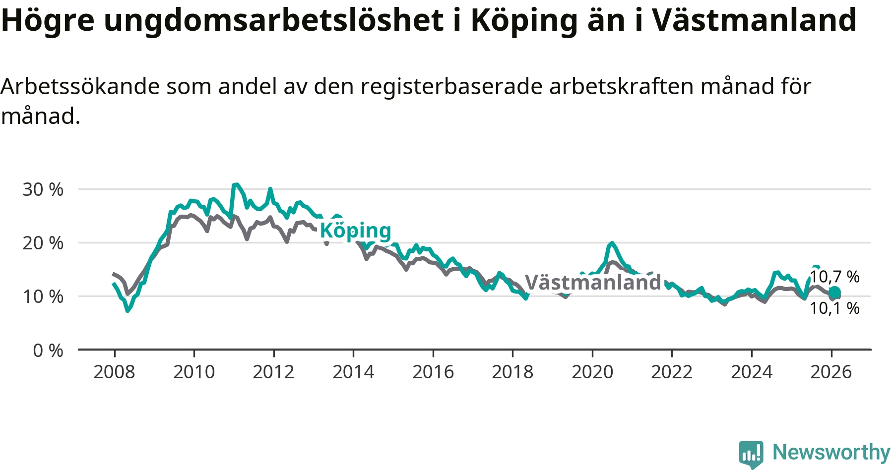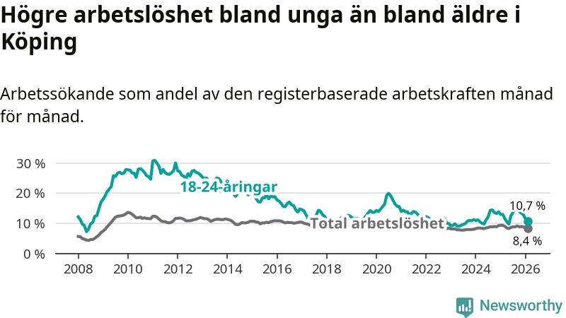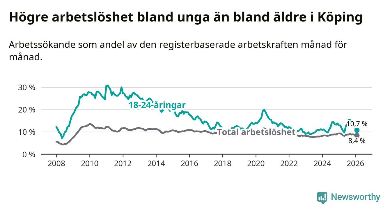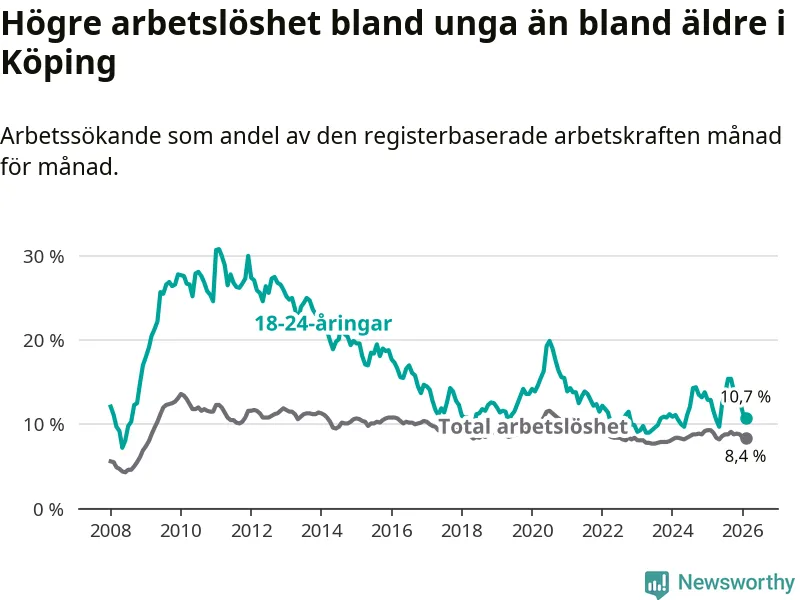 Precis som den totala arbetslösheten ligger ungdomsarbetslösheten i Köping högre än i Västmanland som helhet. Skillnaden mellan kommunen och länet är 0,6 procentenheter.