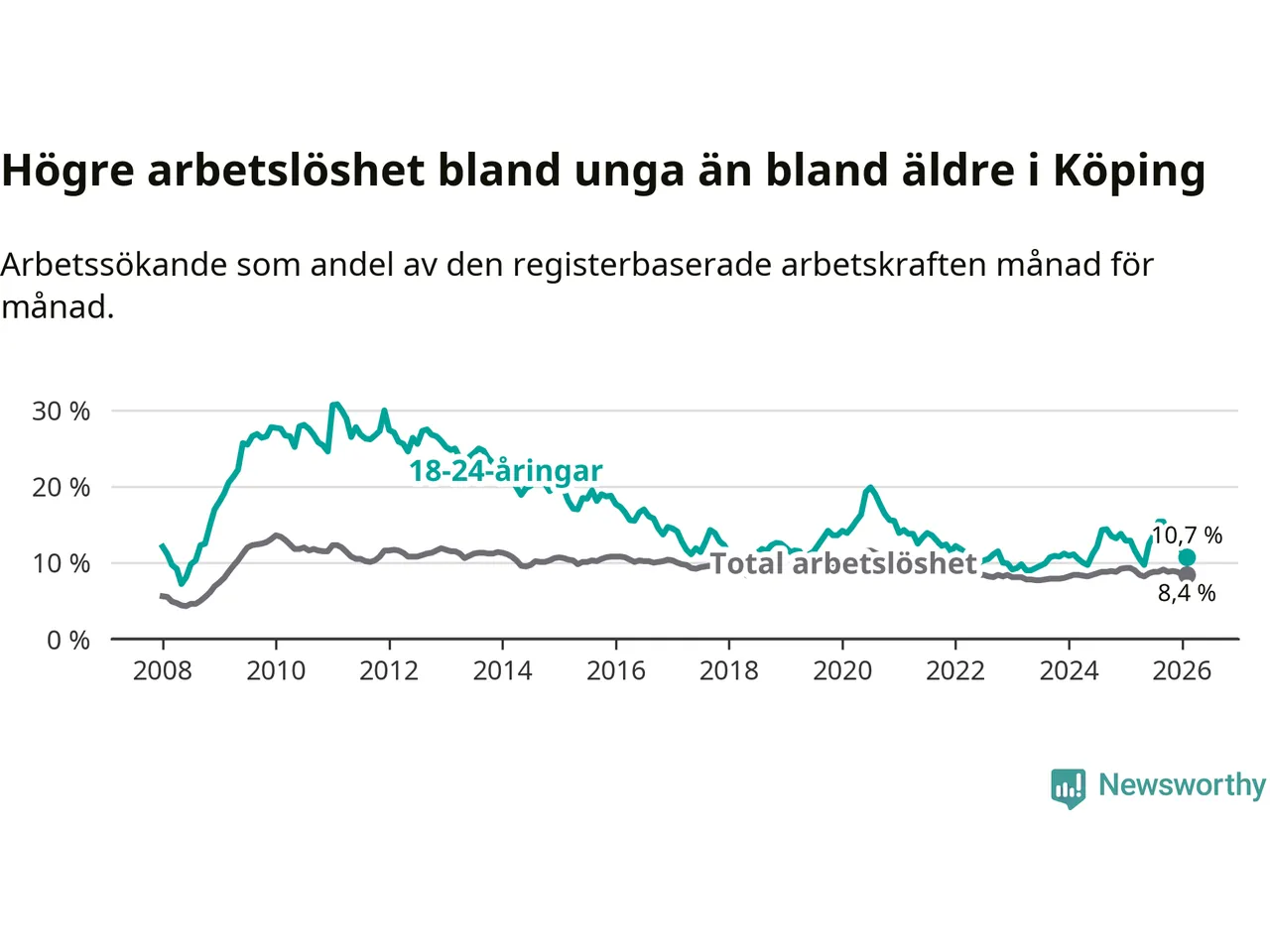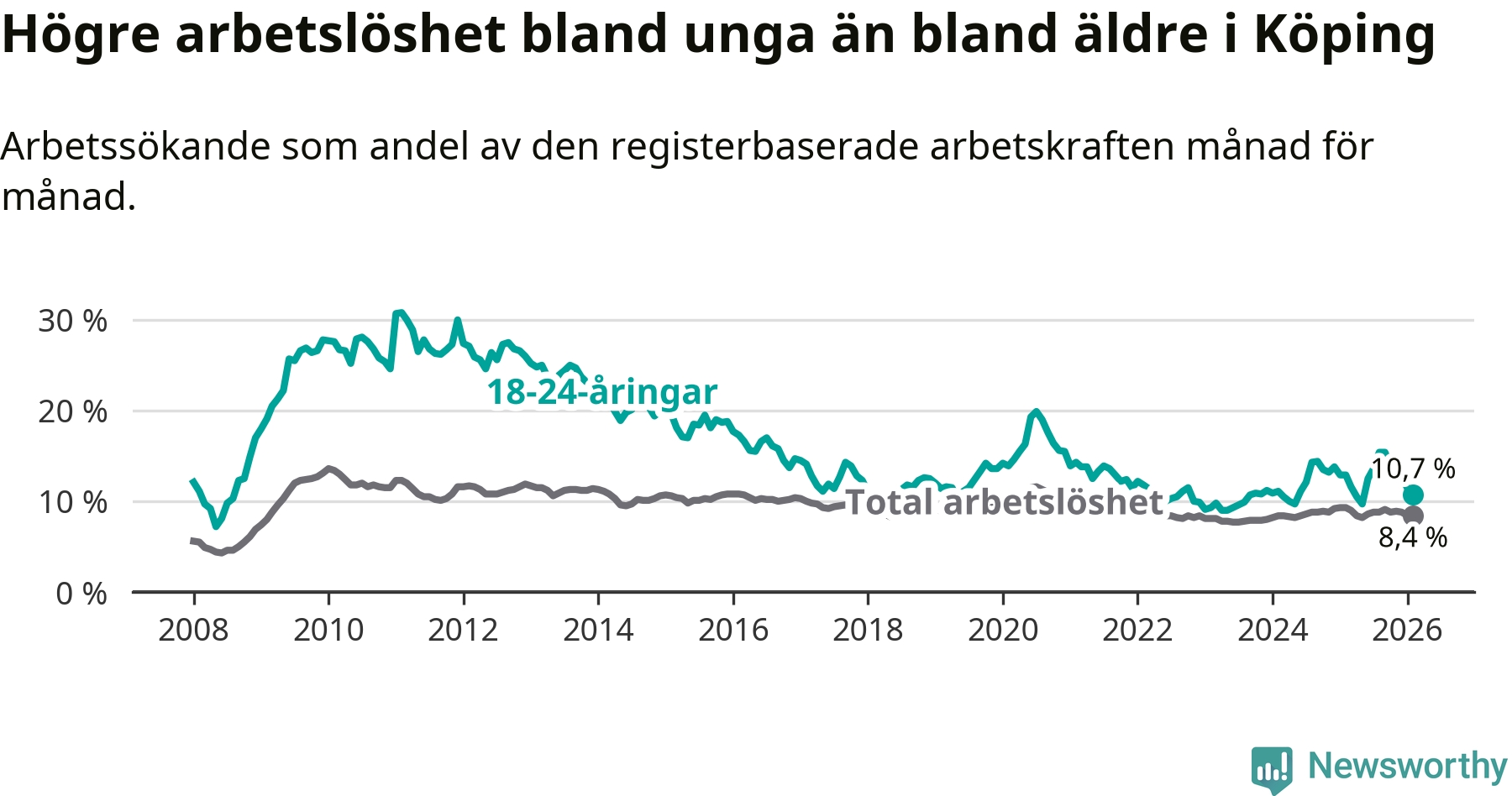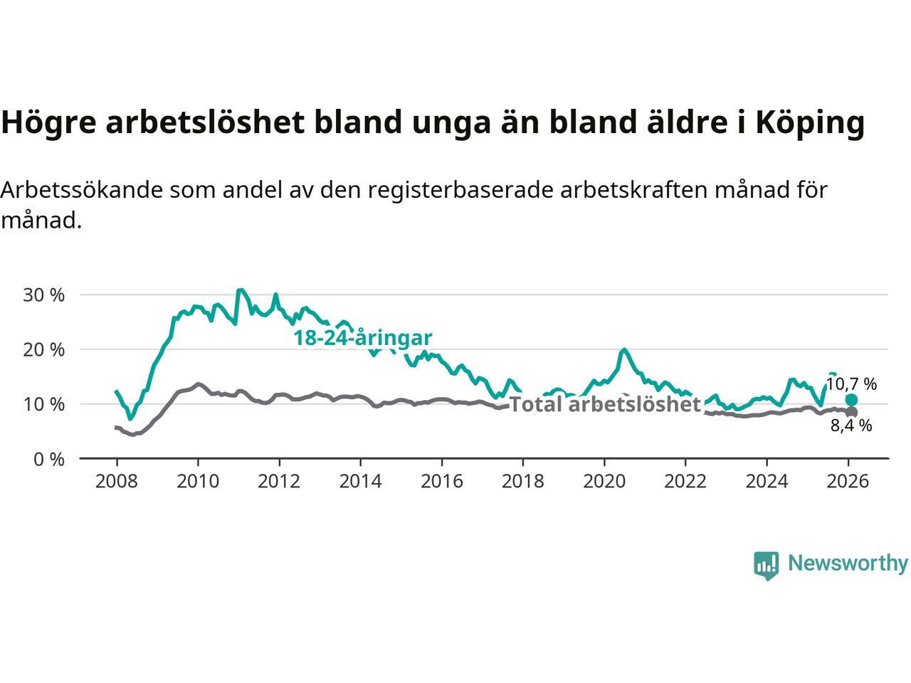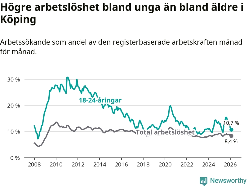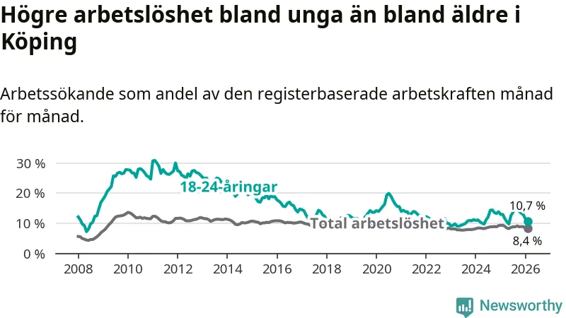 Precis som den totala arbetslösheten sjunker arbetslösheten bland unga (−2,2 procentenheter). I februari var 10,7 procent av 18–24-åringarna inskrivna som arbetssökande (motsvarande 133 personer). Mäter vi antalet inskrivna ser vi en minskning med 37 personer på ett års sikt.