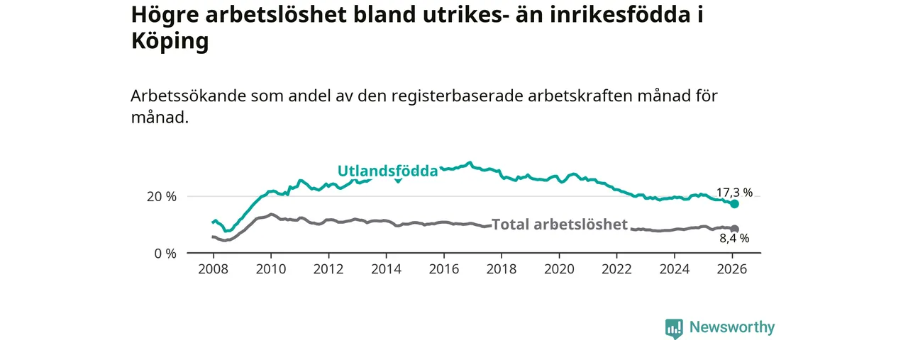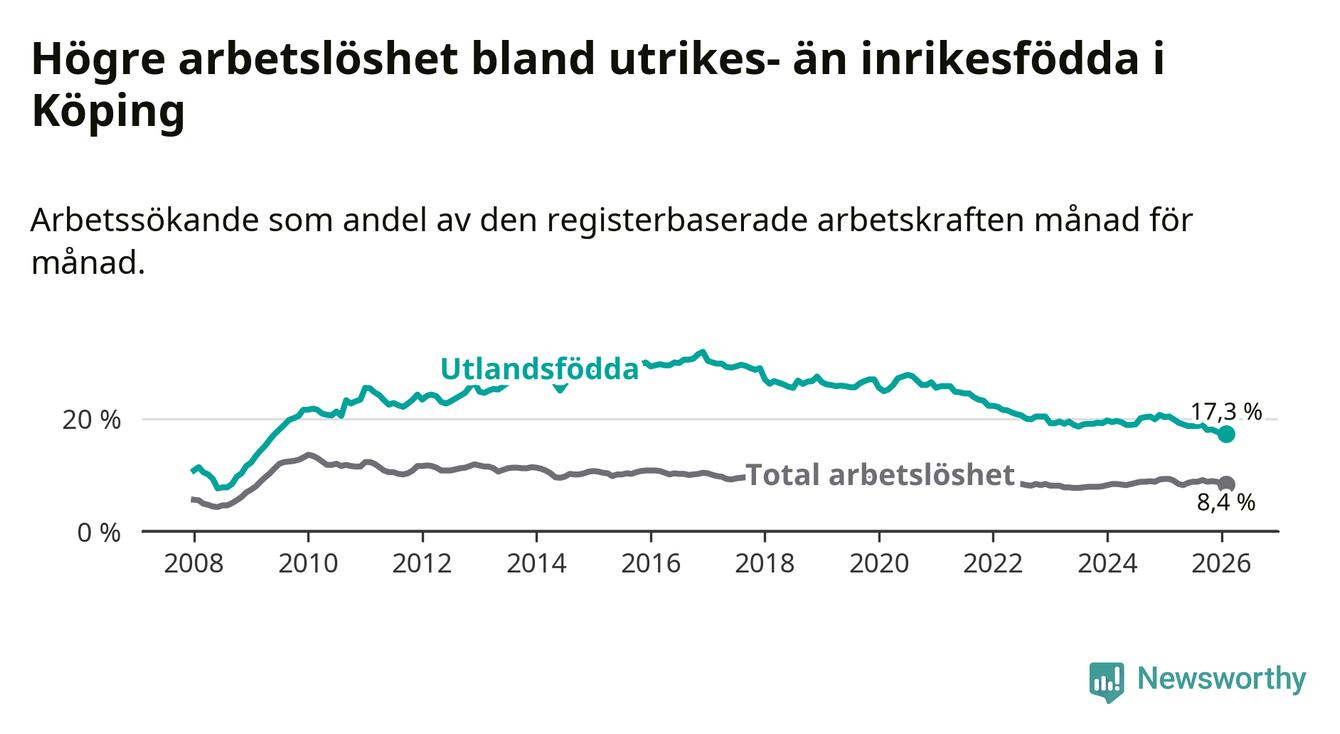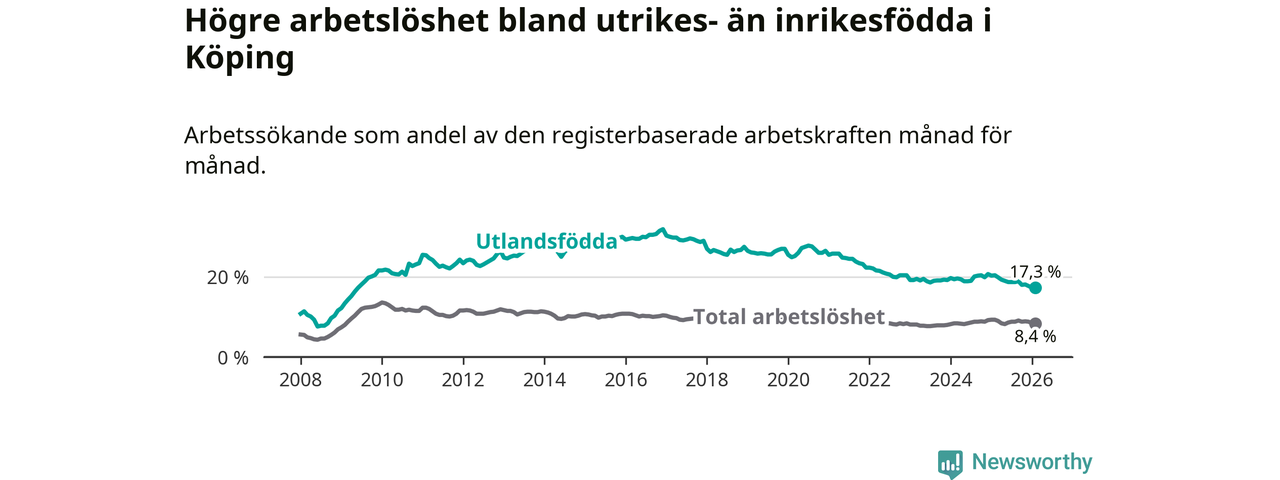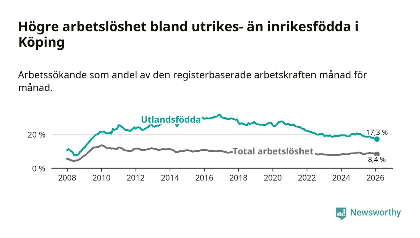 Arbetslösheten bland utlandsfödda var 17,3 procent i Köping under februari månad, motsvarande 525 av 3 035 personer. Det är 3,1 procentenheter färre än vid samma tidpunkt i fjol (−92 om man räknar personer). Därmed är de utlandsföddas arbetslöshet lägre än vid samma tidpunkt i fjol för nionde månaden i följd. Sedan maj 2025 har arbetslösheten bland utlandsfödda minskat från 19,0 till 17,3 procent.