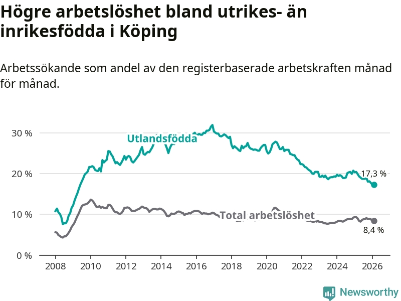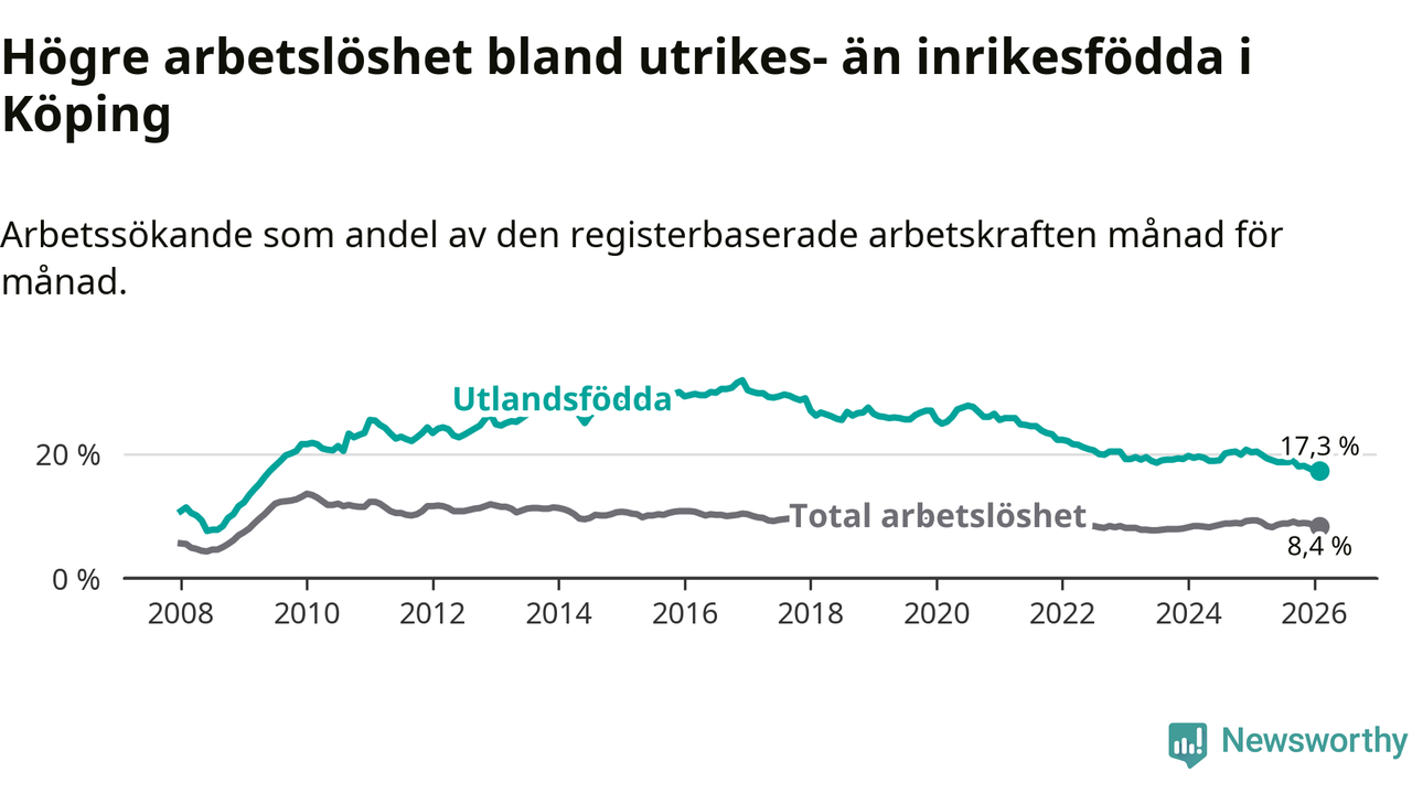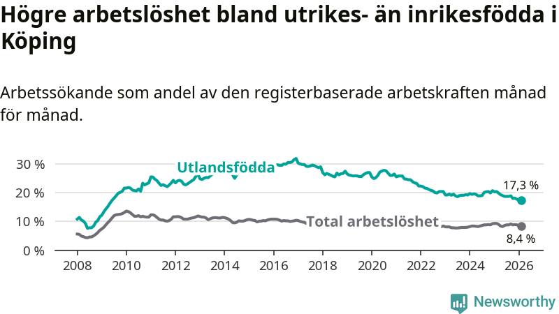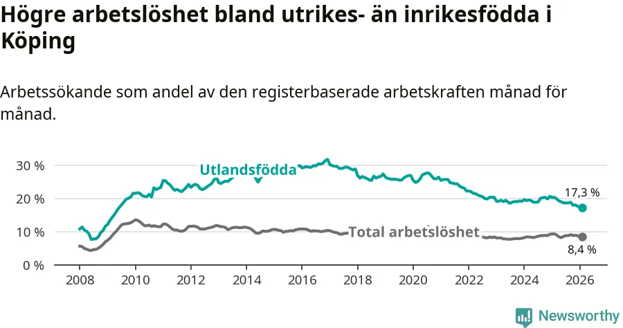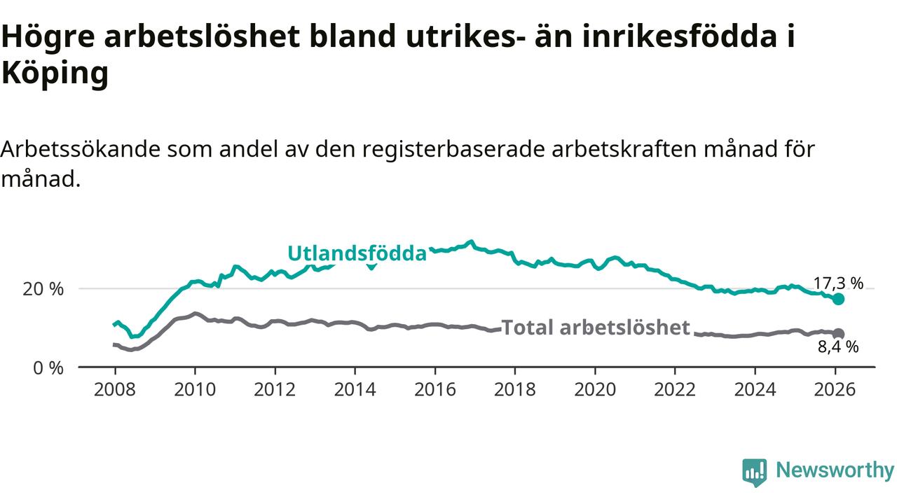 Arbetslösheten bland utlandsfödda var 17,3 procent i Köping under februari månad, motsvarande 525 av 3 035 personer. Det är 3,1 procentenheter färre än vid samma tidpunkt i fjol (−92 om man räknar personer). Därmed är de utlandsföddas arbetslöshet lägre än vid samma tidpunkt i fjol för nionde månaden i följd. Sedan maj 2025 har arbetslösheten bland utlandsfödda minskat från 19,0 till 17,3 procent.