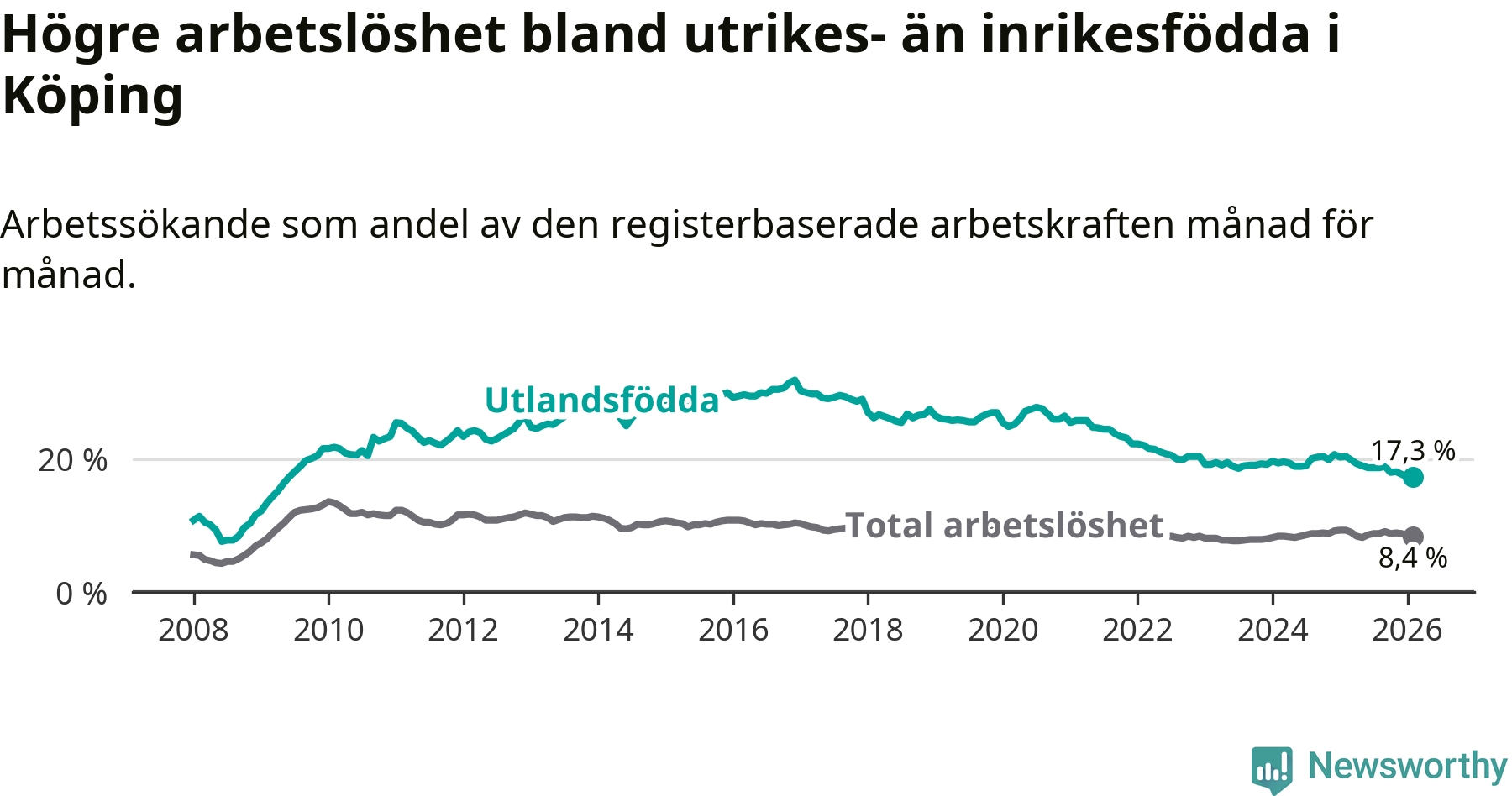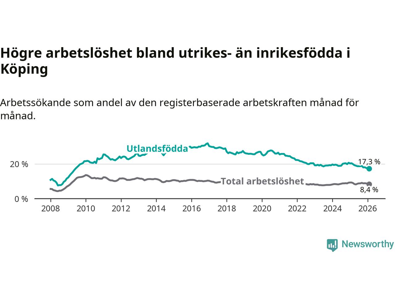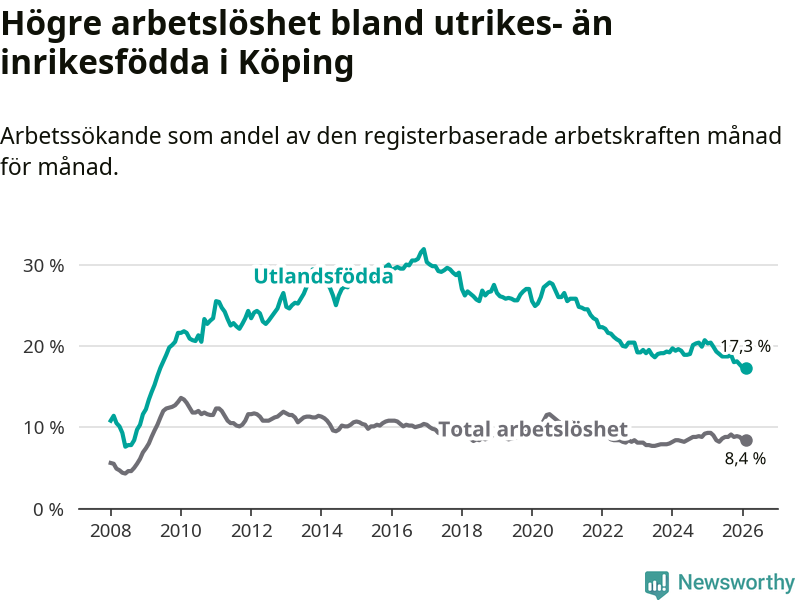 Läs mer om arbetslösheten bland utlandsfödda längre ner i den här texten.