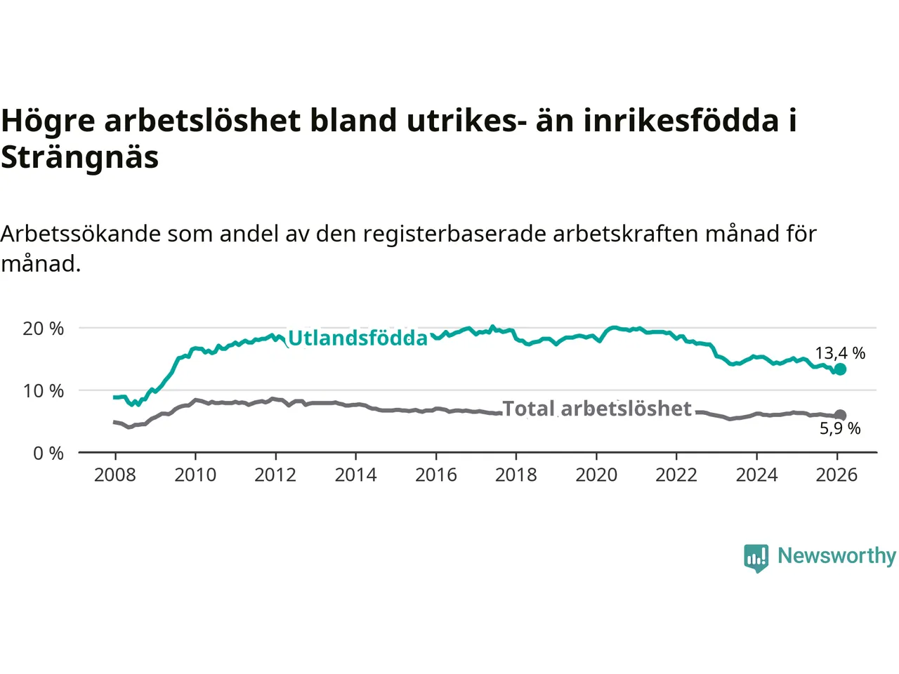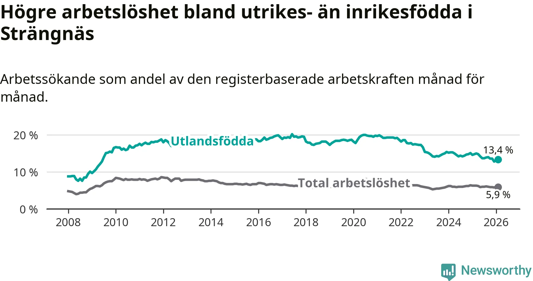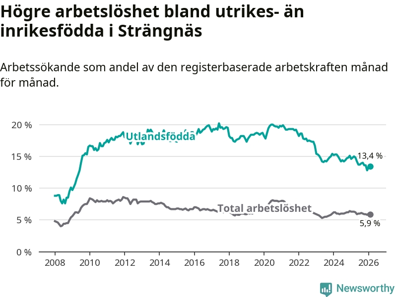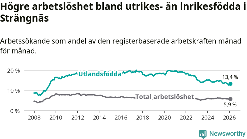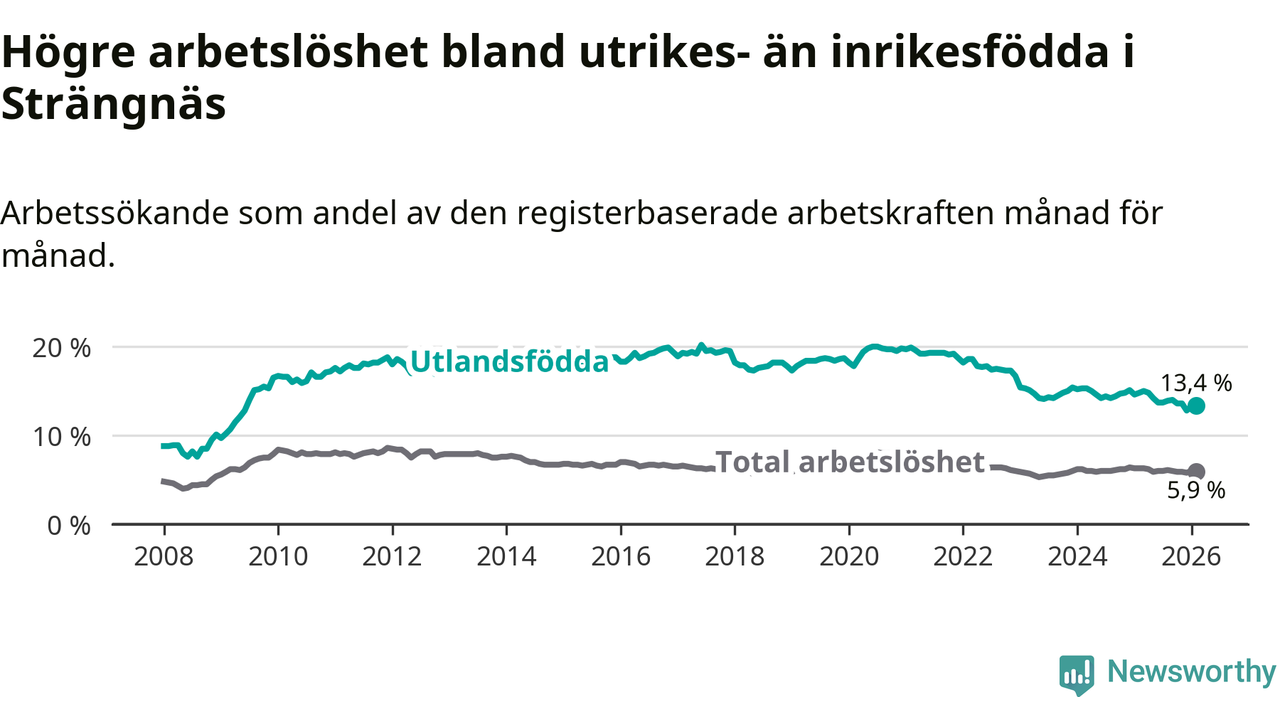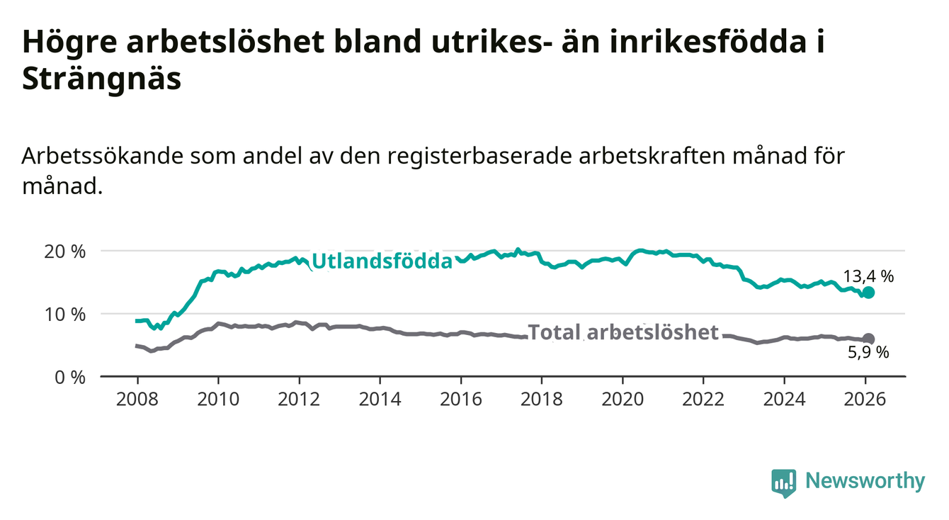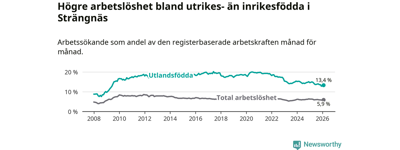 Skillnaden i arbetslöshet mellan utrikesfödda och hela befolkningen är 7,5 procentenheter i Strängnäs. Det är en mindre skillnad än för ett år sedan (−1,0 procentenheter).