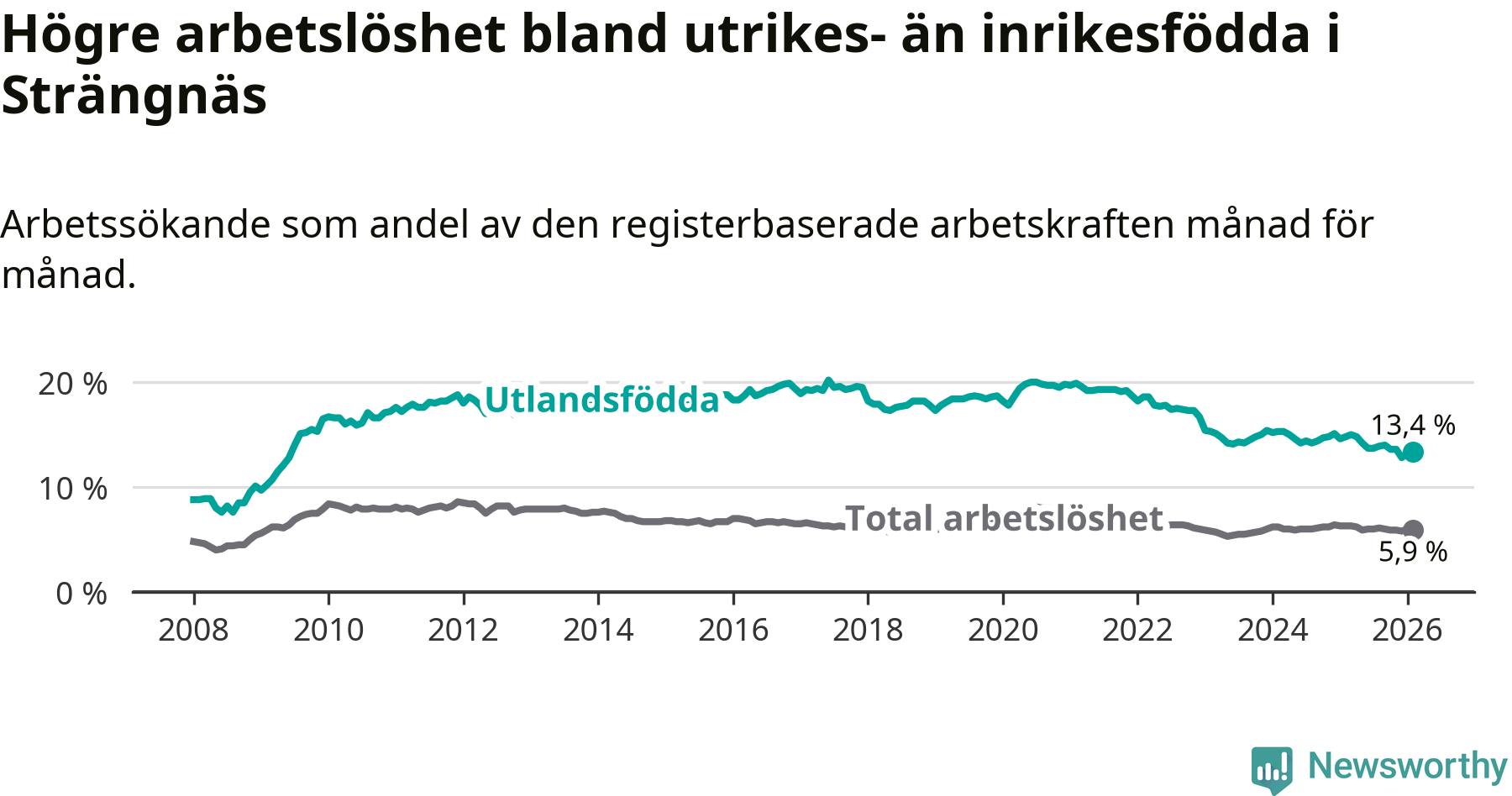 Arbetslösheten bland utlandsfödda var 13,4 procent i Strängnäs under februari månad, motsvarande 507 av 3 784 personer. Det är 1,4 procentenheter färre än vid samma tidpunkt i fjol (−46 om man räknar personer). Därmed är de utlandsföddas arbetslöshet lägre än vid samma tidpunkt i fjol för 18:e månaden i följd.