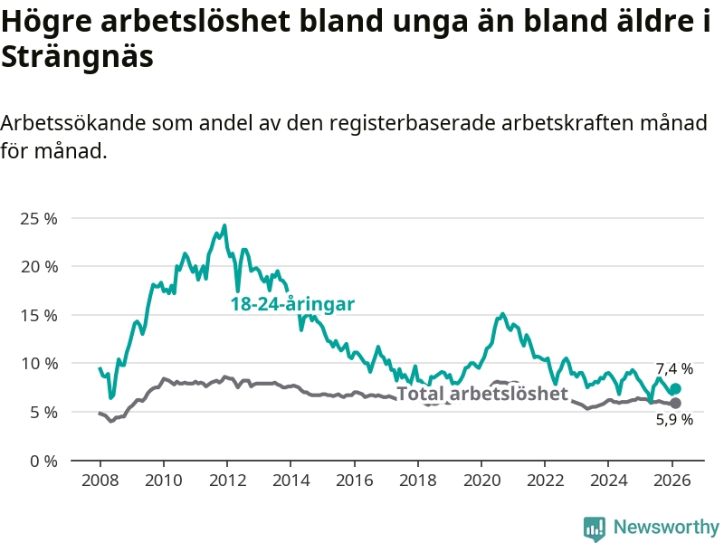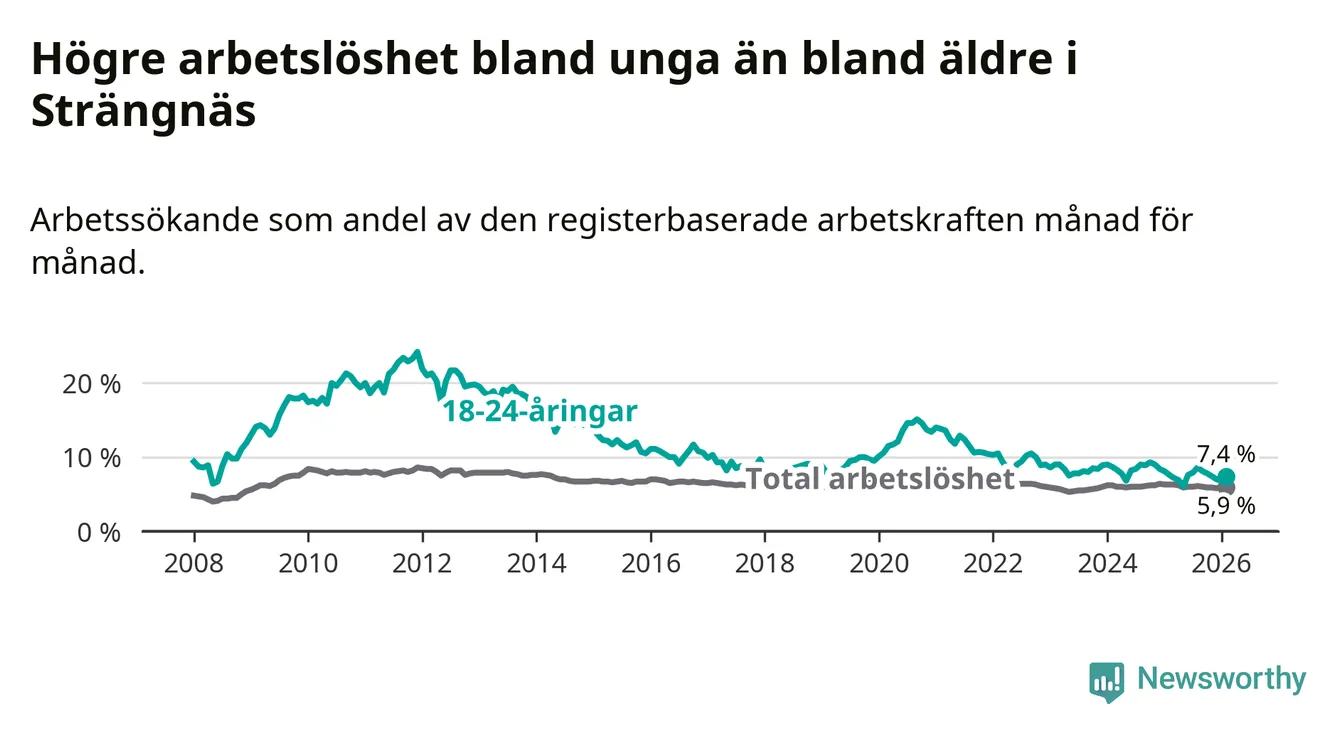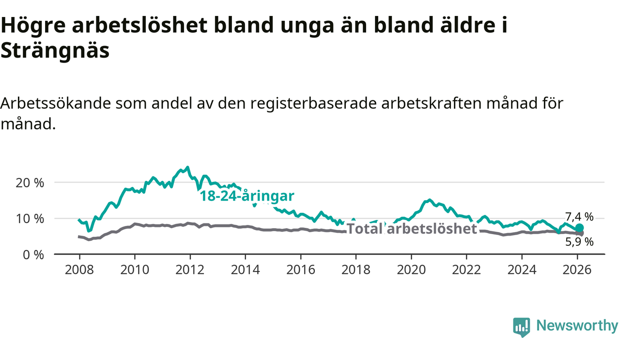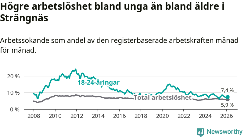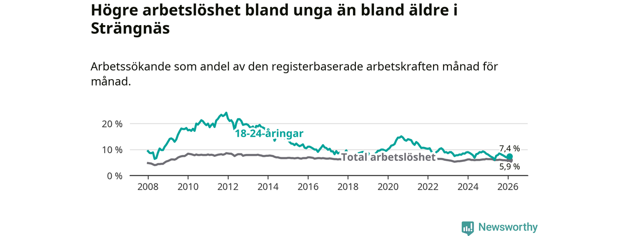 I och med den senaste månadens nedgång har de ungas arbetslöshet i Strängnäs sjunkit 15 månader i följd (ner från 9,0 procent i november 2024 till 7,4 procent nu).