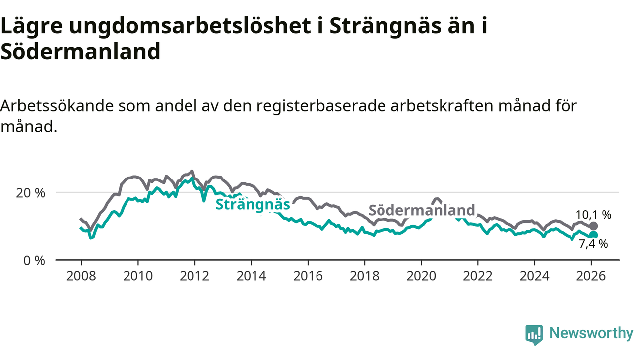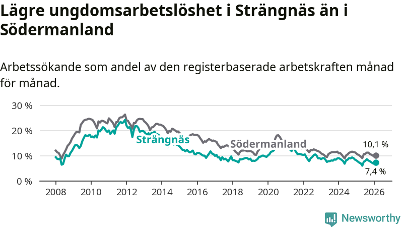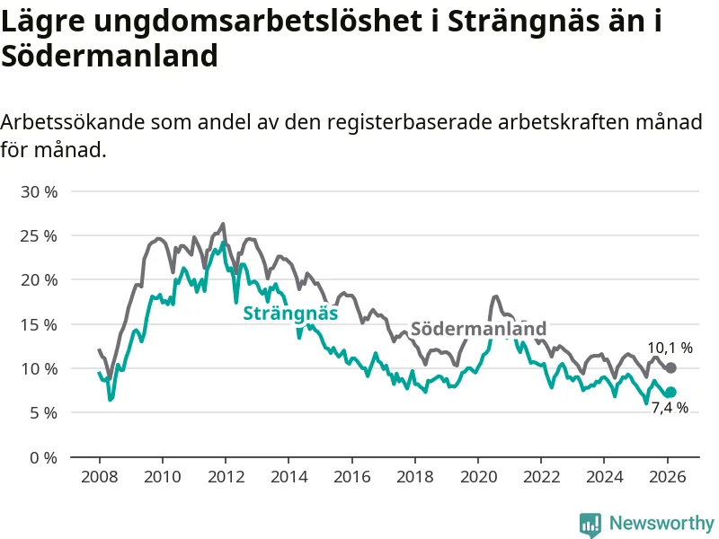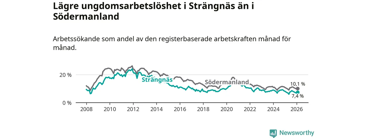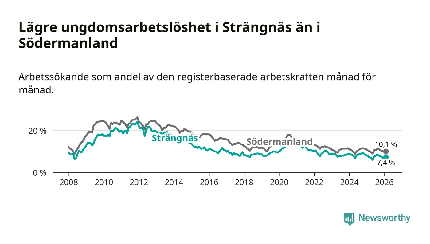 Precis som den totala arbetslösheten ligger ungdomsarbetslösheten i Strängnäs lägre än i Södermanland som helhet. Skillnaden mellan kommunen och länet är 2,7 procentenheter.