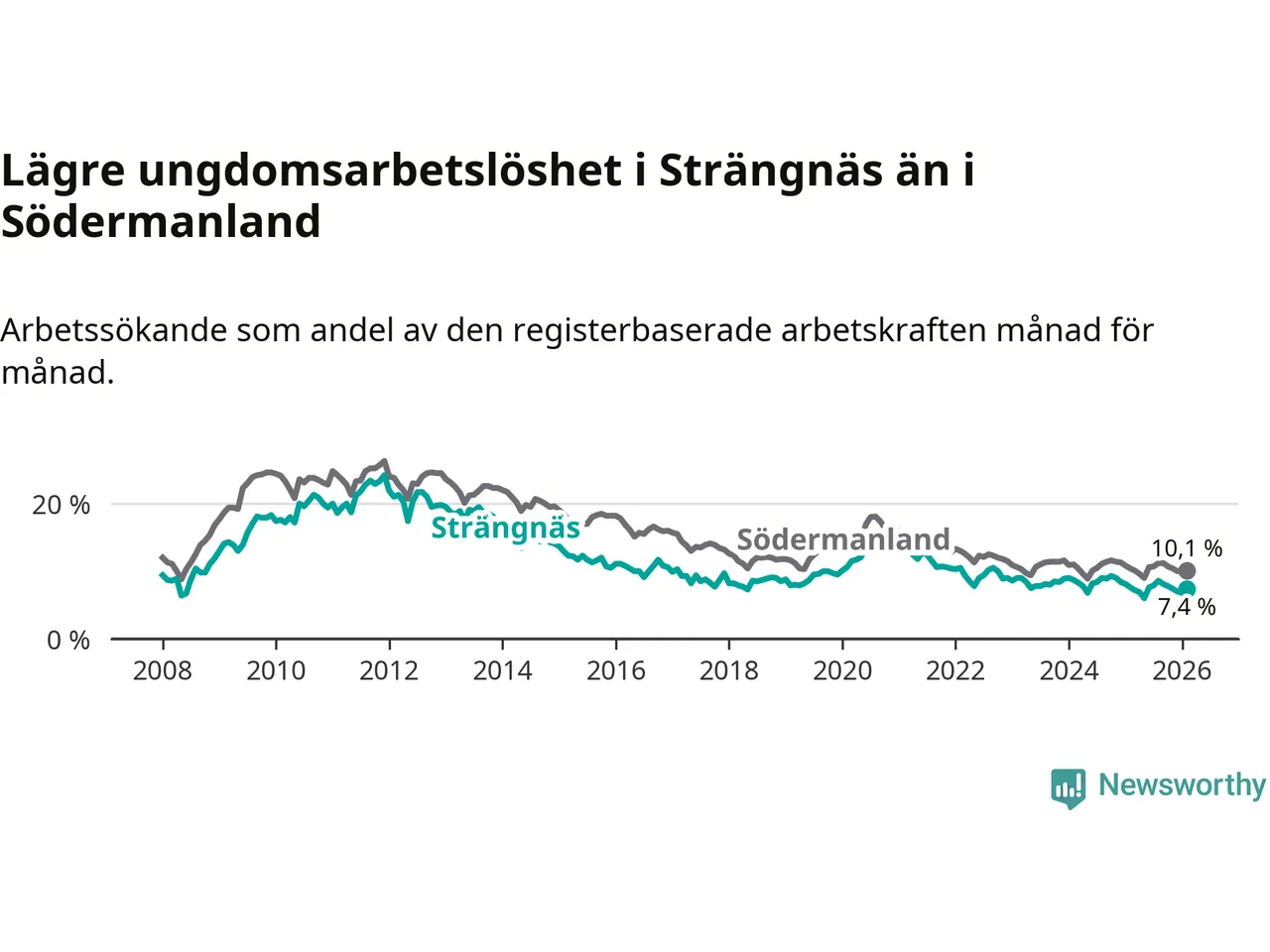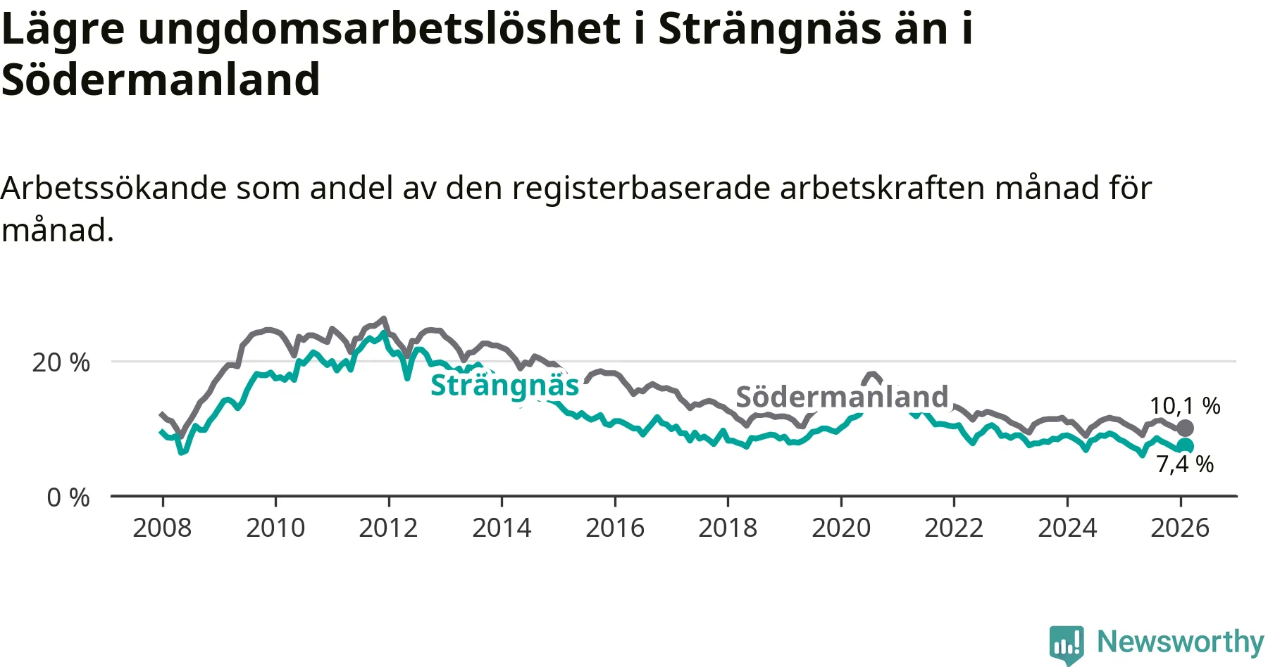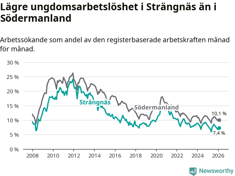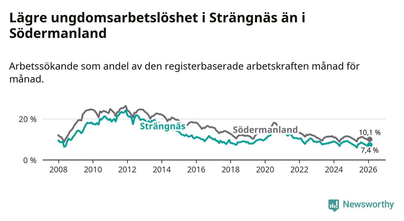 Precis som den totala arbetslösheten ligger ungdomsarbetslösheten i Strängnäs lägre än i Södermanland som helhet. Skillnaden mellan kommunen och länet är 2,7 procentenheter.