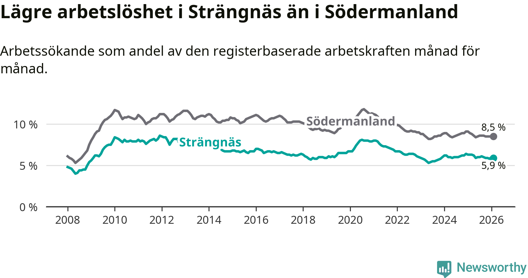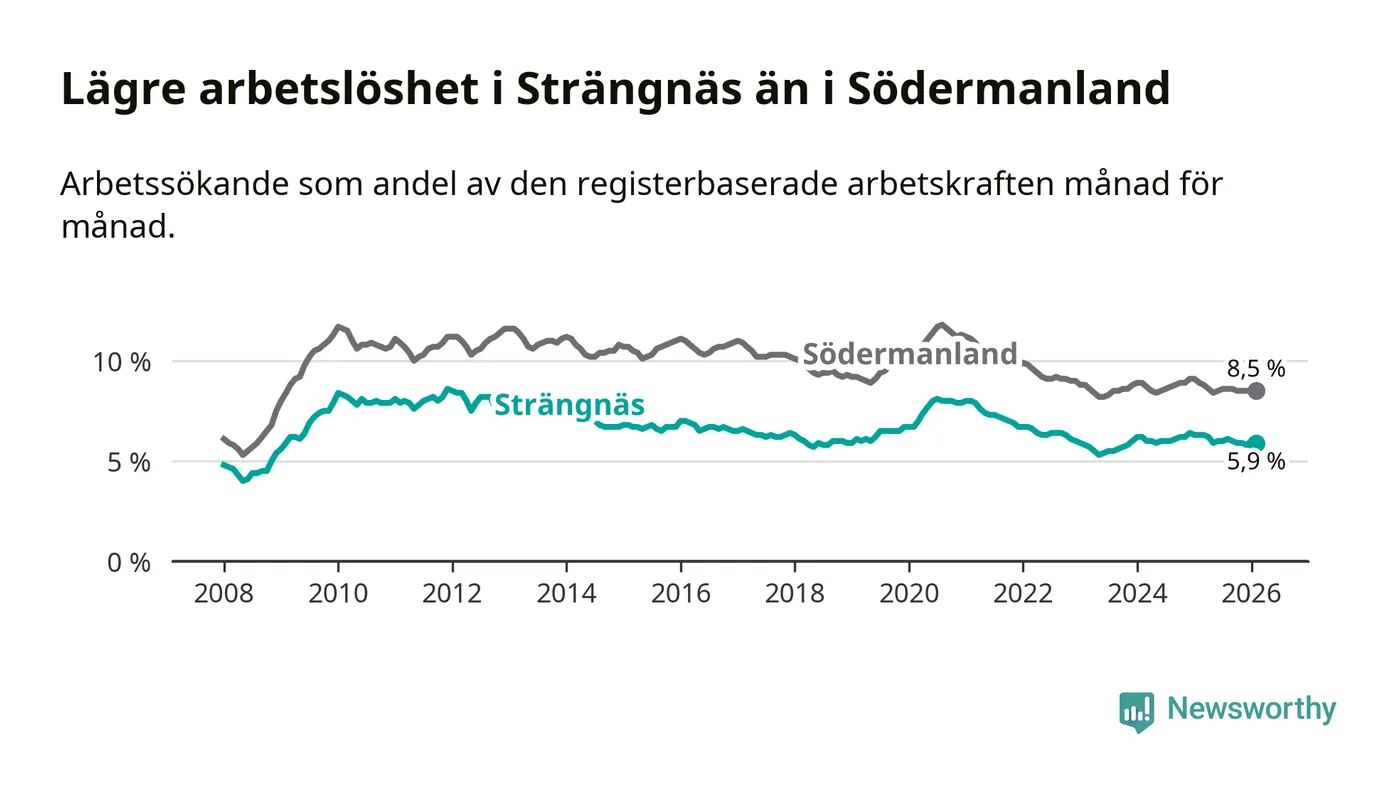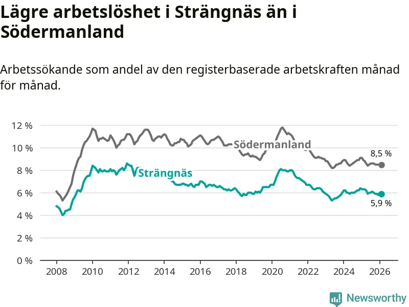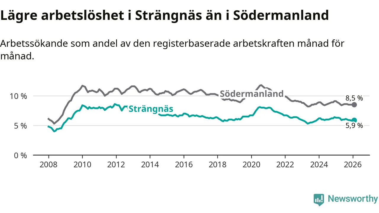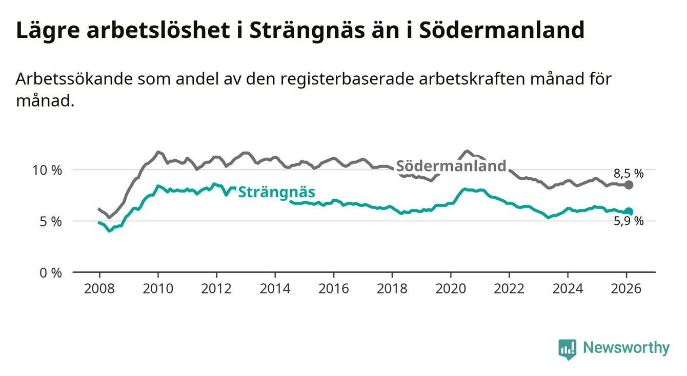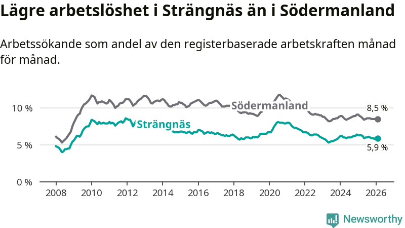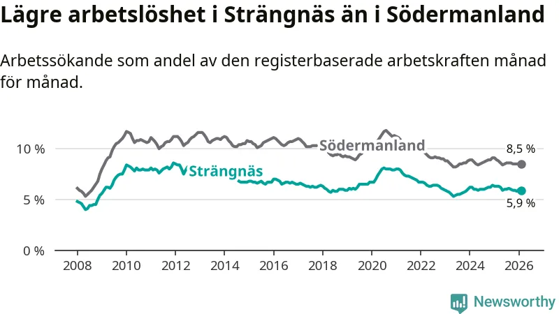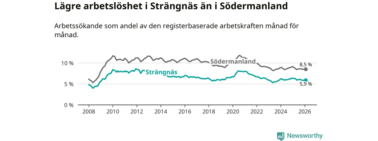Under februari månad rapporterade Strängnäs kommun en total arbetslöshet på 5,9 procent. Det är en minskning jämfört med samma tidpunkt i fjol (−0,4 procentenheter). Även i Södermanlands län sjunker arbetslösheten .