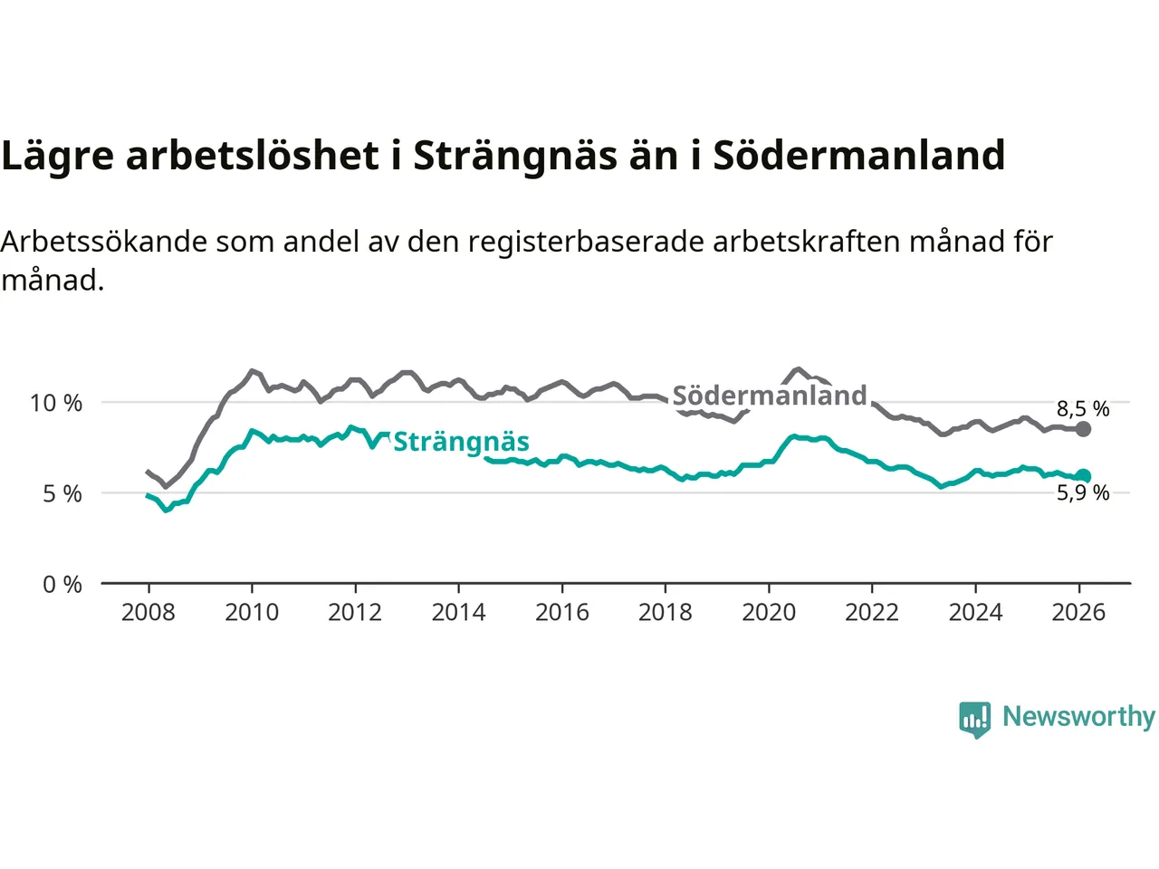 Strängnäs hade redan tidigare lägre arbetslöshet än snittet i hela Södermanlands län och nu växer klyftan (5,9 procent i kommunen, jämfört med 8,5 procent i hela länet). Trosa har den lägsta arbetslösheten i länet (3,5 procent), medan Eskilstuna har den högsta (10,7 procent). För att Strängnäs skulle komma ner i samma arbetslöshetsnivå som Trosa skulle 456 personer behöva sysselsättas.