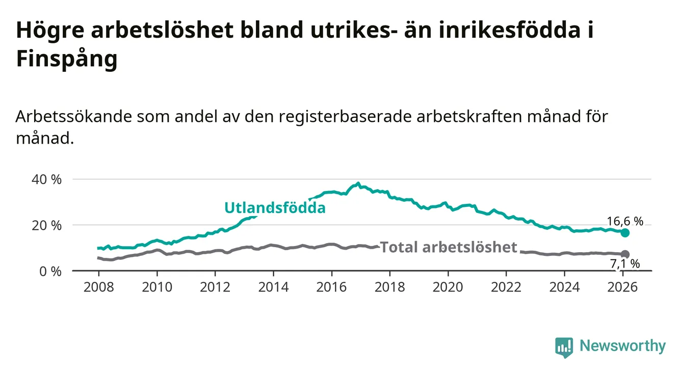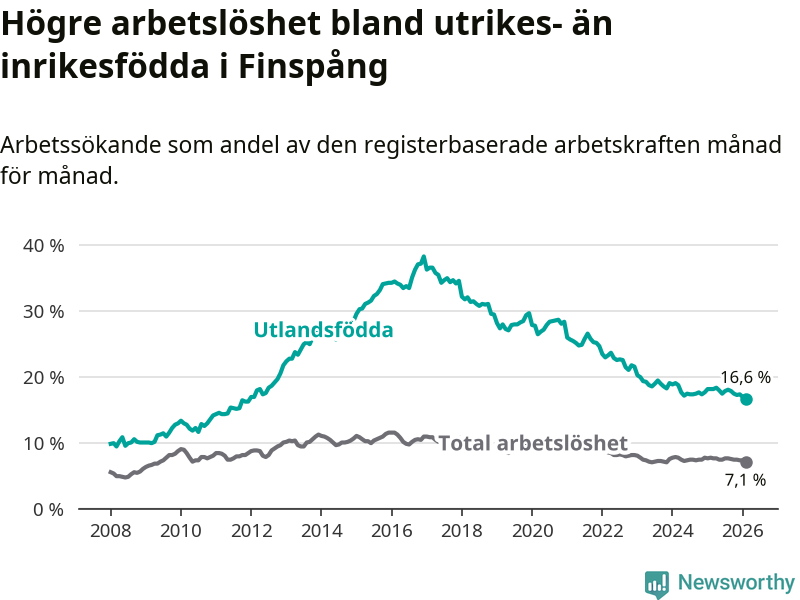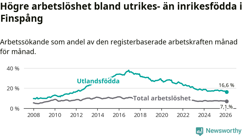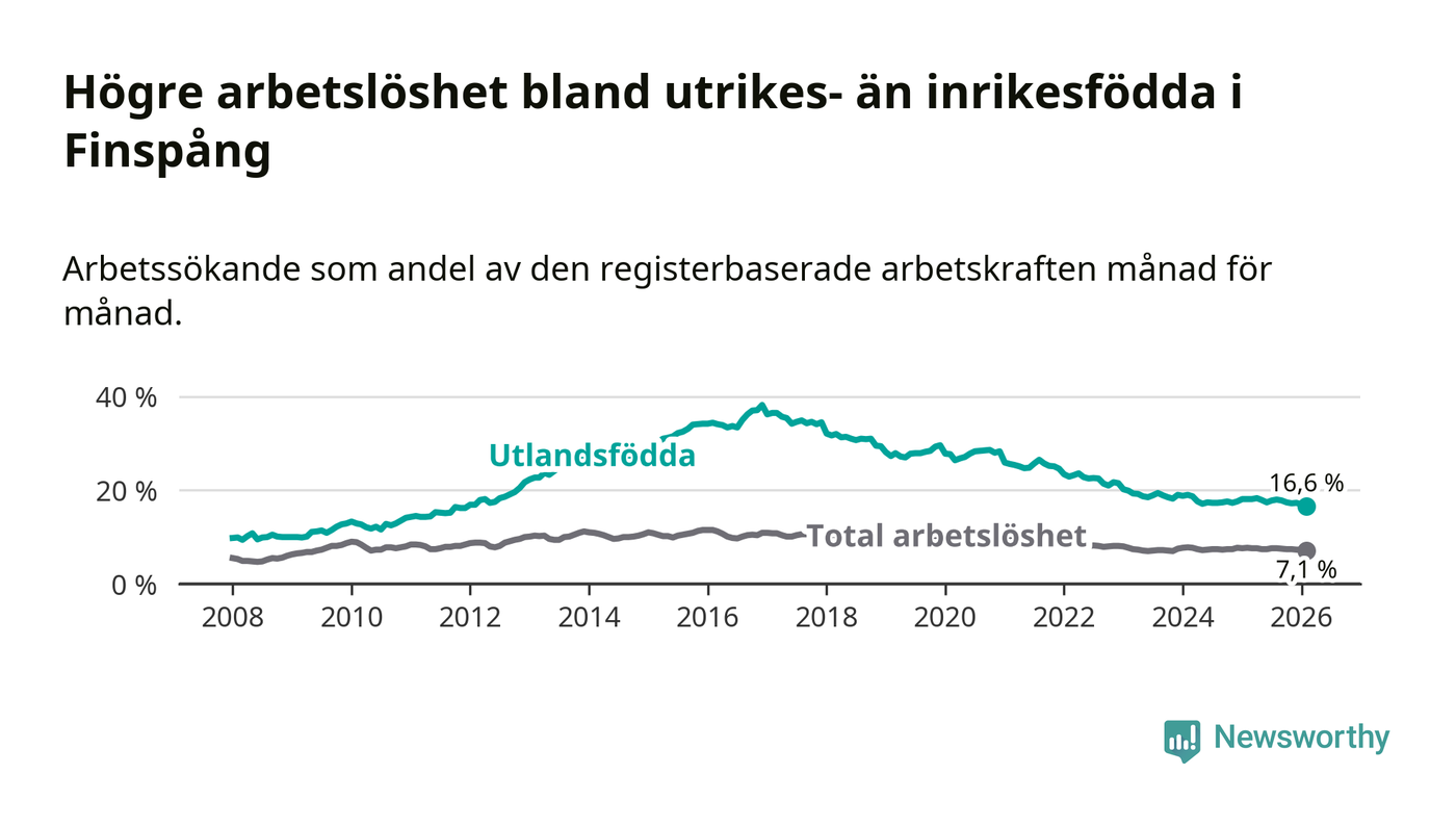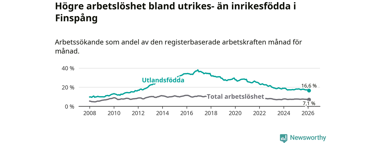 Skillnaden i arbetslöshet mellan utrikesfödda och hela befolkningen är 9,5 procentenheter i Finspång. Det är en mindre skillnad än för ett år sedan (−0,9 procentenheter).