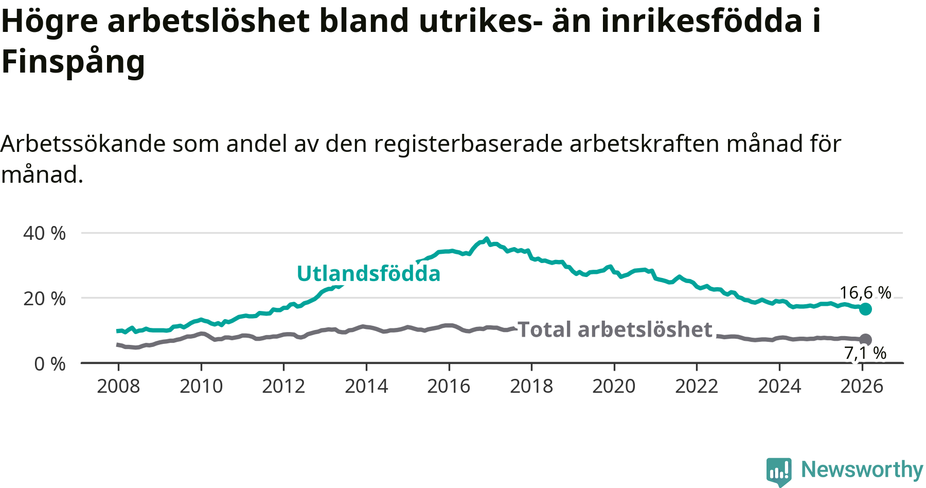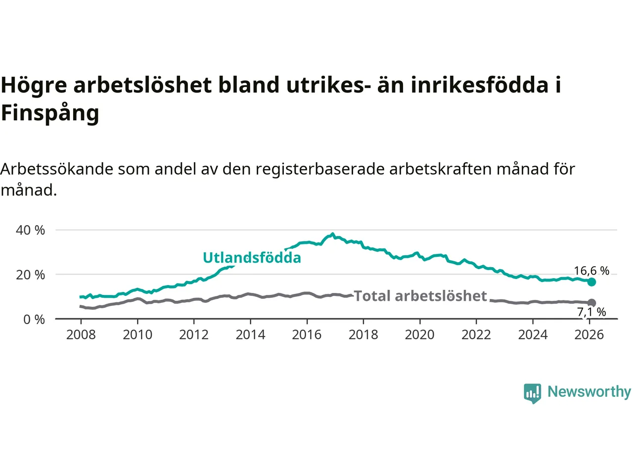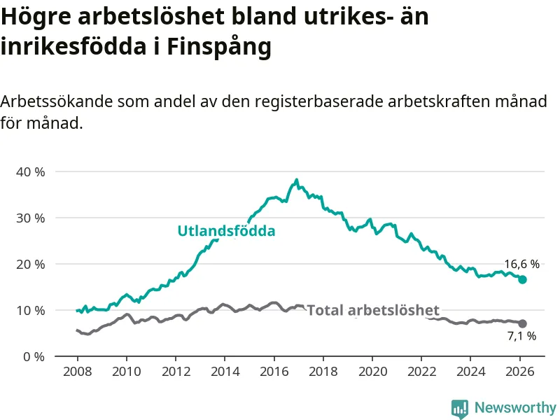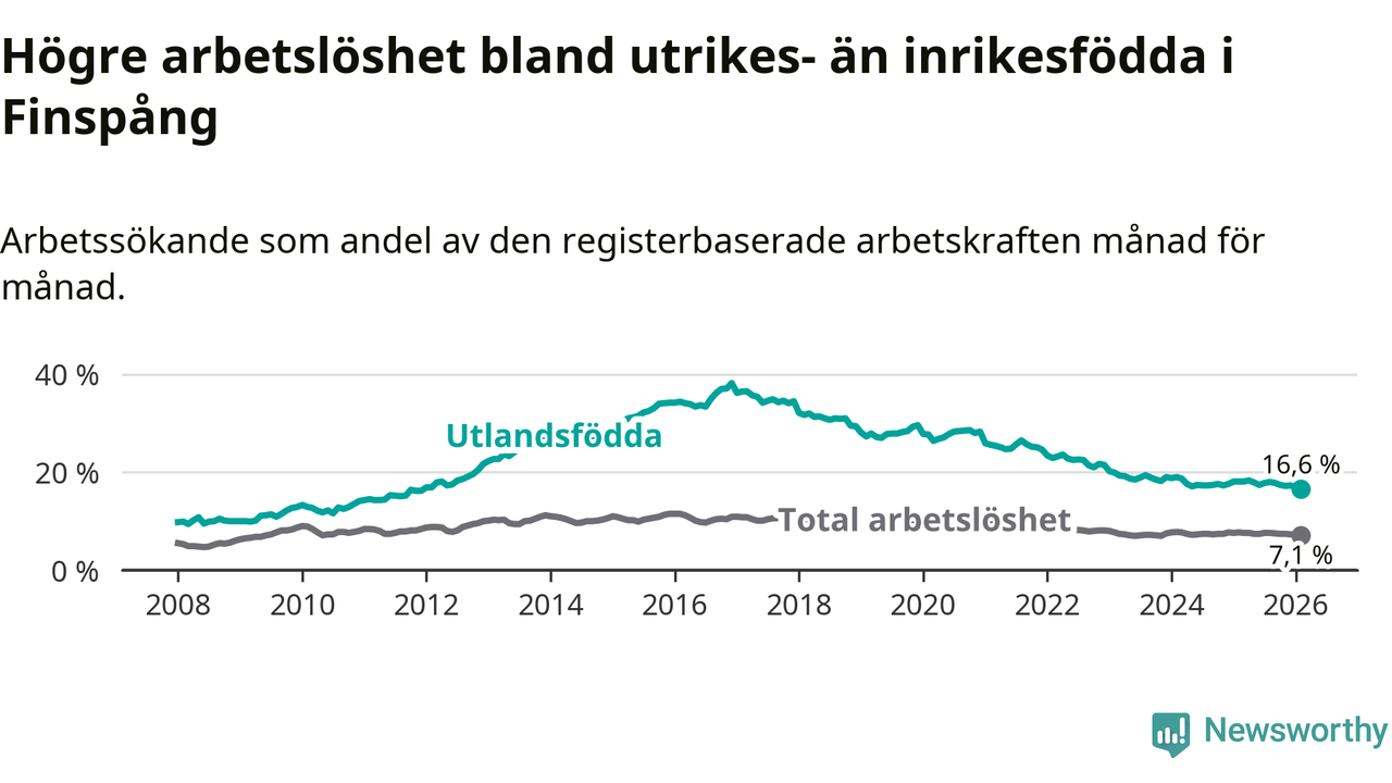 Skillnaden i arbetslöshet mellan utrikesfödda och hela befolkningen är 9,5 procentenheter i Finspång. Det är en mindre skillnad än för ett år sedan (−0,9 procentenheter).