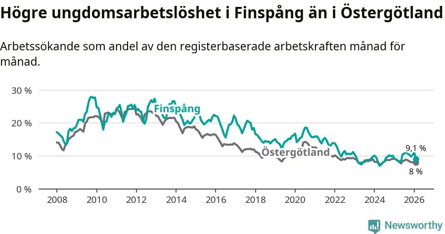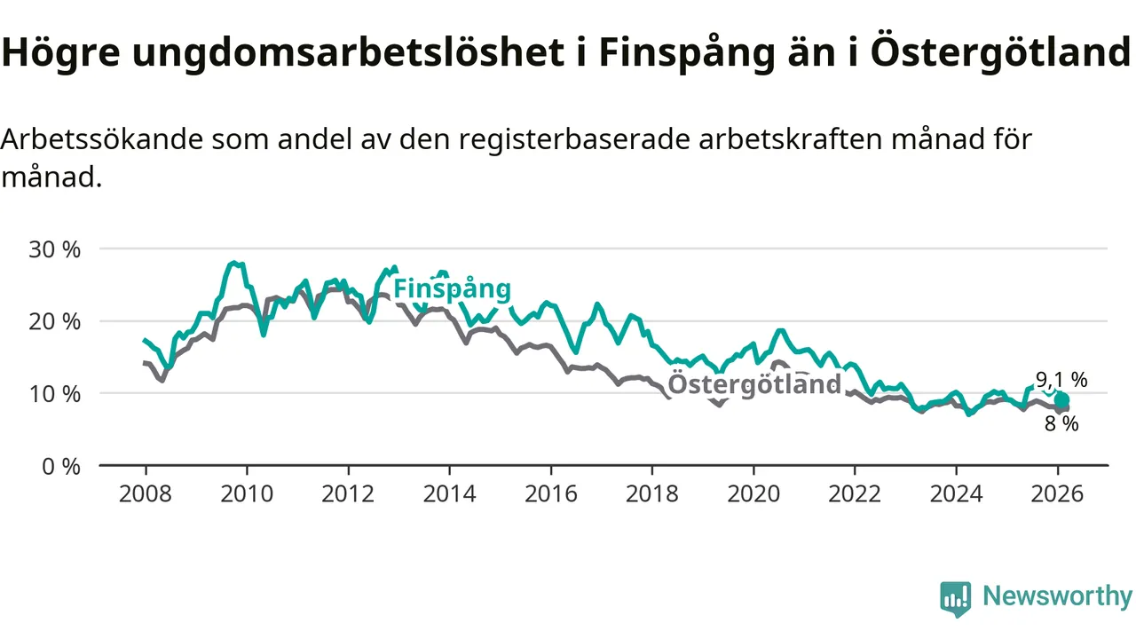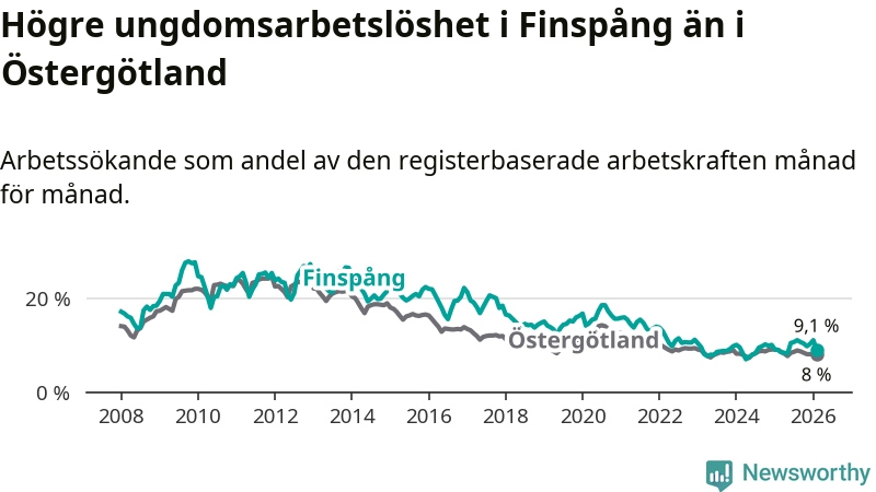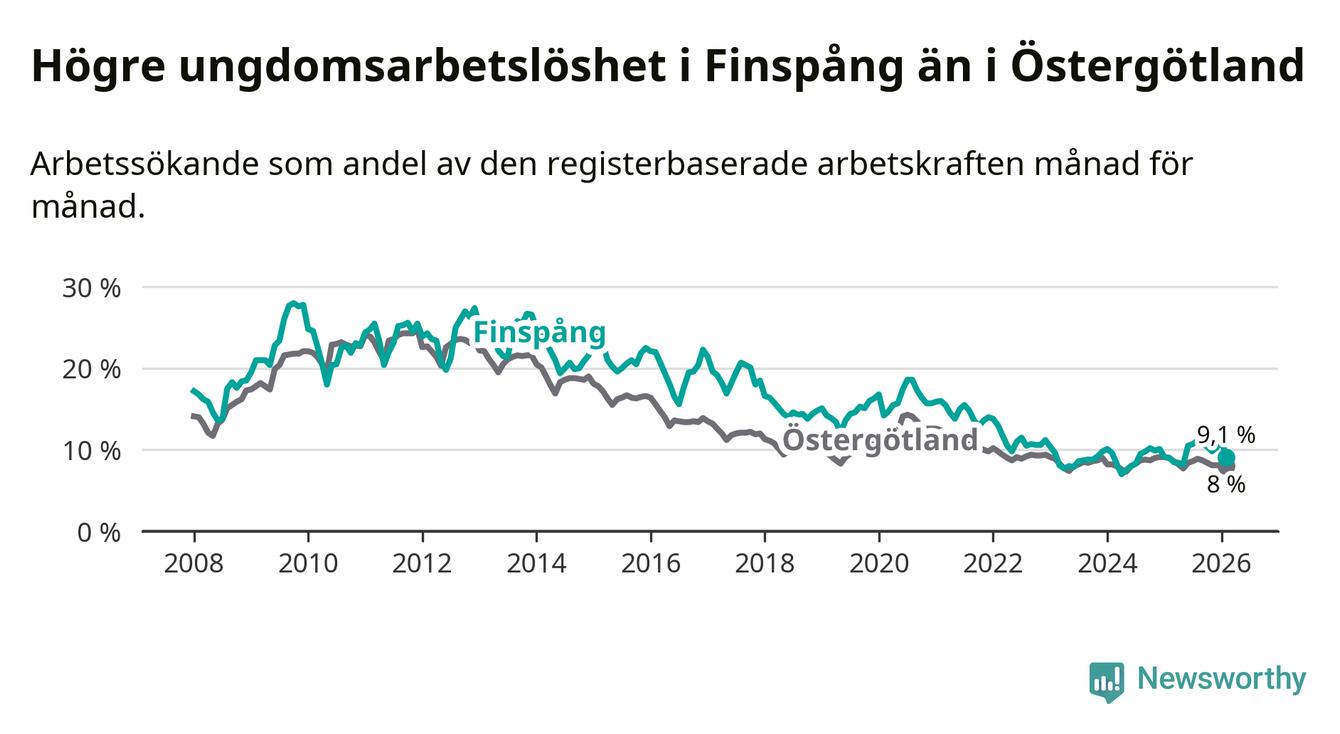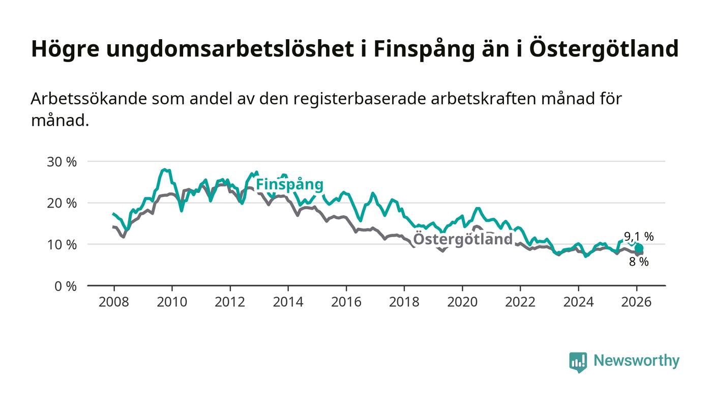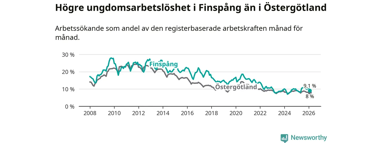 Medan Finspång har ungefär samma total arbetslöshet som Östergötland, ligger ungdomsarbetslösheten 1,1 procentenheter högre i Finspång.