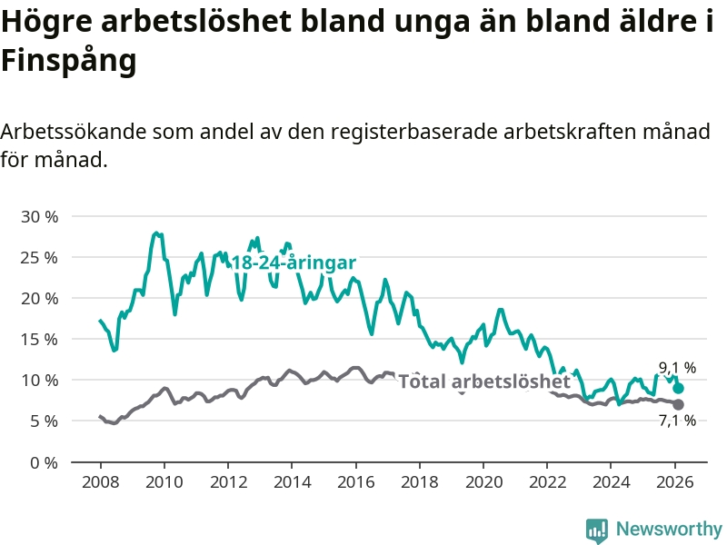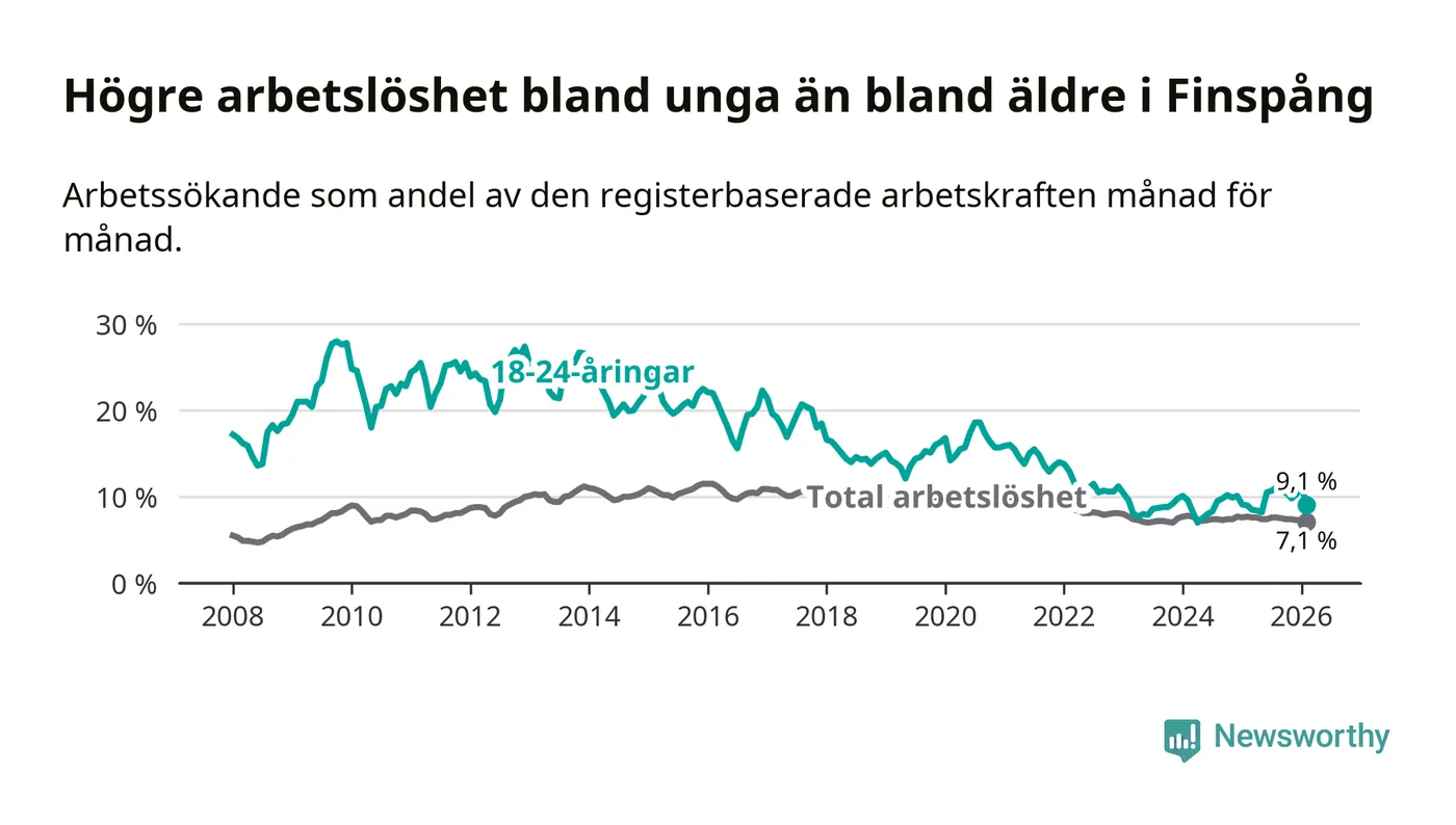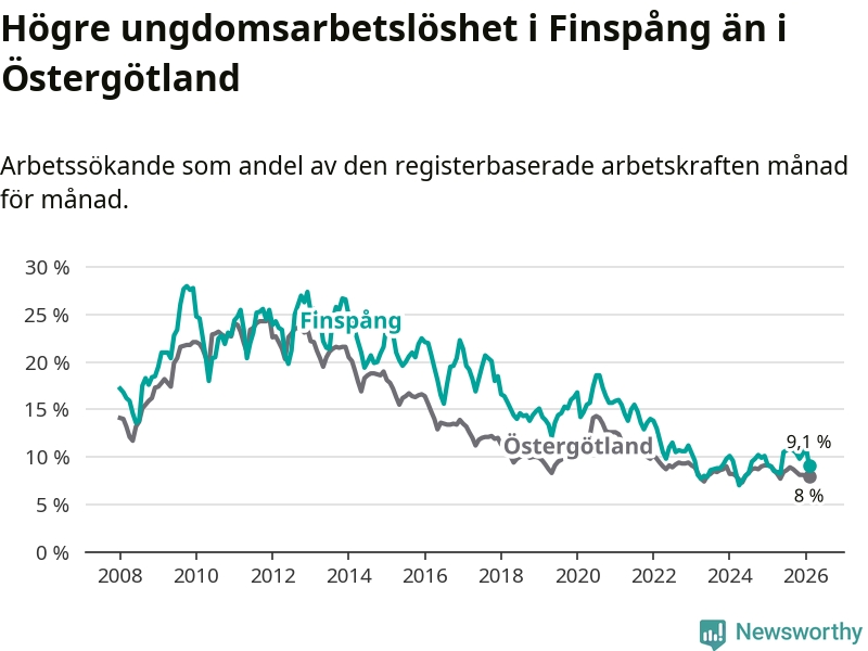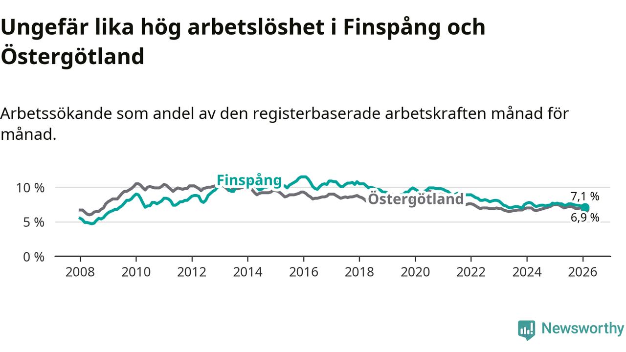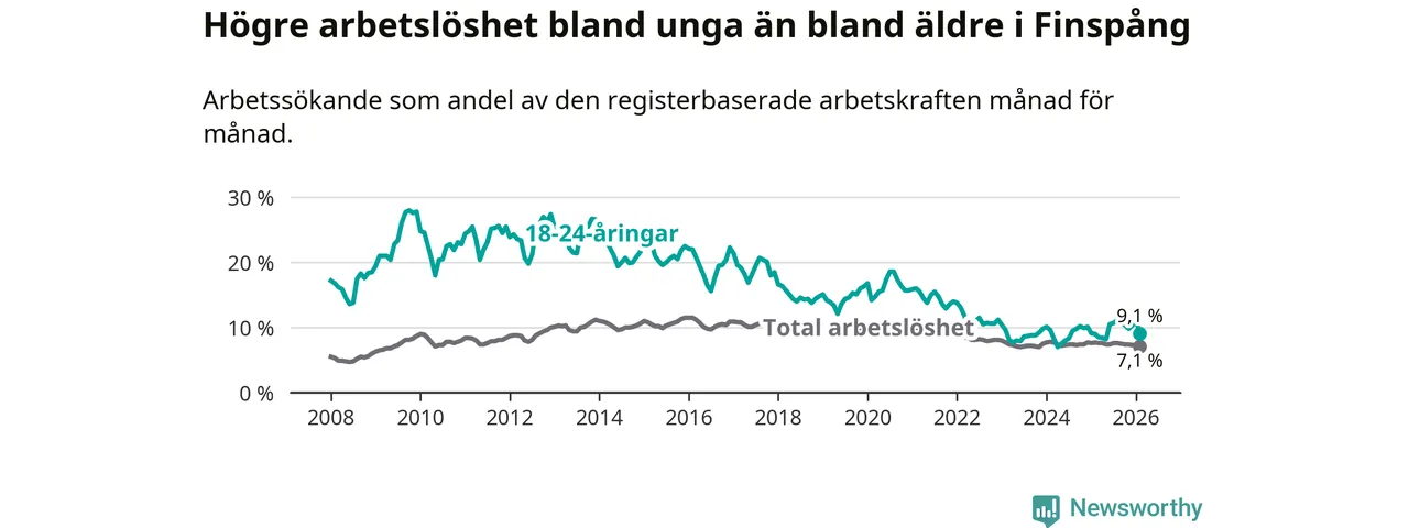 Medan Finspång har ungefär samma total arbetslöshet som Östergötland, ligger ungdomsarbetslösheten 1,1 procentenheter högre i Finspång.