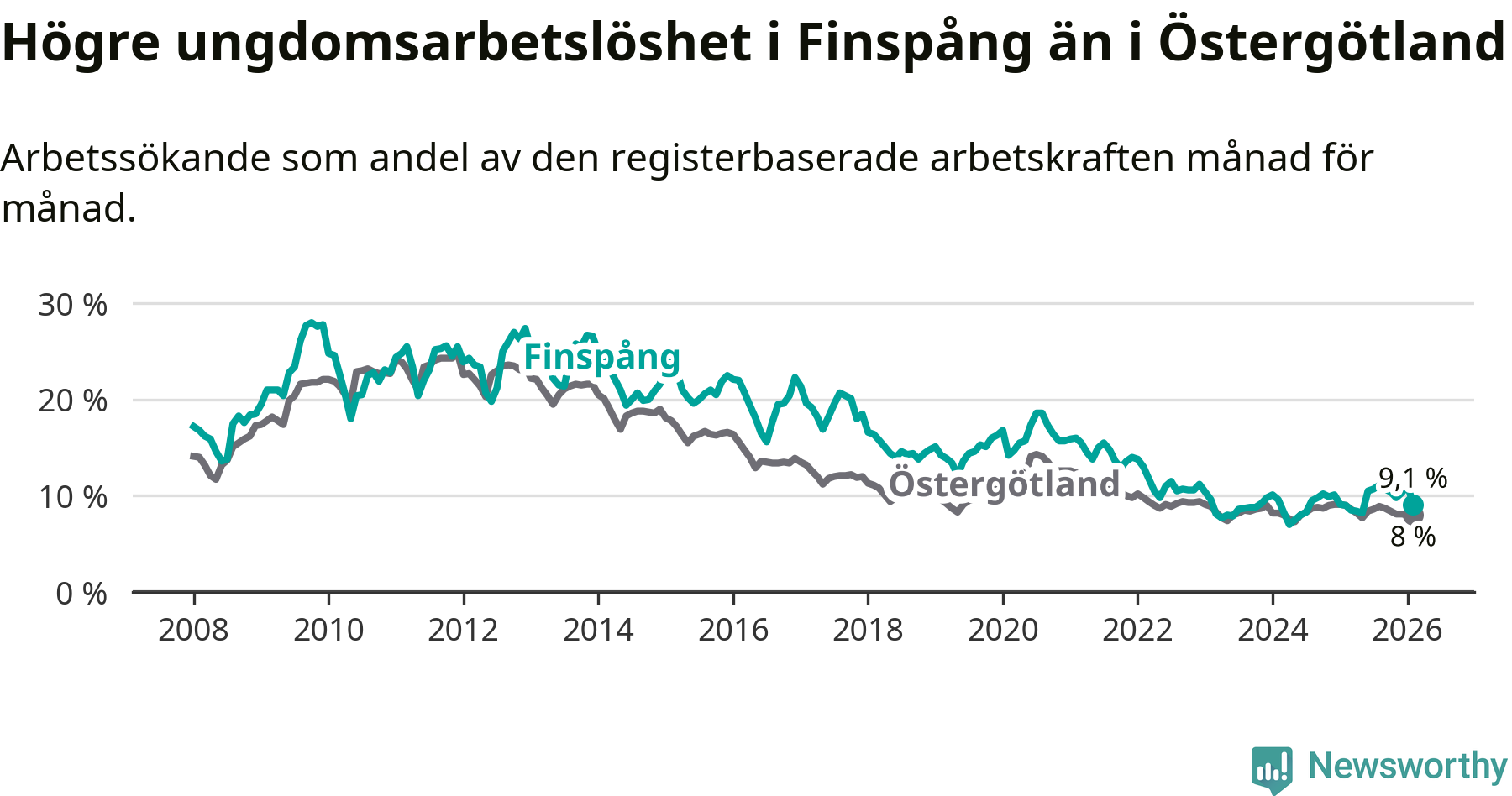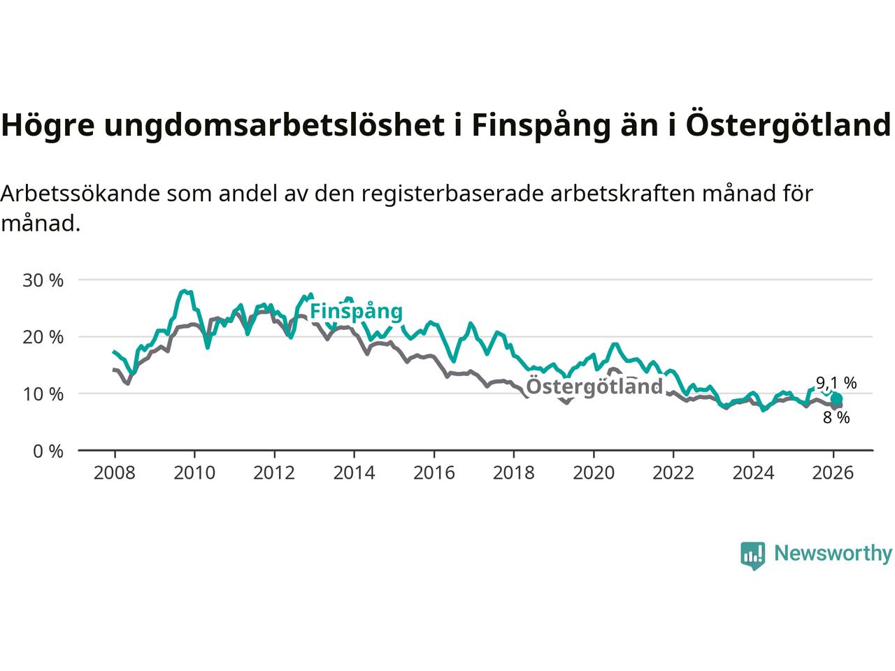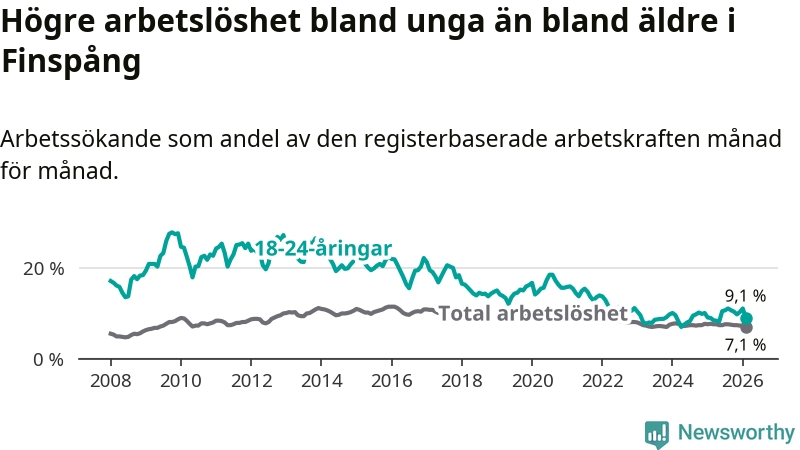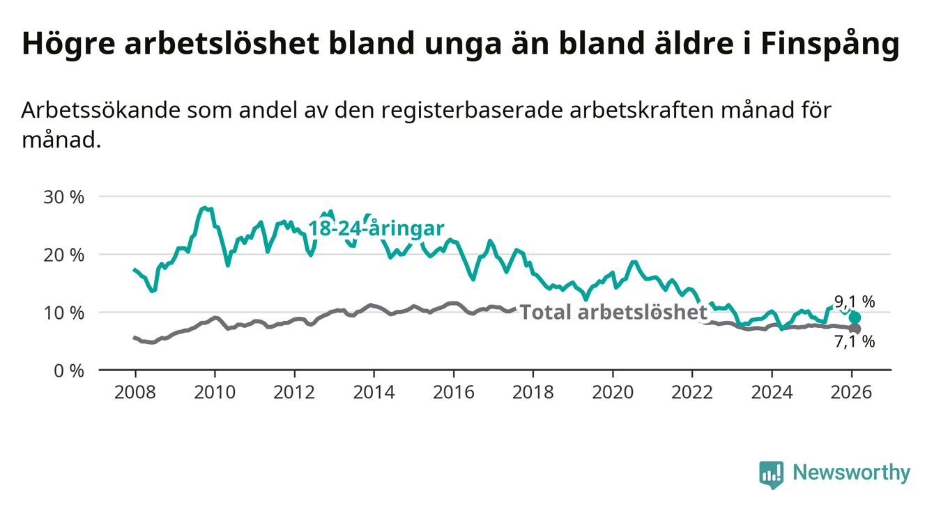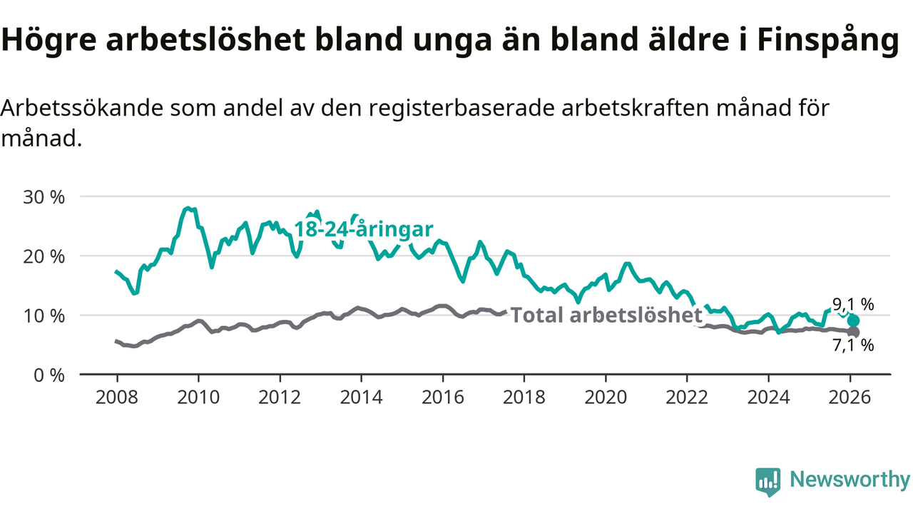 Medan Finspång har ungefär samma total arbetslöshet som Östergötland, ligger ungdomsarbetslösheten 1,1 procentenheter högre i Finspång.