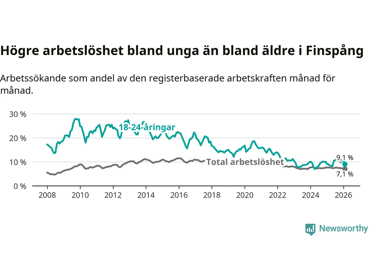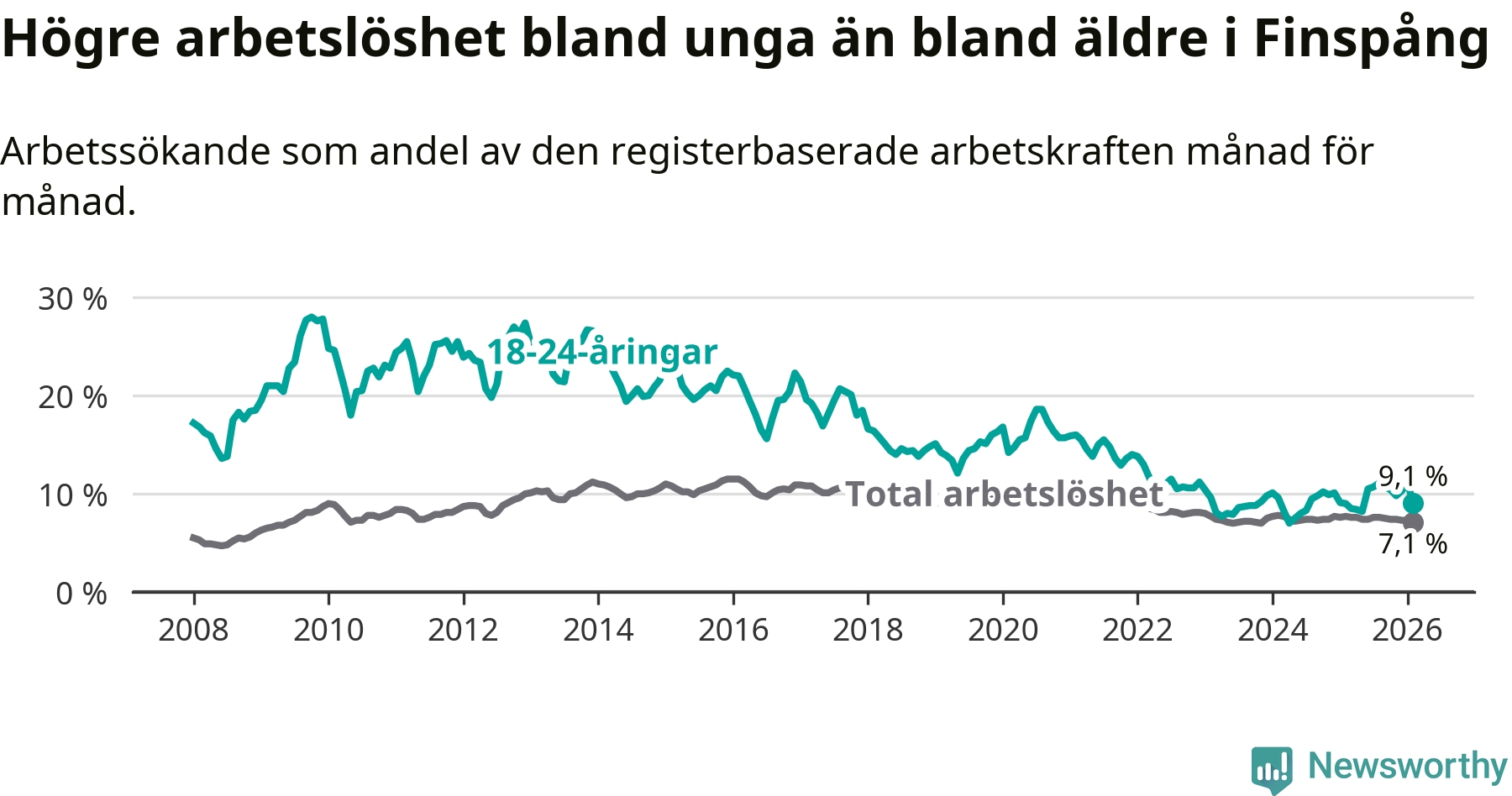 Till skillnad från den totala arbetslösheten stiger arbetslösheten bland unga (+0,1 procentenheter). I februari var 9,1 procent av 18–24-åringarna inskrivna som arbetssökande (motsvarande 83 personer). Mäter vi antalet inskrivna ser vi en minskning med två personer på ett års sikt.